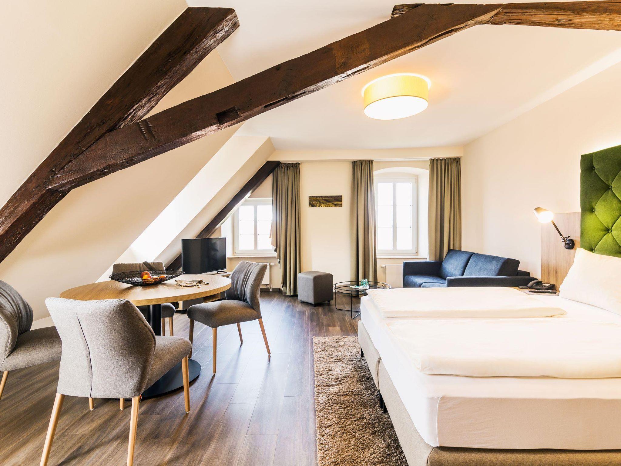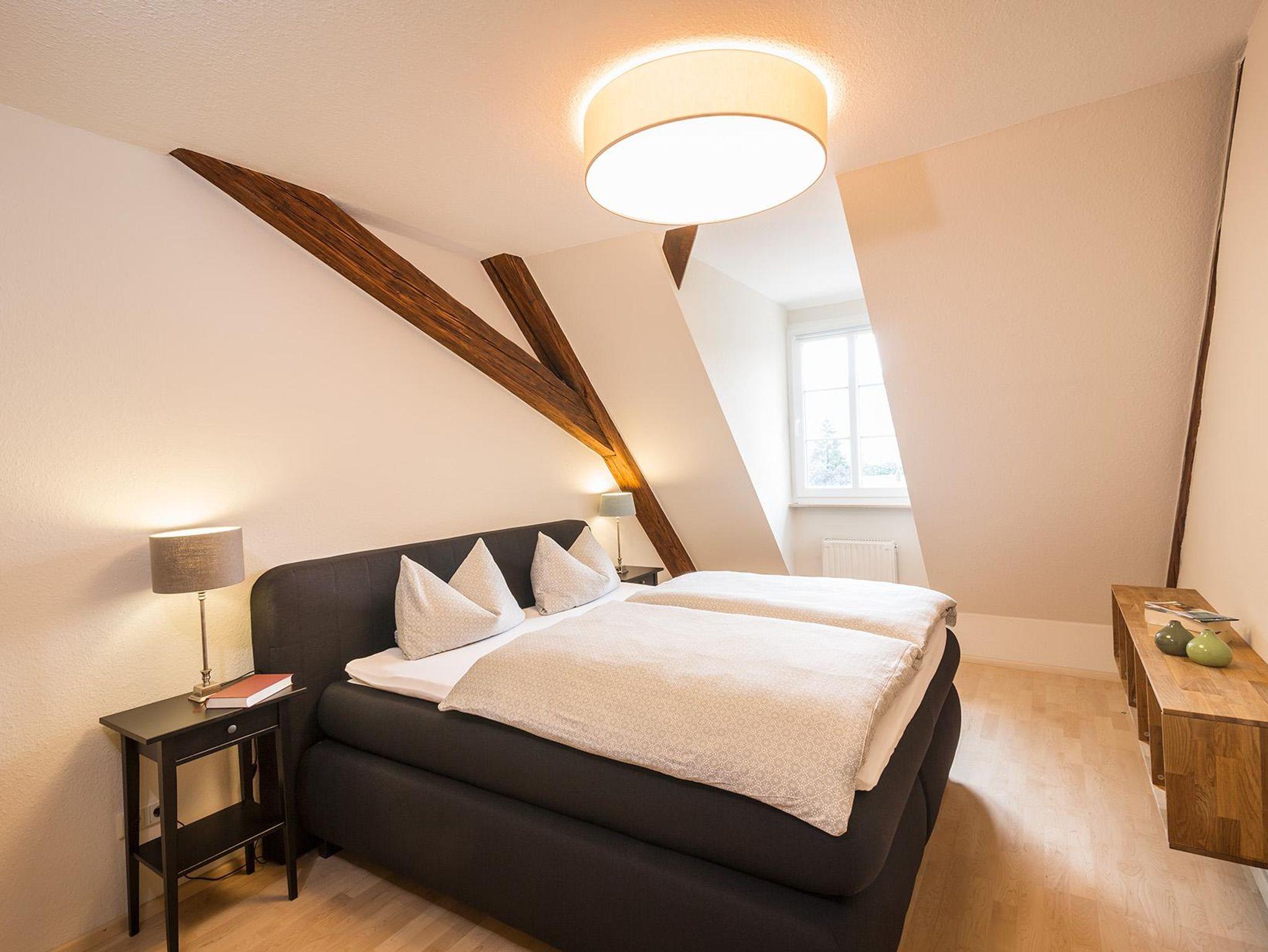 Das kleinere, kuschelige Doppelzimmer mit Dachschräge verfügt über ein 1,60 m großes Boxspringbett, Sat-TV, Telefon, Kühlschrank, Wasserkocher und kostenfreies W-Lan. Das Badezimmer ist mit einer Dusche/Wc und Haartrockner ausgestattet.