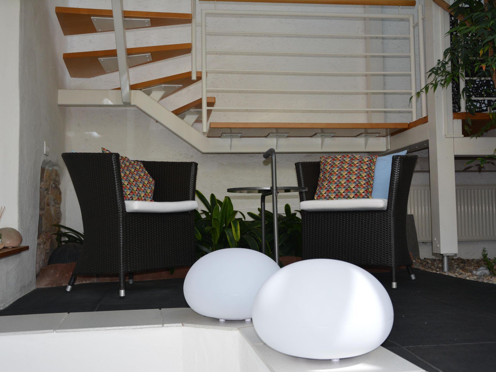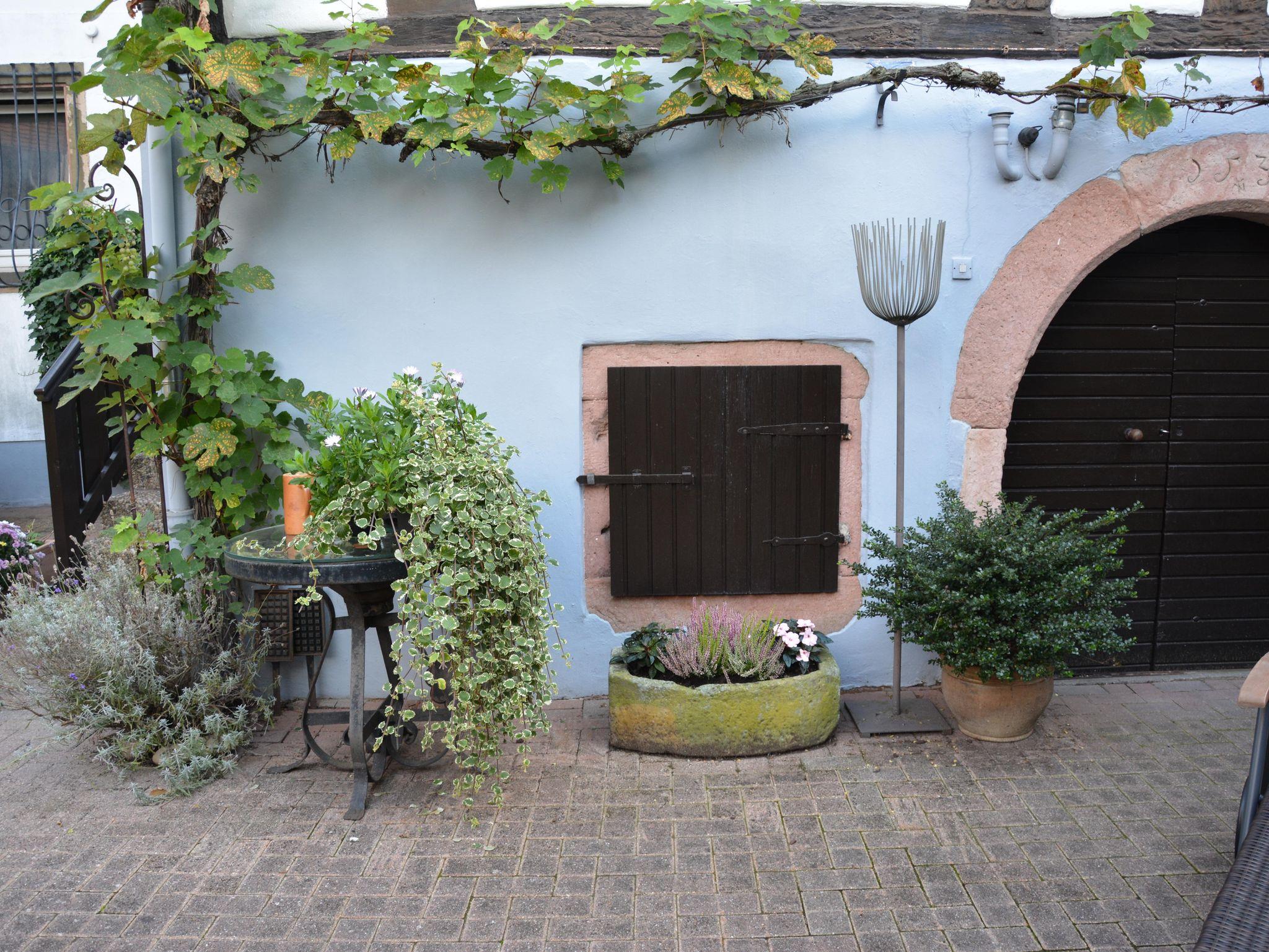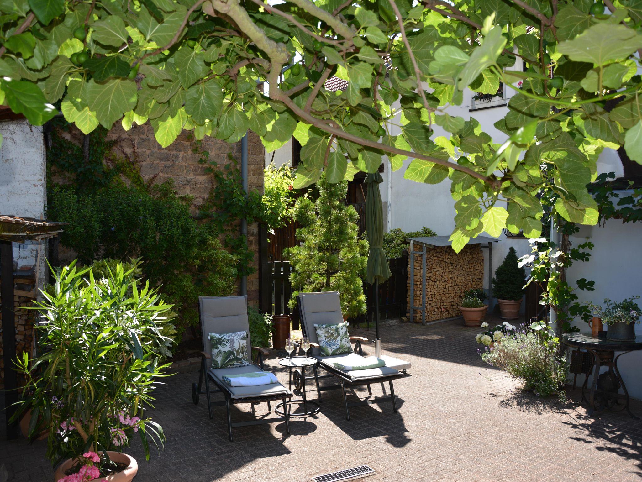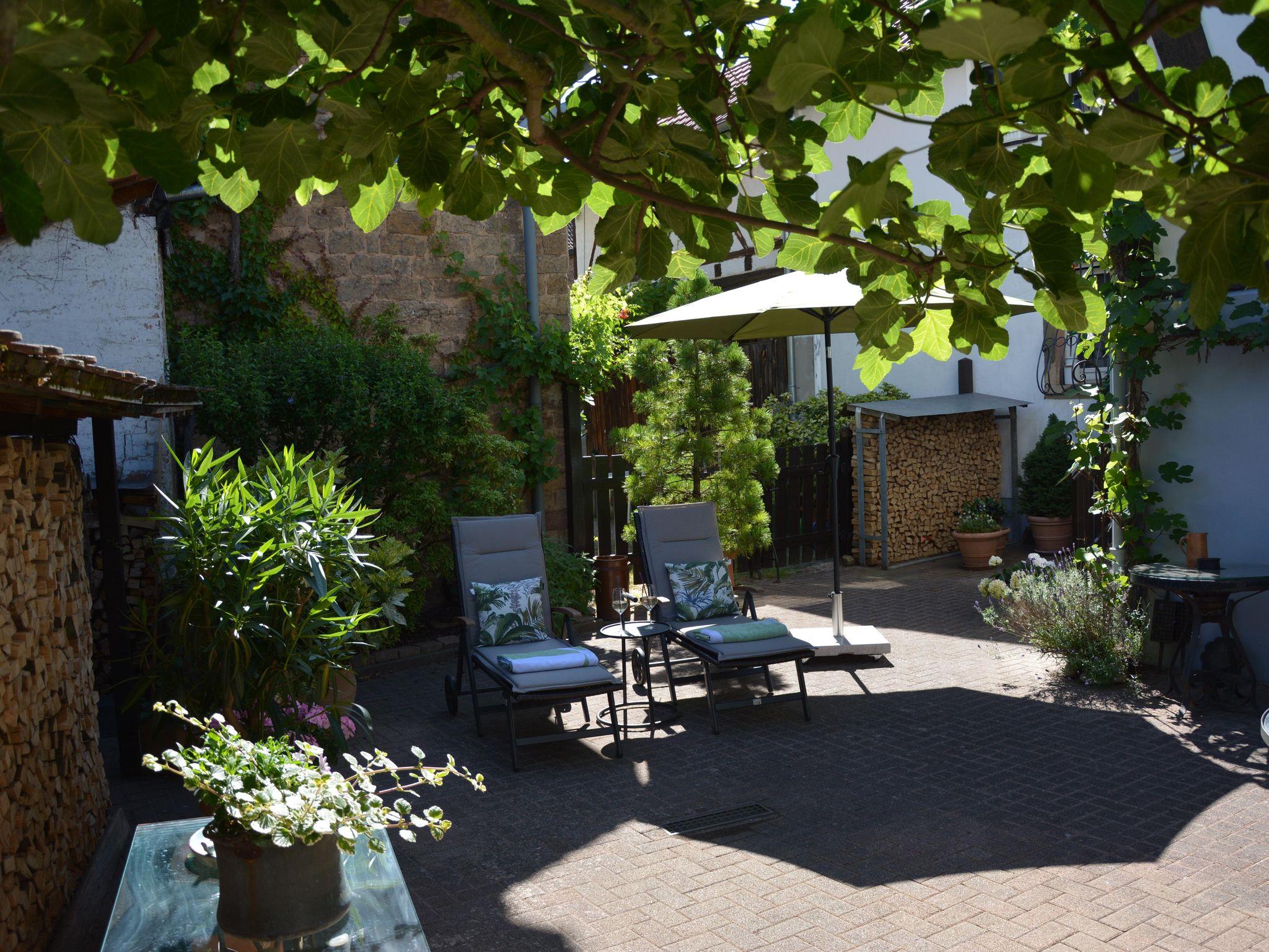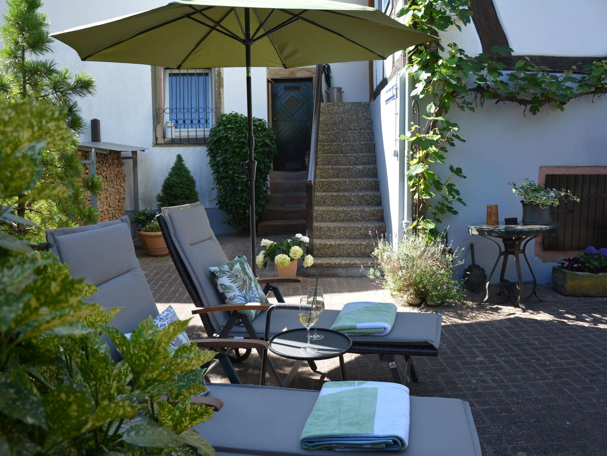Besonderen Genuss bietet der direkte Blick auf das historisch bedeutende Hambacher Schloss, das in der Ferne thronend die Atmosphäre der Region prägt. Der hübsche Innenhof mit viel Charme ist der perfekte Ort, um die Seele baumeln zu lassen. Ob Sie die Natur auf den Wanderwegen oder Radwegen erkunden, die umliegenden Weinberge besuchen oder einfach die Stille genießen möchten, diese Oase ist ideal für Familien, Einzelreisende und Geschäftsreisende.