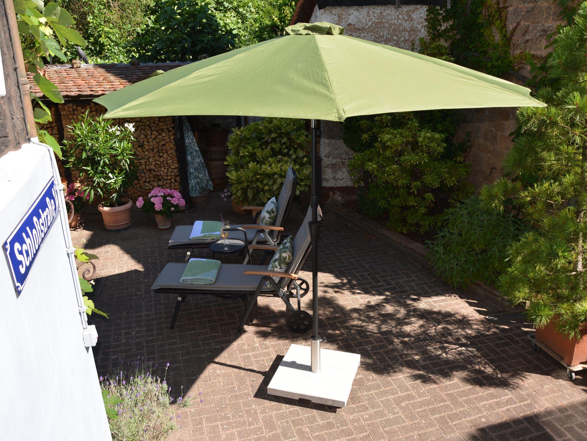 • Sonnenschirme und Liegestühle im Innenhof