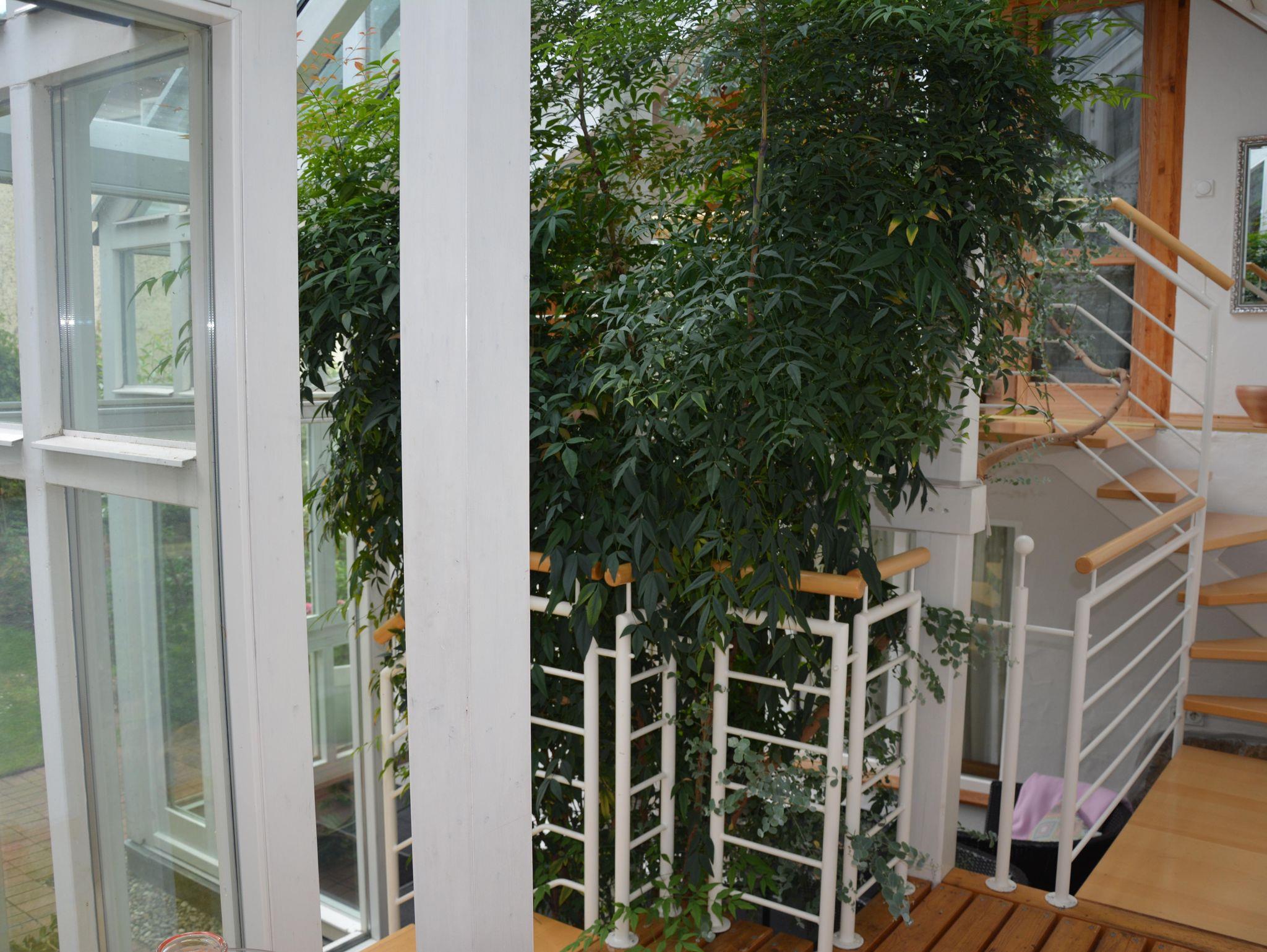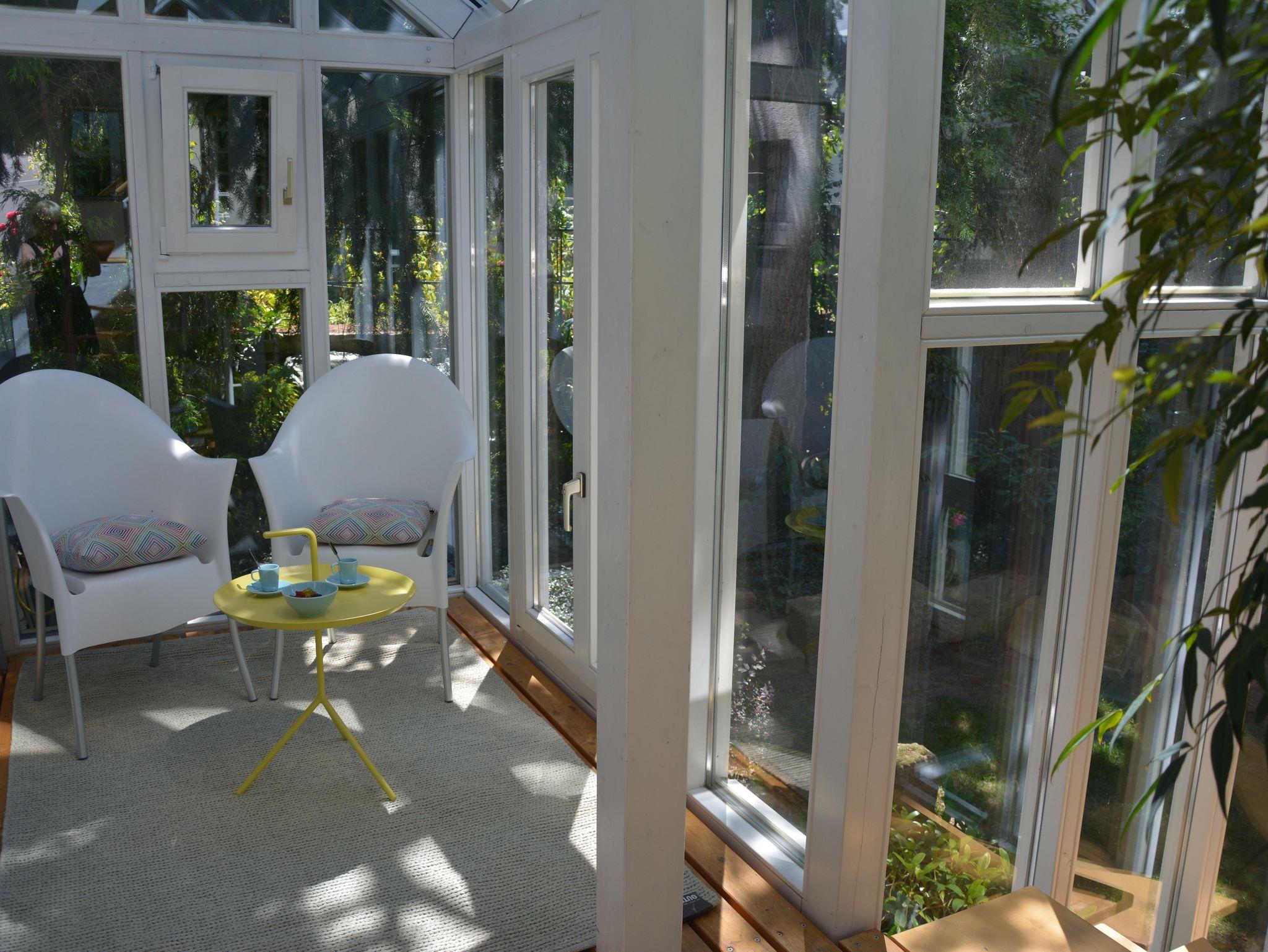 Der angegliederte Wintergarten bietet verschiedene Sitzbereiche und gewährt einen direkten Blick auf das historische Hambacher Schloss.