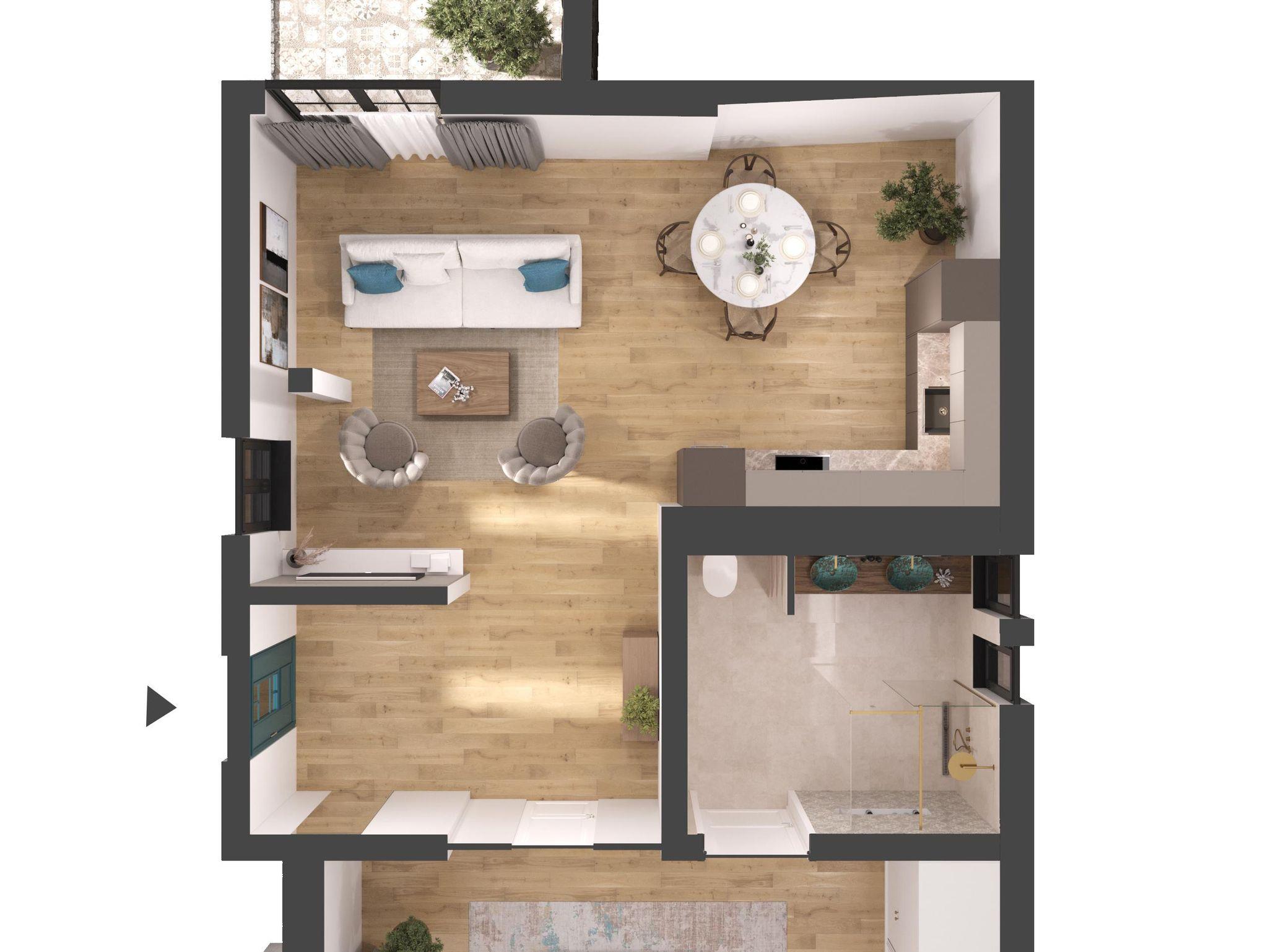 Das entsprechend geräumige und gemütliche Wohnzimmer mit einer voll ausgestatteten und unterfahrbaren Küche läd zum Verweilen ein und führt direkt zu Ihrer ganz privaten Terrasse, die genügend Sitz- und Sonnenmöglichkeiten bietet und den Blick auf den großen Garten richtet. Ein perfekter Ort, um dem hektischen Alltag zu entfliehen und Sonne und Energie zu tanken.