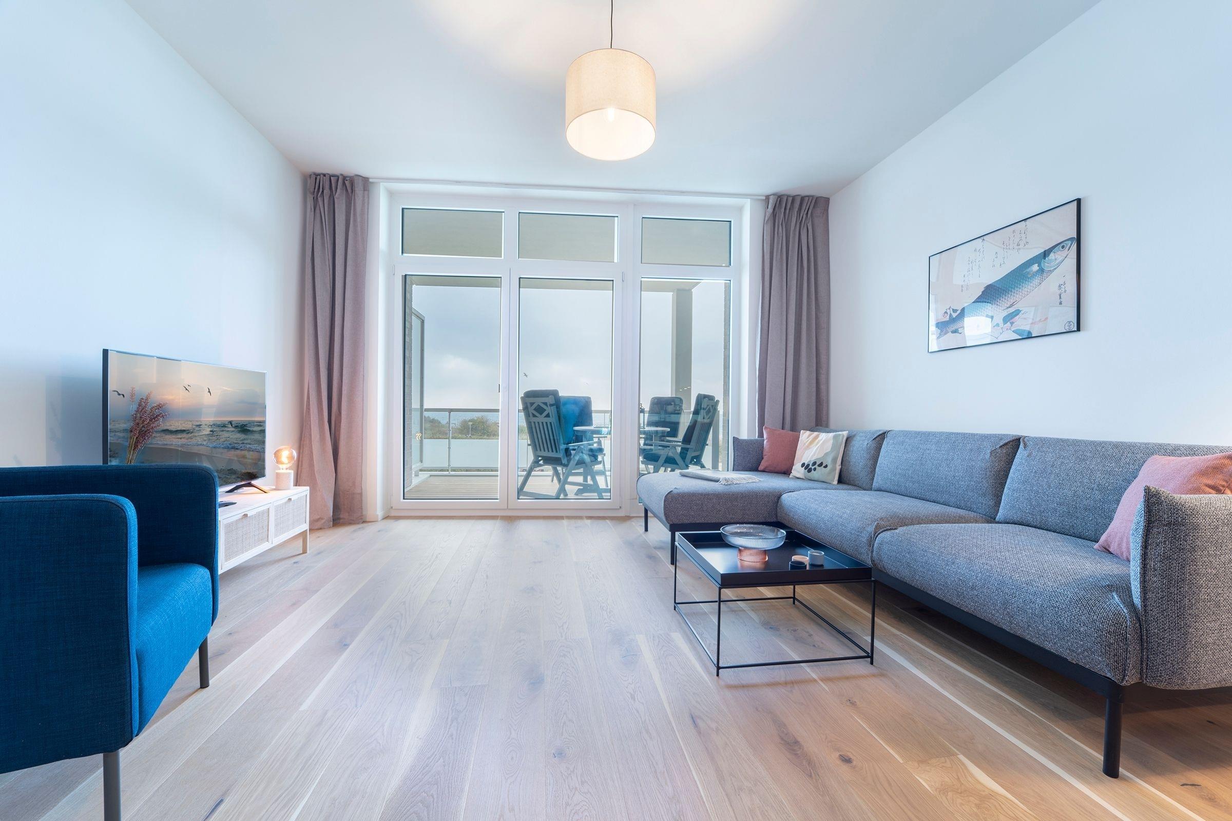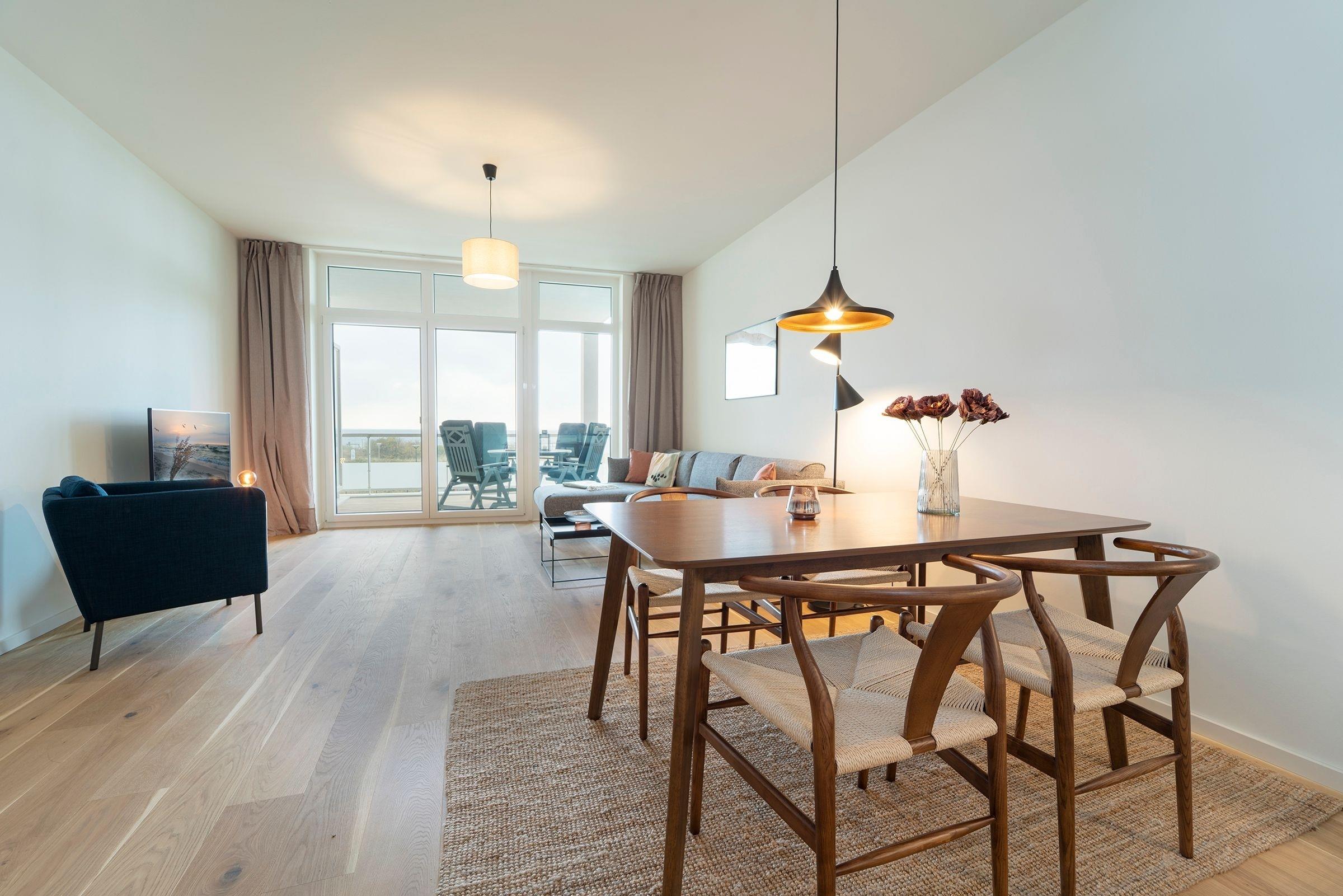 Hier werden Sie sich wohlfühlen! Modern und hell begrüßt Sie das Herzstück der Wohnung - der große, offene Wohnraum mit integrierter, voll ausgestatteter Küche lädt Sie zu einer Auszeit ein. Vom überdachten, möblierten Balkon in Südausrichtung haben Sie freie Sicht auf die Ostsee. Schlafen und entspannen Sie sich im separaten Schlafzimmer mit bequemem Boxspringbett (2x 90x200cm) und Kleiderschrank. Ein zweites Schlafzimmer mit zwei Einzelbetten (je 90x200 cm) sorgt ebenfalls für ruhige Nächte. Außerdem sorgen gleich zwei hochwertig ausgestattete Badezimmer mit bodengleicher Dusche für Entschleunigung am Morgen - eines davon sogar mit Badewanne.