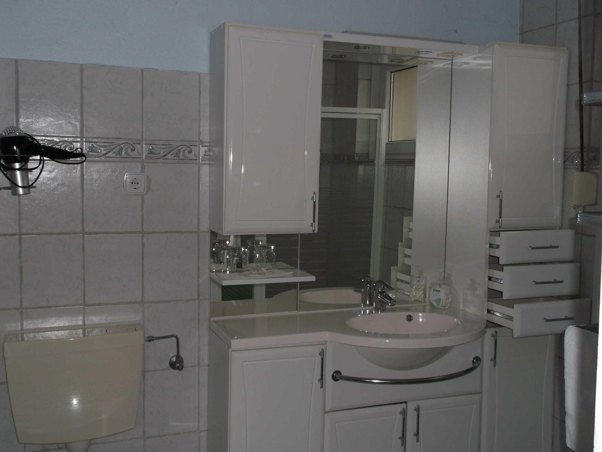 2-Zimmer-Wohnung im Erdgeschoss, ca. 50 m², mit Laminatfußboden. Das Wohnzimmer verfügt über eine gemütliche Sitzecke mit SAT-TV. Das Duschbad ist mit einer ebenerdig gefliesten Dusche auch für ältere und gehbehinderte Menschen gut geeignet. Separate Küche mit Einbauküche (Mikrowelle) mit Essplatz und Waschmaschine. Das Schlafzimmer ist mit Ehebett und Kleiderschrank eingerichtet.