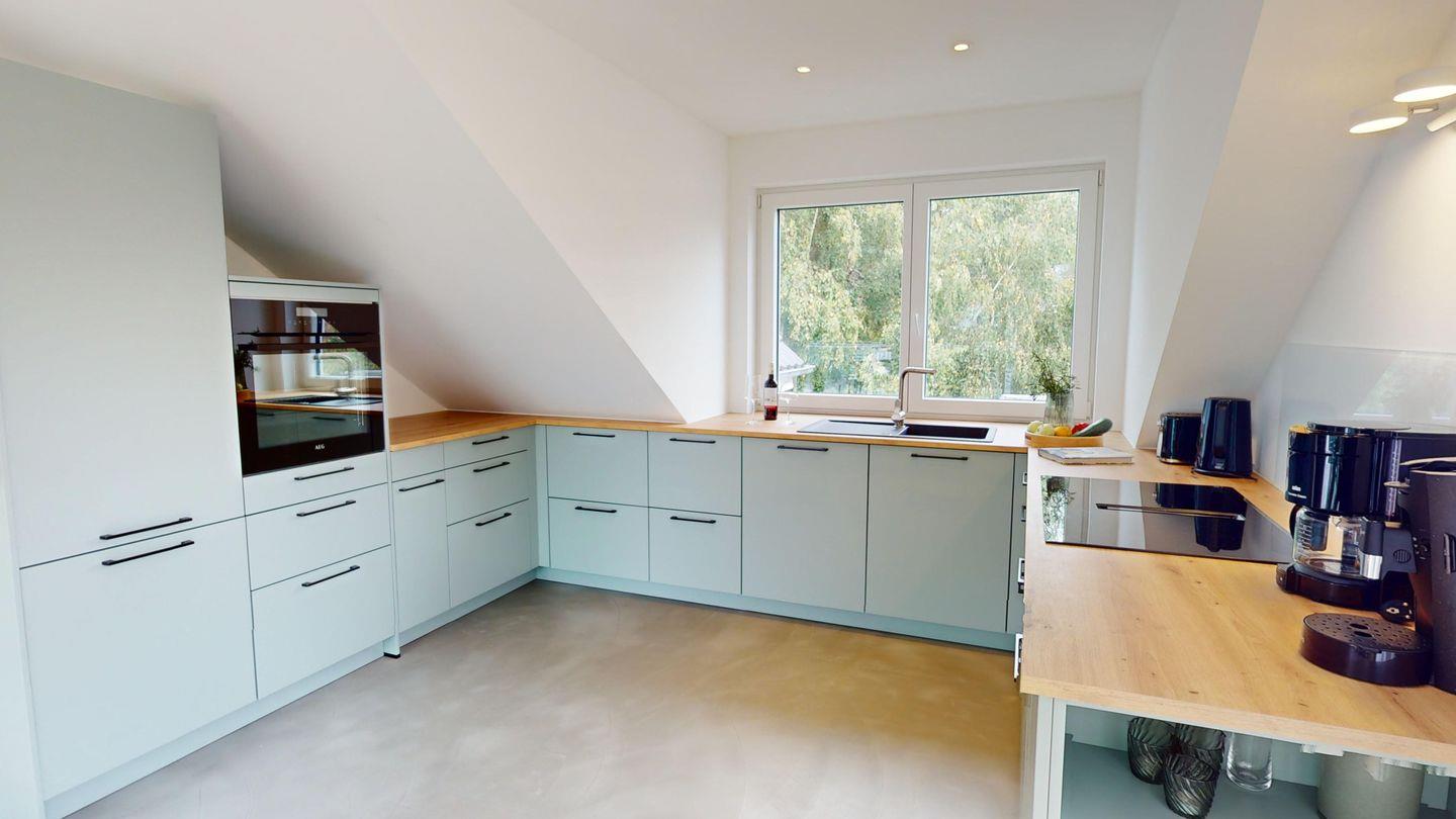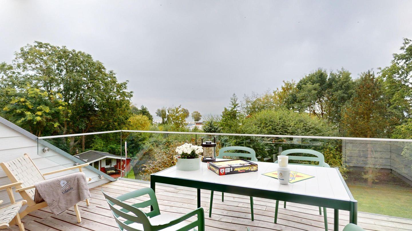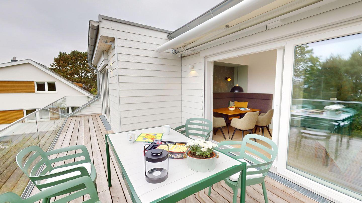 Die große Dachterrasse in Südlage verspricht herrliche Sonnenstunden und eine große elektrische Markise sorgt bei Bedarf für kühlen Schatten. Der Ausblick geht in ein angrenzendes Biotop und den großen Garten, der von Ihnen mitbenutzt werden kann. Im Winter geben die unbelaubten Bäume den Blick auf die Lübecker Bucht frei. Ganz gleich zu welcher Jahreszeit - genießen Sie das Rauschen der Wellen und die erfrischende Brise der Ostsee!