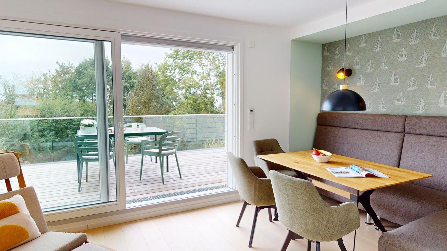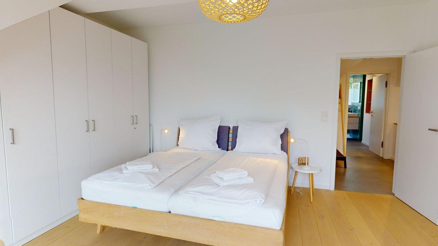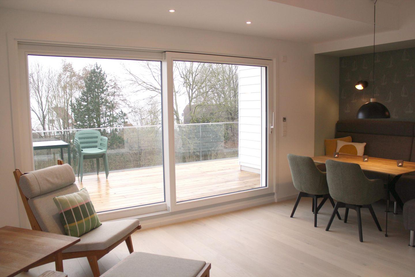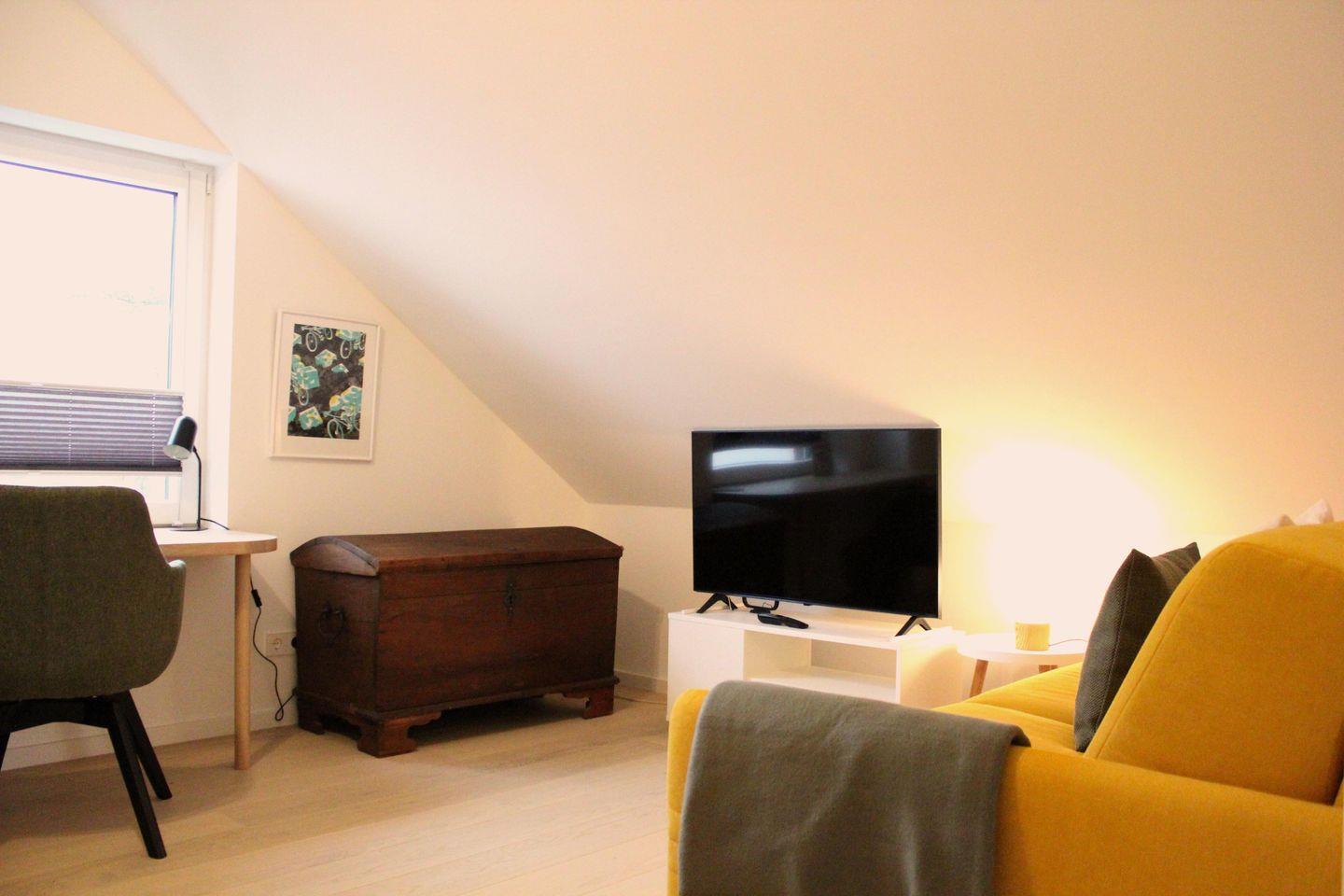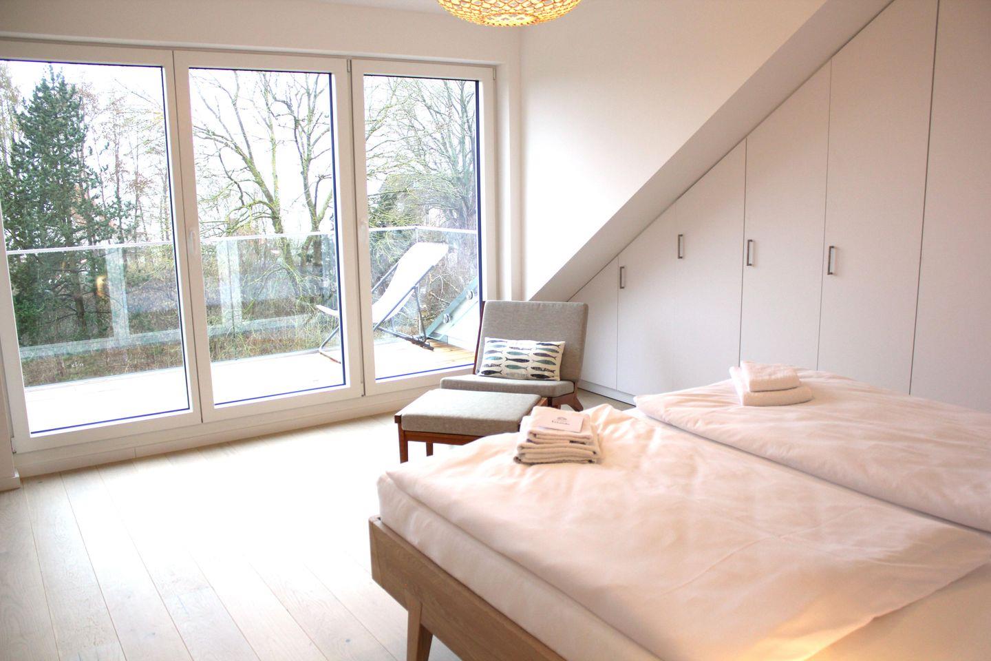 Ein großzügiges Wohnzimmer mit offener Küche und ein modernes Bad mit stufenloser Dusche warten auf Sie. Das Schlafzimmer hat ein komfortables Doppelbett und sorgt für erholsame Nächte. In dem zweiten Schlafzimmer finden Sie eine praktische ausziehbare Couch, die sich tagsüber in eine gemütliche Sitzgelegenheit verwandeln lässt und nachts bequemen Schlafplatz für zwei Personen bietet. Zimmer ist geschmackvoll eingerichtet und bietet ausreichend Stauraum für Ihre persönlichen Dinge.Helles Holzparkett, dänische Designermöbel und große bodentiefe Südfenster verbreiten Urlaubsstimmung. Die Wohnung ist ausgestattet mit einem Glasfaseranschluss, schnellem W-LAN und Smart-TV. Für Home-Office-Freunde gibt es auch einen integrierten Arbeitsplatz. Zusätzlich steht Ihnen im Badezimmer eine Waschmaschine zur Verfügung.