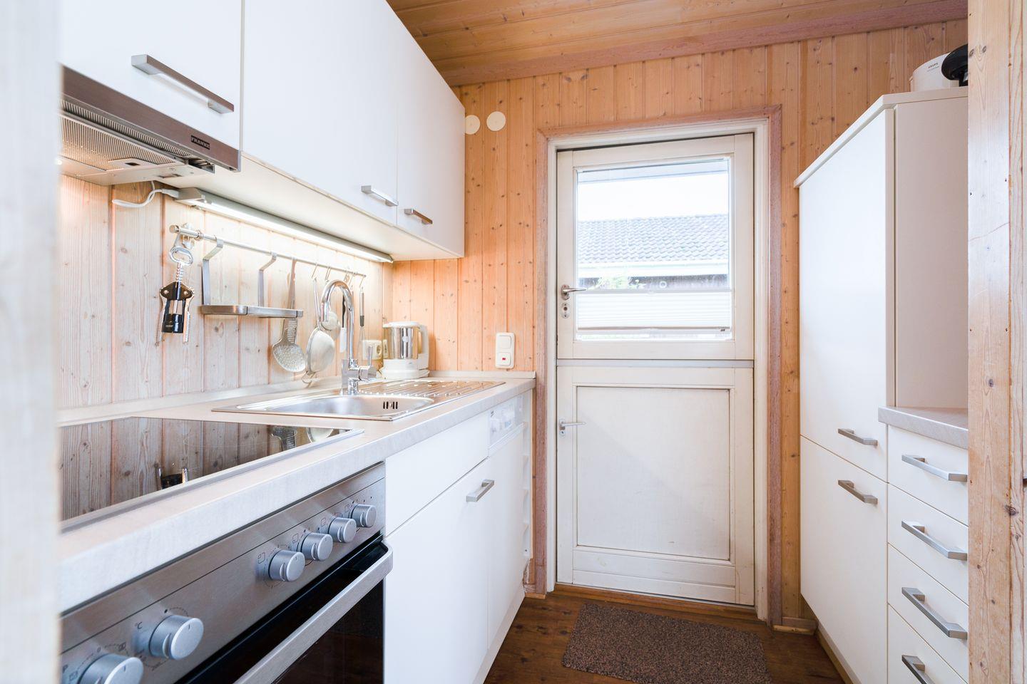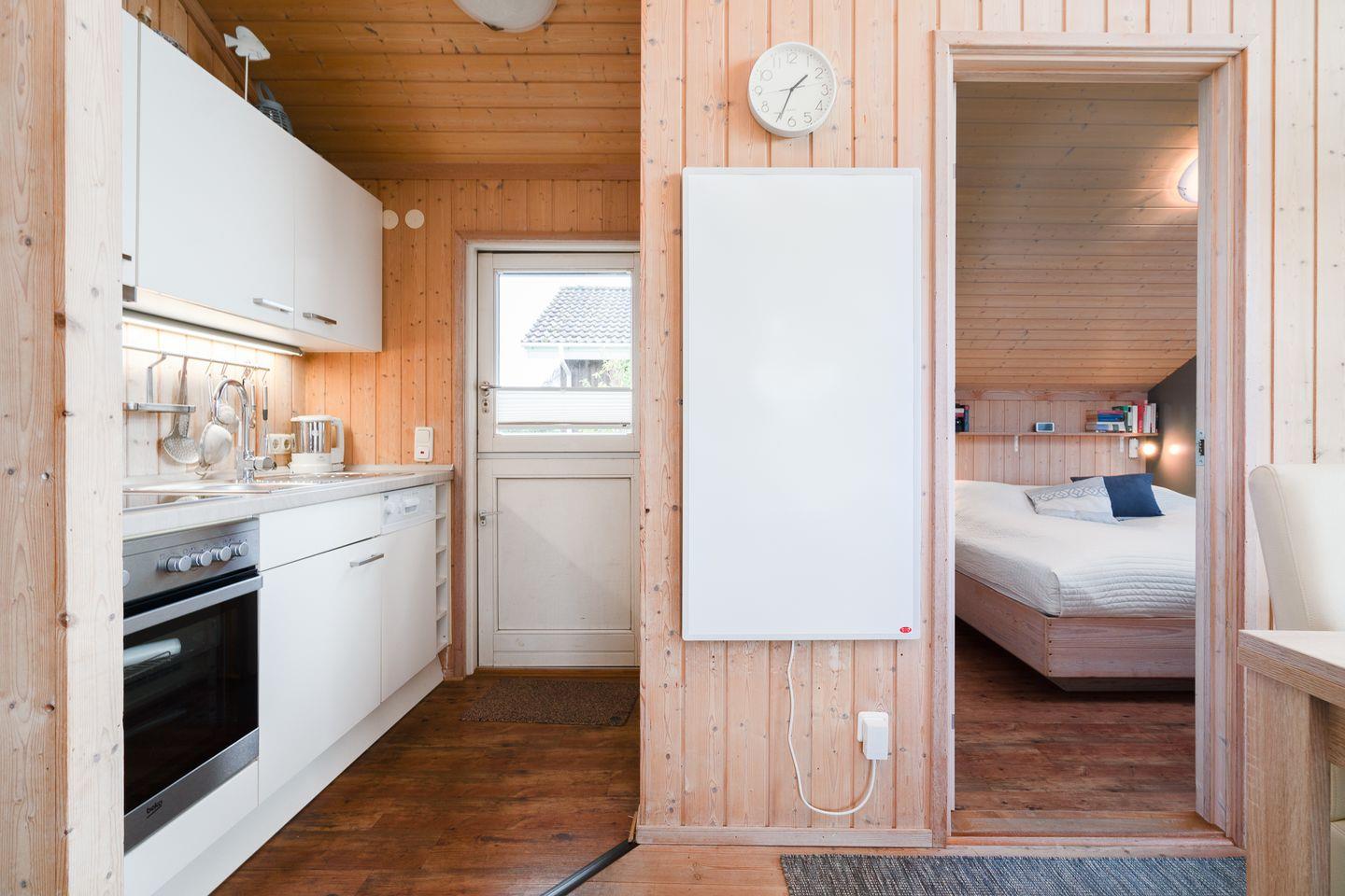 Bis zu vier Personen finden in dem typisch skandinavischen Ferienhaus auf rund 60m² einen Ort der Erholung. Von dem hellen Wohn-/Essbereich mit offener Küche haben Sie eine herrliche Sicht über die Felder und das komfortable und großzügige Sofa lädt zu gemütlichen Fernsehabenden ein. Bei schönem Wetter können Sie die Terrasse in vollen Zügen genießen, während die Kinder draußen genügend Platz zum toben haben.