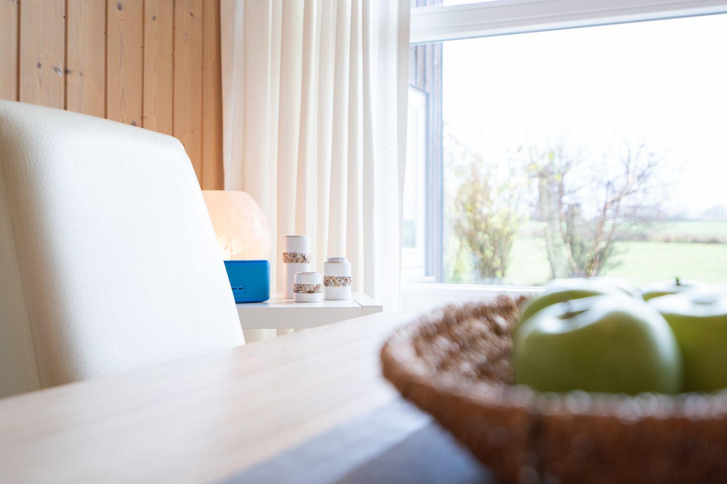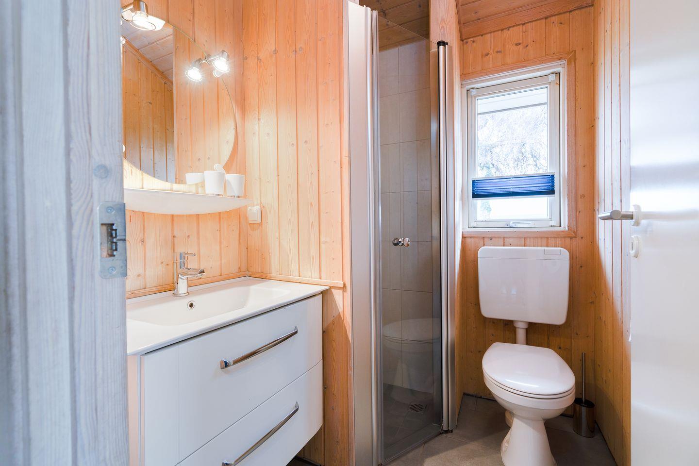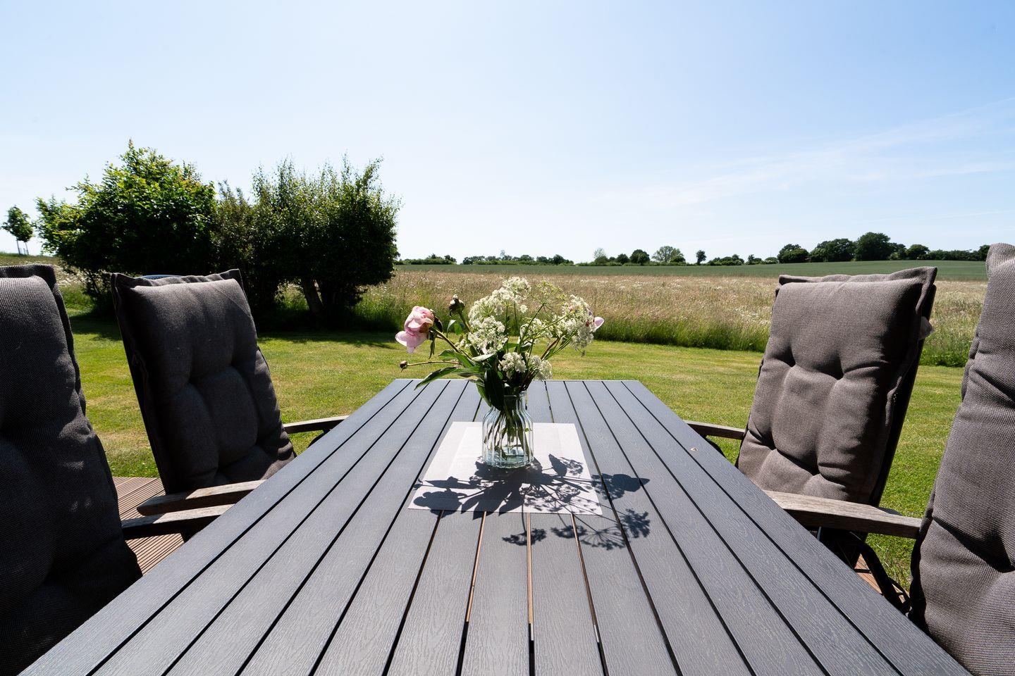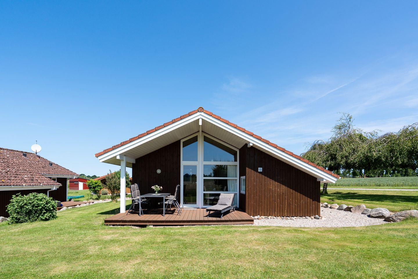 Bis zu vier Personen finden in dem typisch skandinavischen Ferienhaus auf rund 60m² einen Ort der Erholung. Von dem hellen Wohn-/Essbereich mit offener Küche haben Sie eine herrliche Sicht über die Felder und das komfortable und großzügige Sofa lädt zu gemütlichen Fernsehabenden ein. Bei schönem Wetter können Sie die Terrasse in vollen Zügen genießen, während die Kinder draußen genügend Platz zum toben haben.