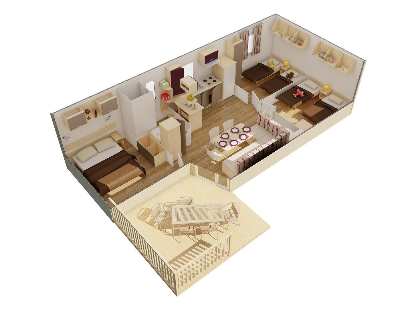 Unsere Mobilheime Typ Pacifique im Ferienpark AM WALDRAND sind nur 350 m vom Strand entfernt. Über vier Stufen kommen Sie auf die Terrasse und in den offenen Wohnraum mit bestückter Küche und Sitzecke. Die stilvolle Holzterrasse lädt zum Verweilen mit Blick auf unsere pflanzenreiche Parkanlage ein. Auf 35 m² bieten ein Schlafzimmer mit Doppelbett und ein weiteres mit Einzelbetten Platz für vier Personen. Ein Duschbad, sowie ein separates WC, ein Parkplatz und WLAN sind inbegriffen.