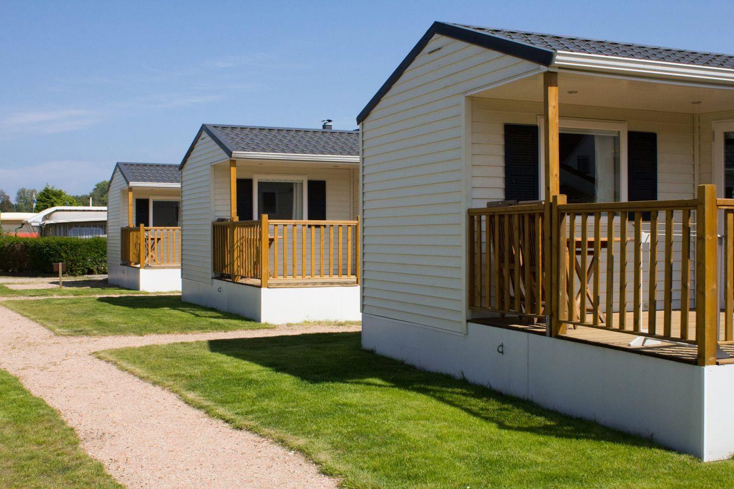 Unsere Mobilheime Typ Pacifique im Ferienpark AM WALDRAND befinden sich in unserer pflanzenreichen Parkanlage und haben eine kleine teilüberdachte Holzterrasse.