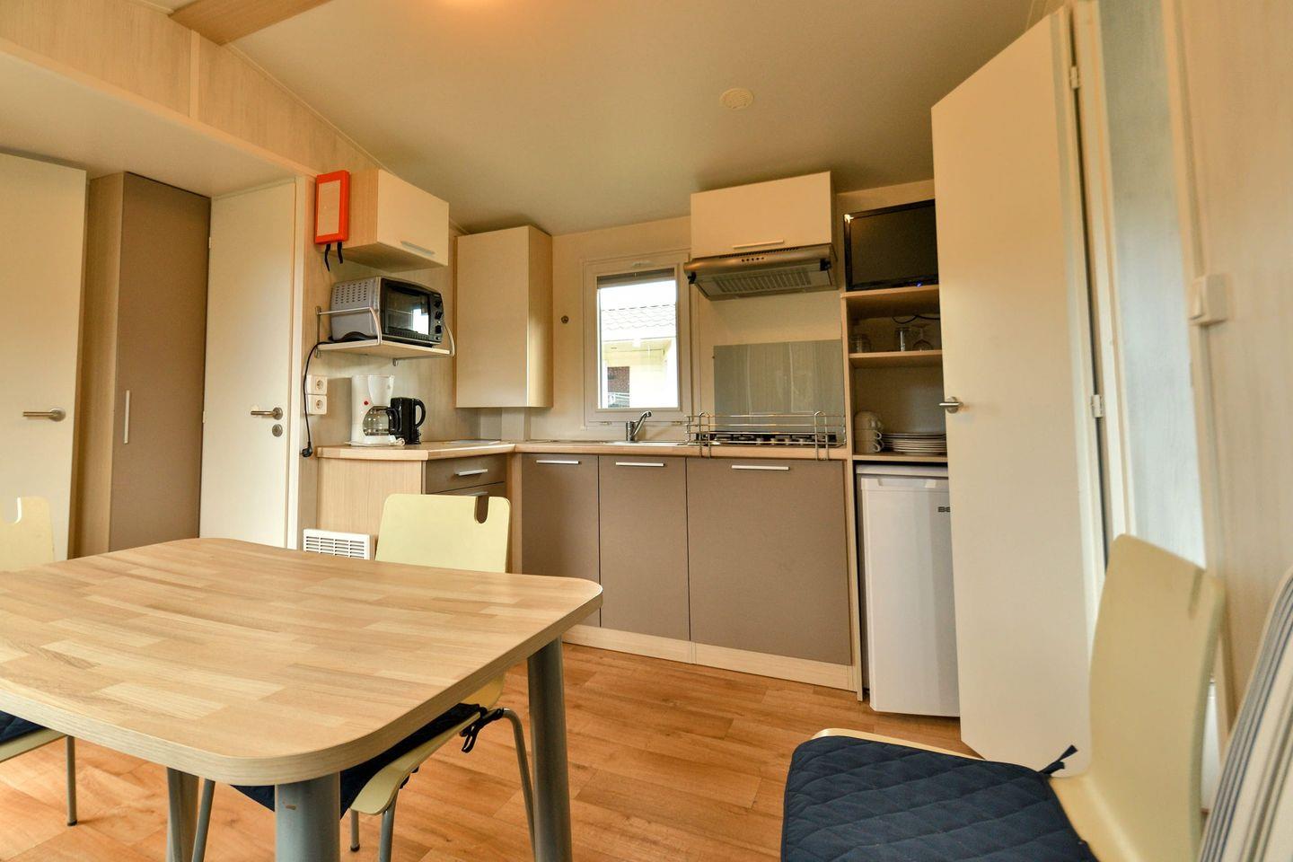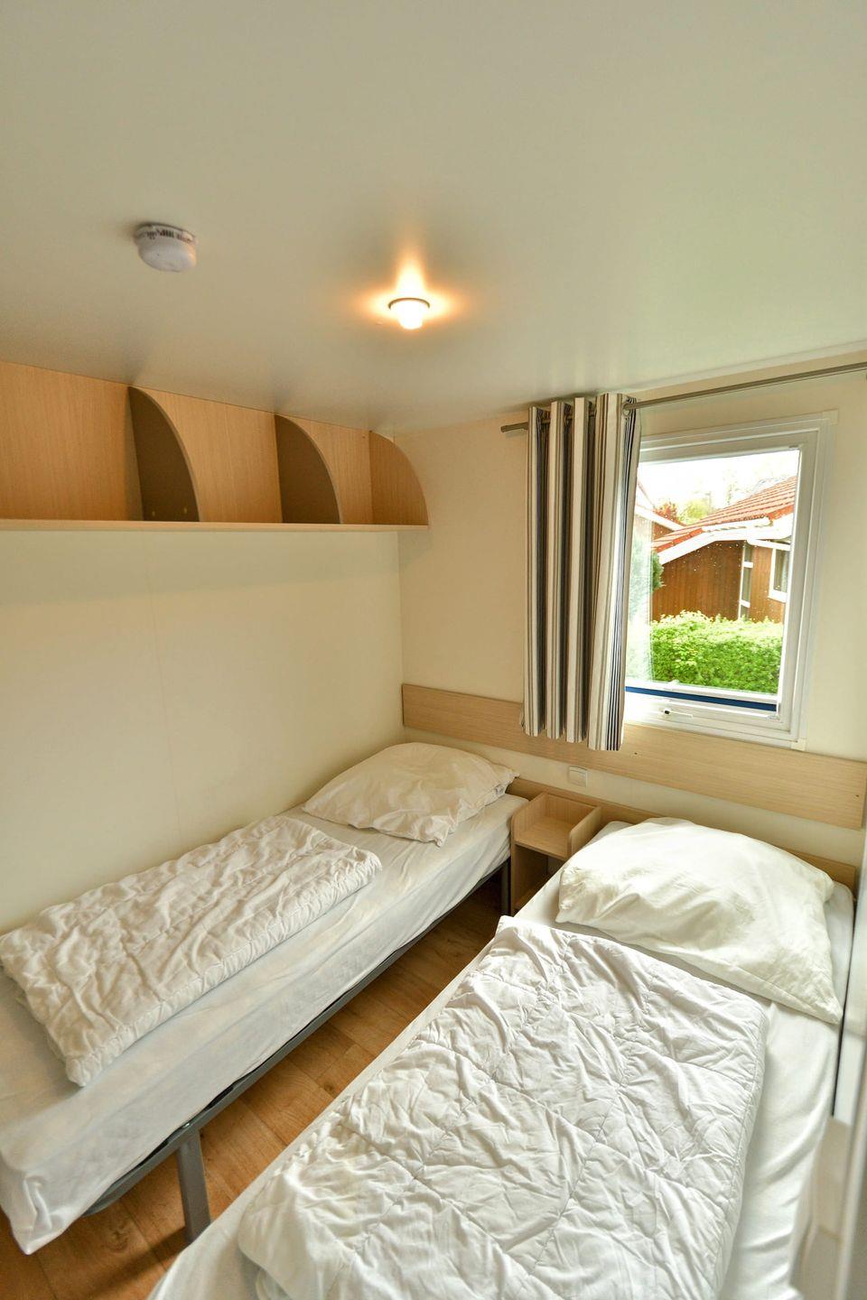 Über vier Stufen kommen Sie auf die kleine Holzterrasse und weiter in den offenen Wohnraum mit voll bestückter kleiner Küche und gemütlicher Sitzecke samt SAT-TV. Zum Verweilen auf der Terrasse sind Holzgartenmöbel vorhanden. Auf nur 35 m² bieten ein Schlafzimmer mit kleinem Doppelbett und ein weiteres Schlafzimmer mit zwei Einzelbetten Platz für bis zu vier Personen. Neben den Schlafzimmern kommen Sie vom Wohnraum aus auch zum Bad mit Waschplatz und Dusche und zum separaten WC. Außerdem gehört ein Pkw-Stellplatz selbstverständlich zu jedem Mobilheim und Sie können den Internetzugang per WLAN kostenfrei nutzen.