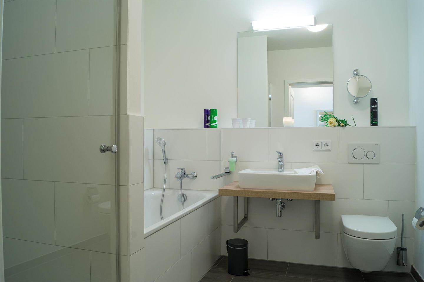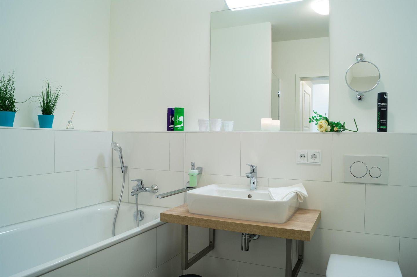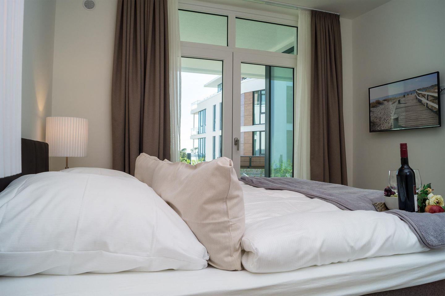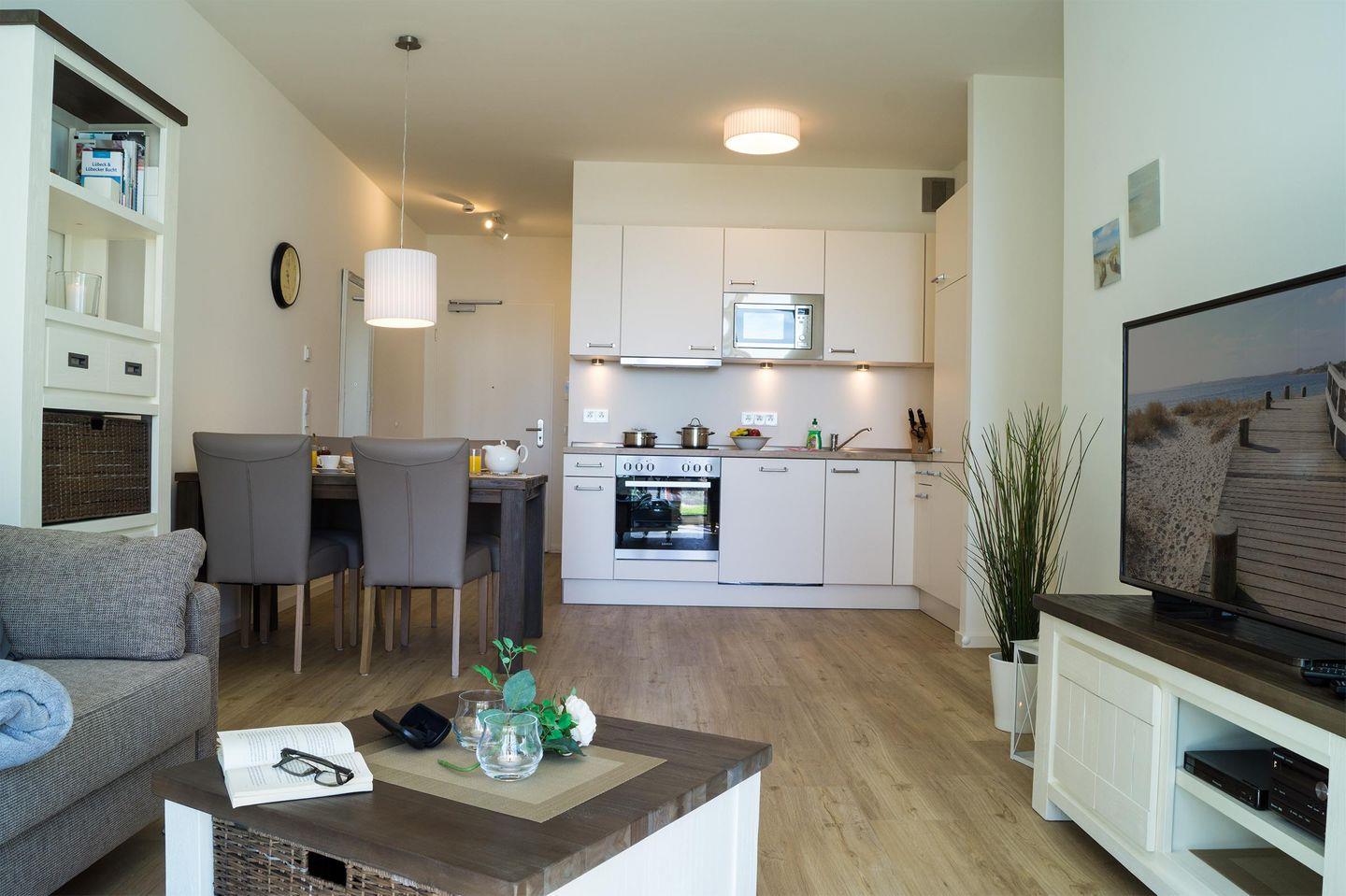 Der helle kombinierte Wohn-/Essraum verfügt über eine komplett ausgestattete offene Küche und bildet das Herzstück der Wohnung. Die geschützte Terrasse ist ebenerdig vom Schlaf- sowie vom Wohnzimmer aus erreichbar. Das Schlafzimmer ist mit einem gemütlichen Boxspring-Doppelbett, einem großen Kleiderschrank und einem Fernseher ausgestattet. Für Entspannung sorgt das geräumige Badezimmer mit Badewanne und Dusche.