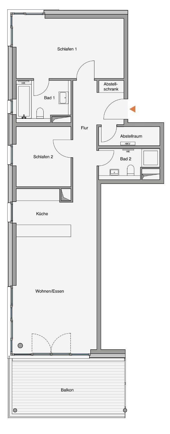 Das 84 qm große 3-Zimmer Apartment befindet sich im 2. Obergeschoss des Hauses E. Es ist für eine Belegung mit 5 (4 Erwachsene + 1 Kind) Personen ausgelegt.