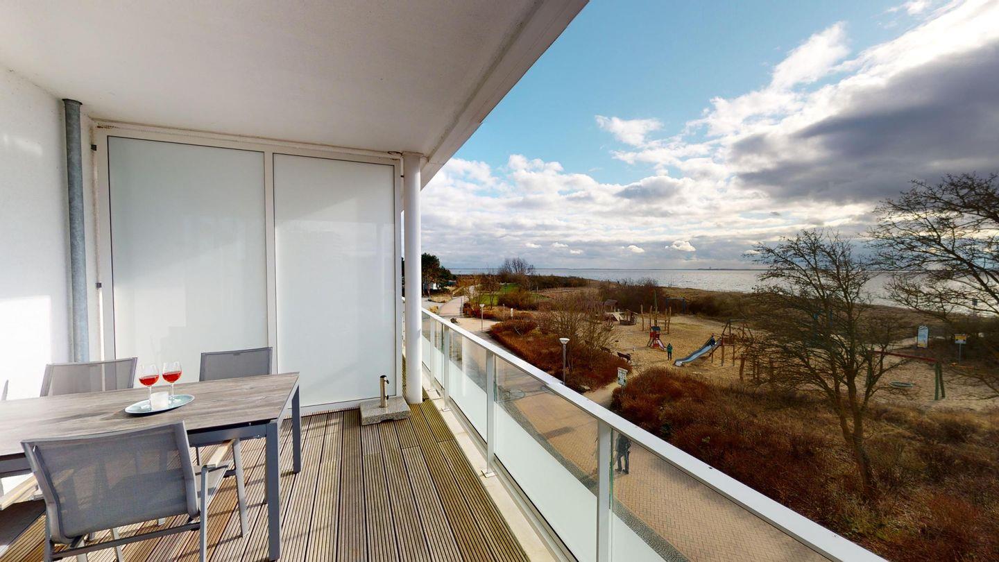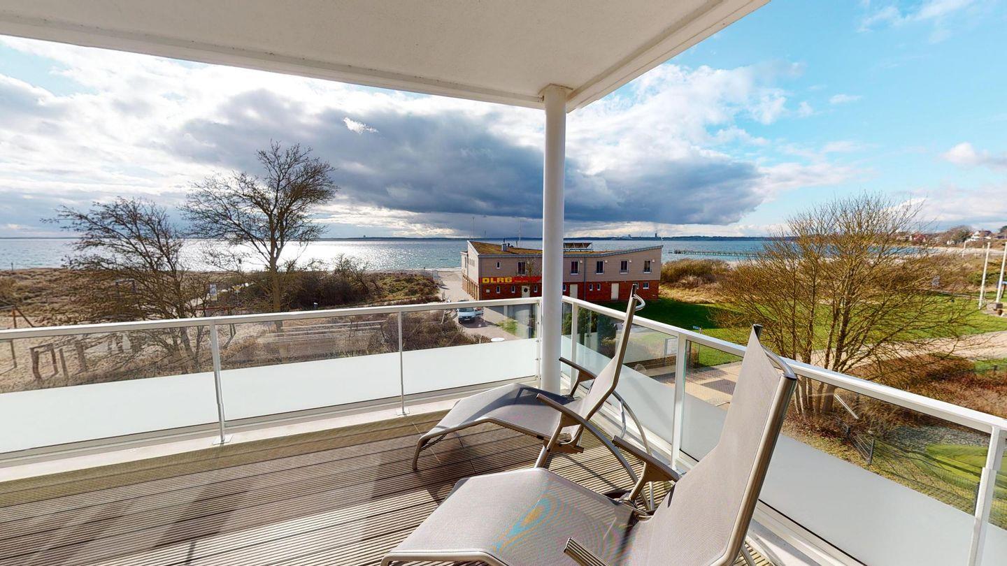 Über das Wohnzimmer gelangen Sie auf den großen Balkon mit einmaligem Meerblick! Hier stehen zwei Sonnenliegen sowie ein Tisch mit vier Stühlen für Sie bereit, das Urlaubsgefühl ist komplett!