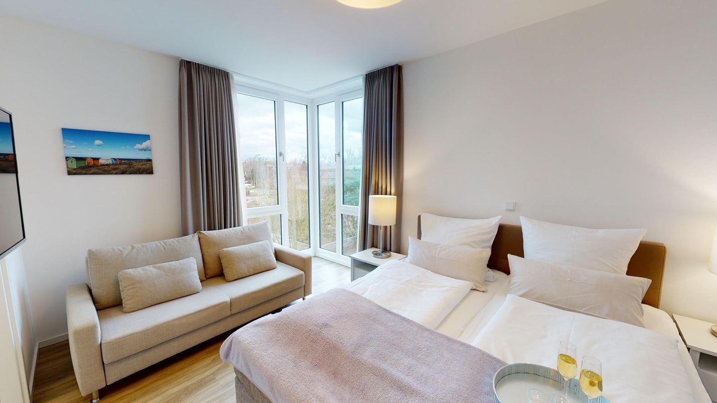 Weiter über den Flur gelangen sie rechterhand in das zweite, etwas kleinere Schlafzimmer auch mit einem Boxspring-Doppelbett und einen Kleiderschrank ausgestattet. Linkerhand vom Flur, führt Sie Ihr Weg in das zweite Badezimmer, dies mit einer fast bodengleichen Dusche. Am Ende des Flurs erreichen Sie das Herzstück des Apartments, den großzügigen Wohnbereich. Ausgestattet mit einer schönen, offenen Einbauküche, einem einladenden Essbereich und einer gemütlichen Sofaecke - inklusive Meerblick! Das Sofa bietet eine Schlaffunktion und dient somit als Schlafplatz für eine Person.