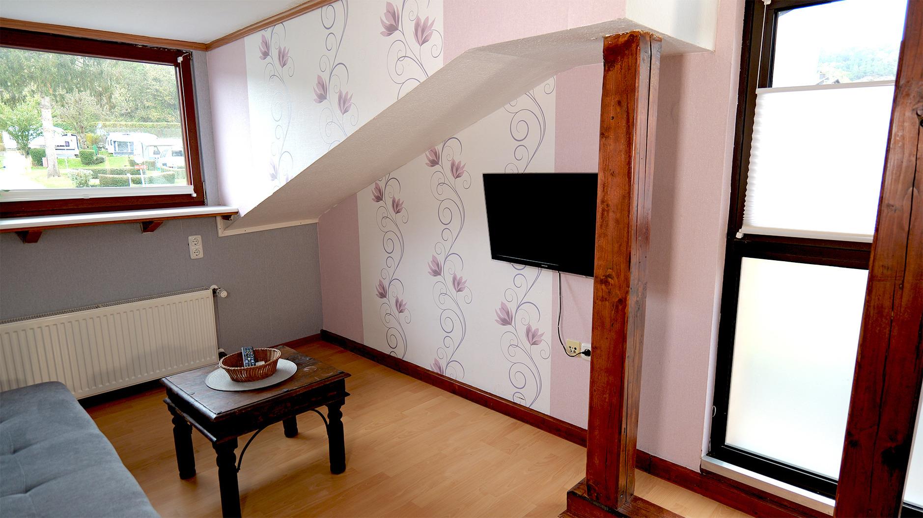 Die kleine Wohnung befindet sich im ersten Stock und ist über eine Treppe erreichbar. Im Abstellraum können z.B. Gepäckstücke abgestellt werden. Die Wohnung befindet sich oberhalb der Sanitäranlage. Gegenüber sind die Rezeption und das SB & Café Hetzingen. Die Wohnung liegt "mitten im Geschehen". Dein Fahrzeug parkst du in der Nähe des Objektes. An der Treppe kannst Du für kurze Zeit halten, um das Gepäck auszuladen.