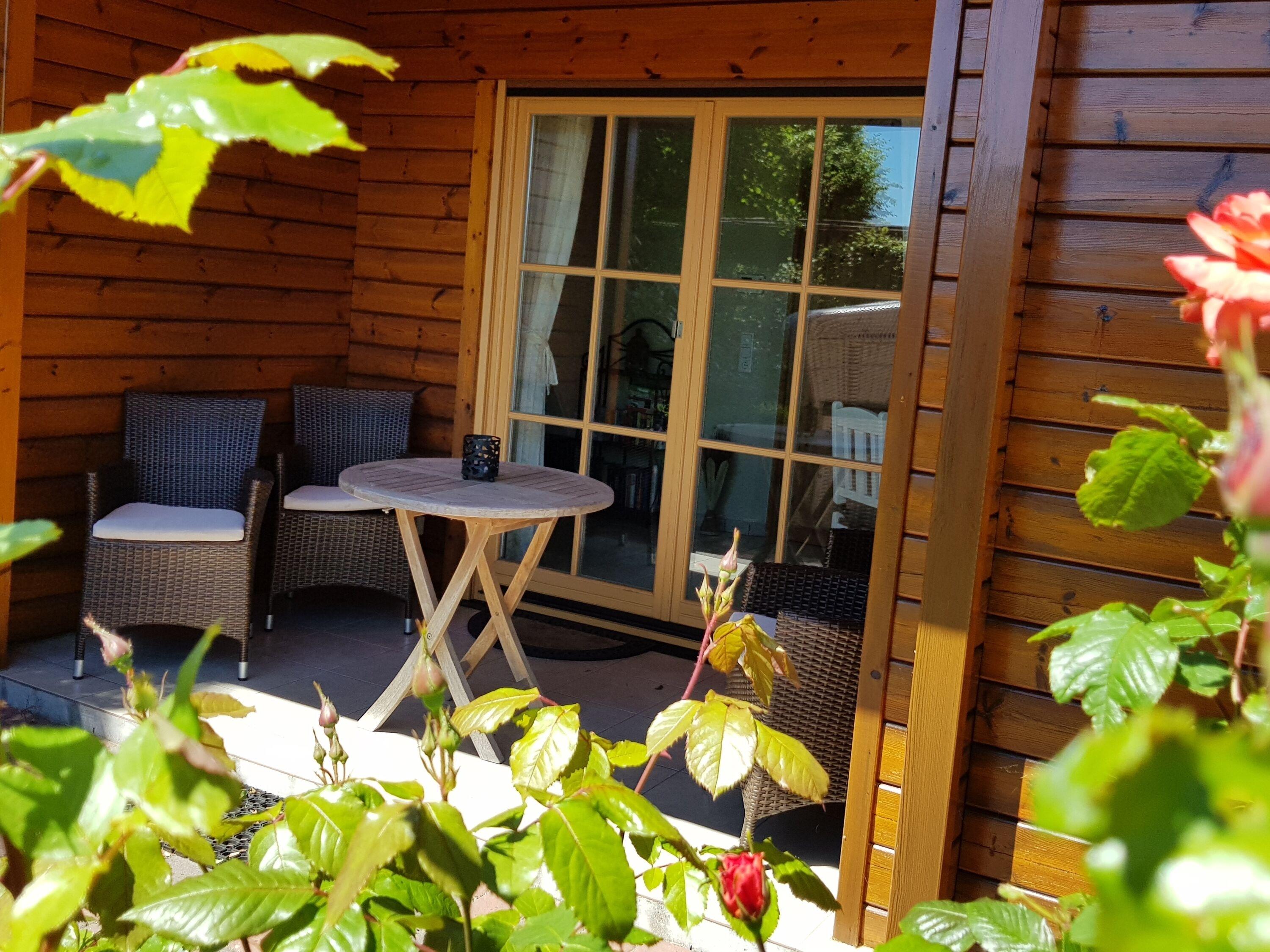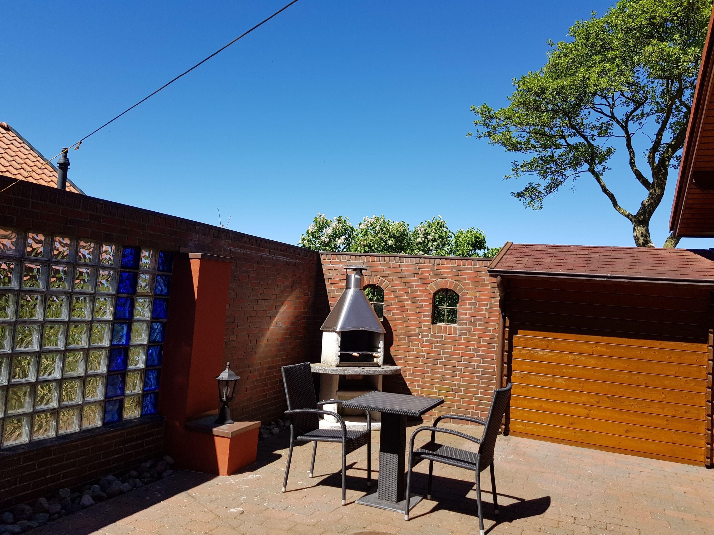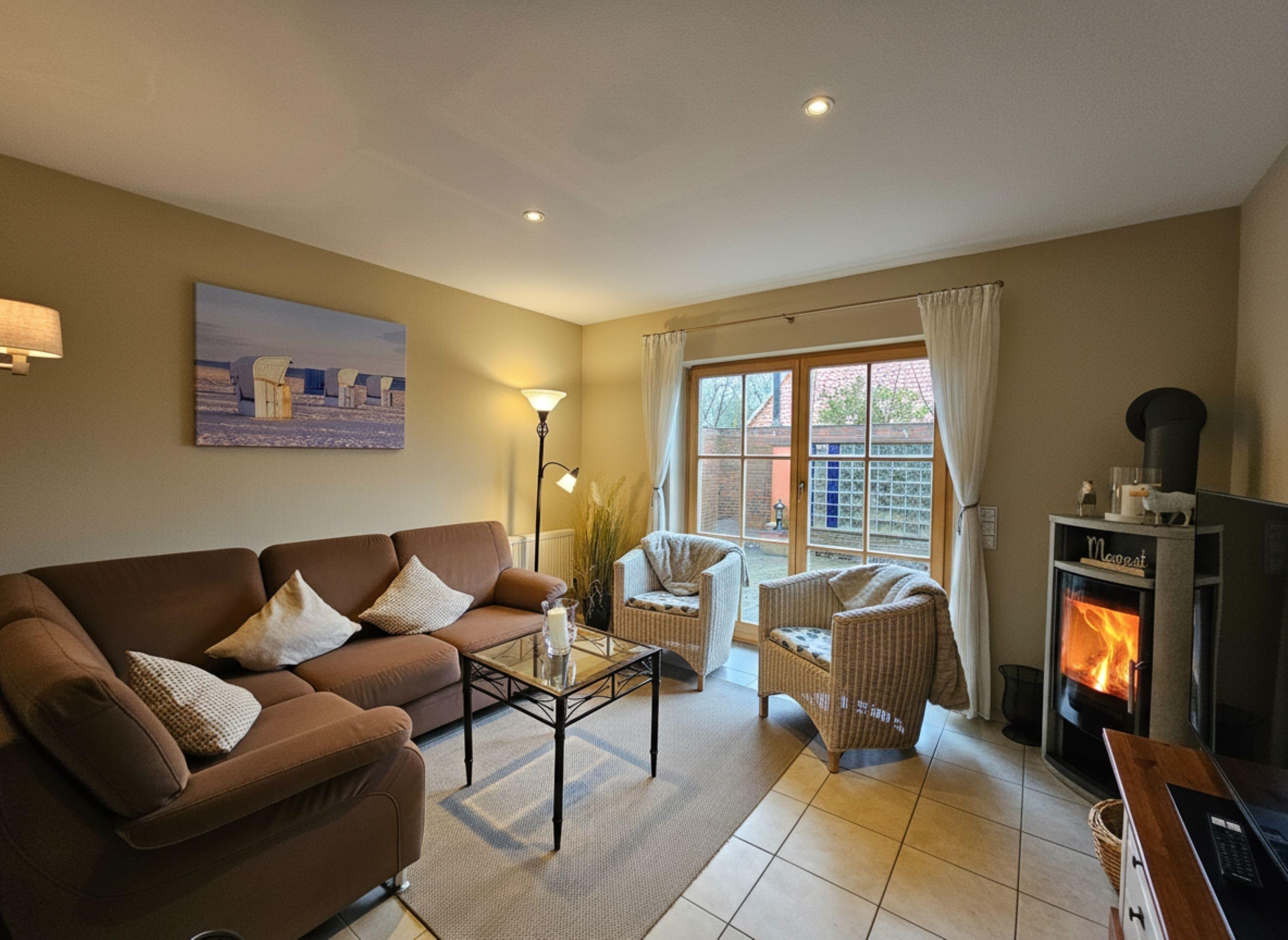 Im Haus (nur EG) befindet sich eine voll ausgestattete Küche mit Esstisch, eine gemütliche Couch, ein Kaminofen für kühle Abende, ein Schlafzimmer und ein Duschbad sowie ein Abstellraum mit Waschmaschine und Trockner. Es gibt eine eingezäunte Terrasse mit Sitzmöbeln und Strandkorb (während der Saison) mit angrenzendem Garten, zusätzlich ist noch eine ummauerte, nicht einsehbare Terrasse mit Sonnenschirm und Grill vorhanden.