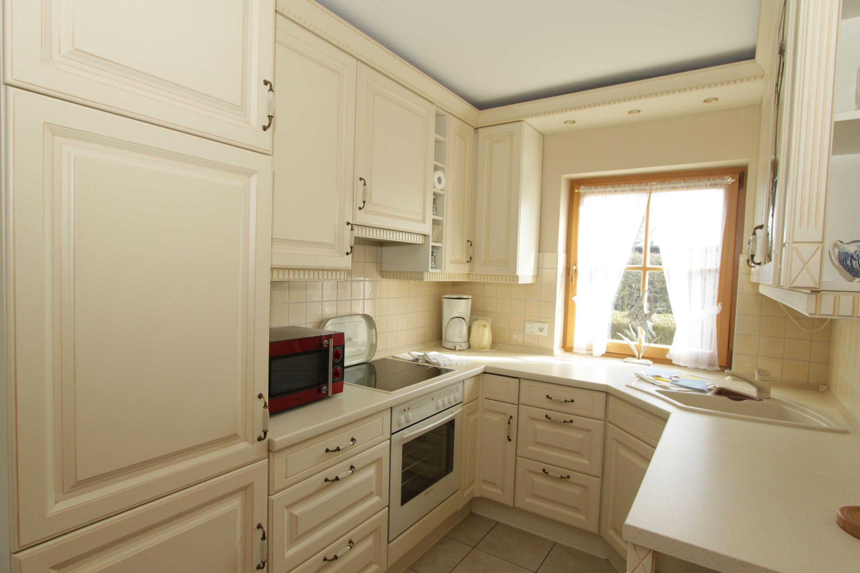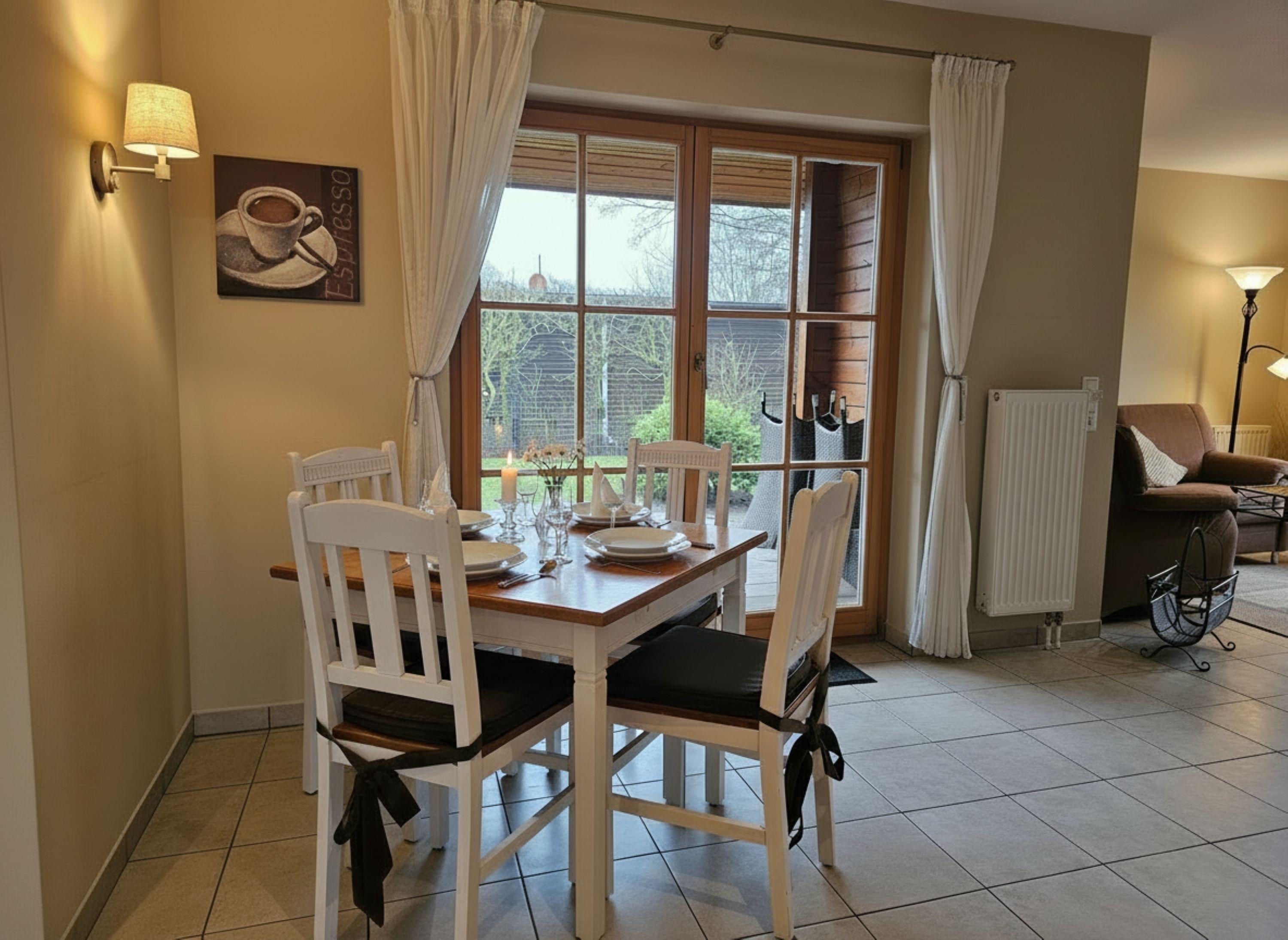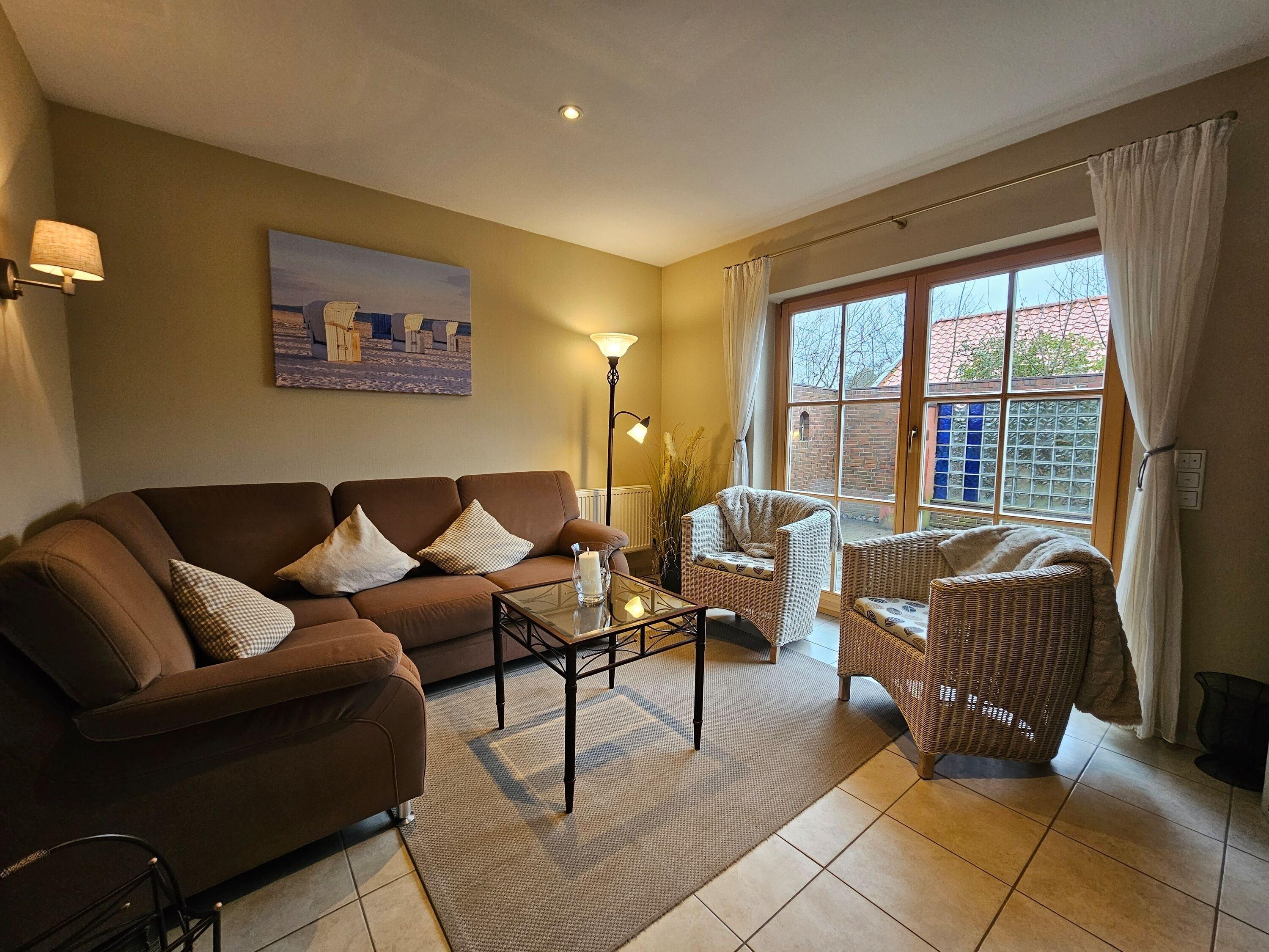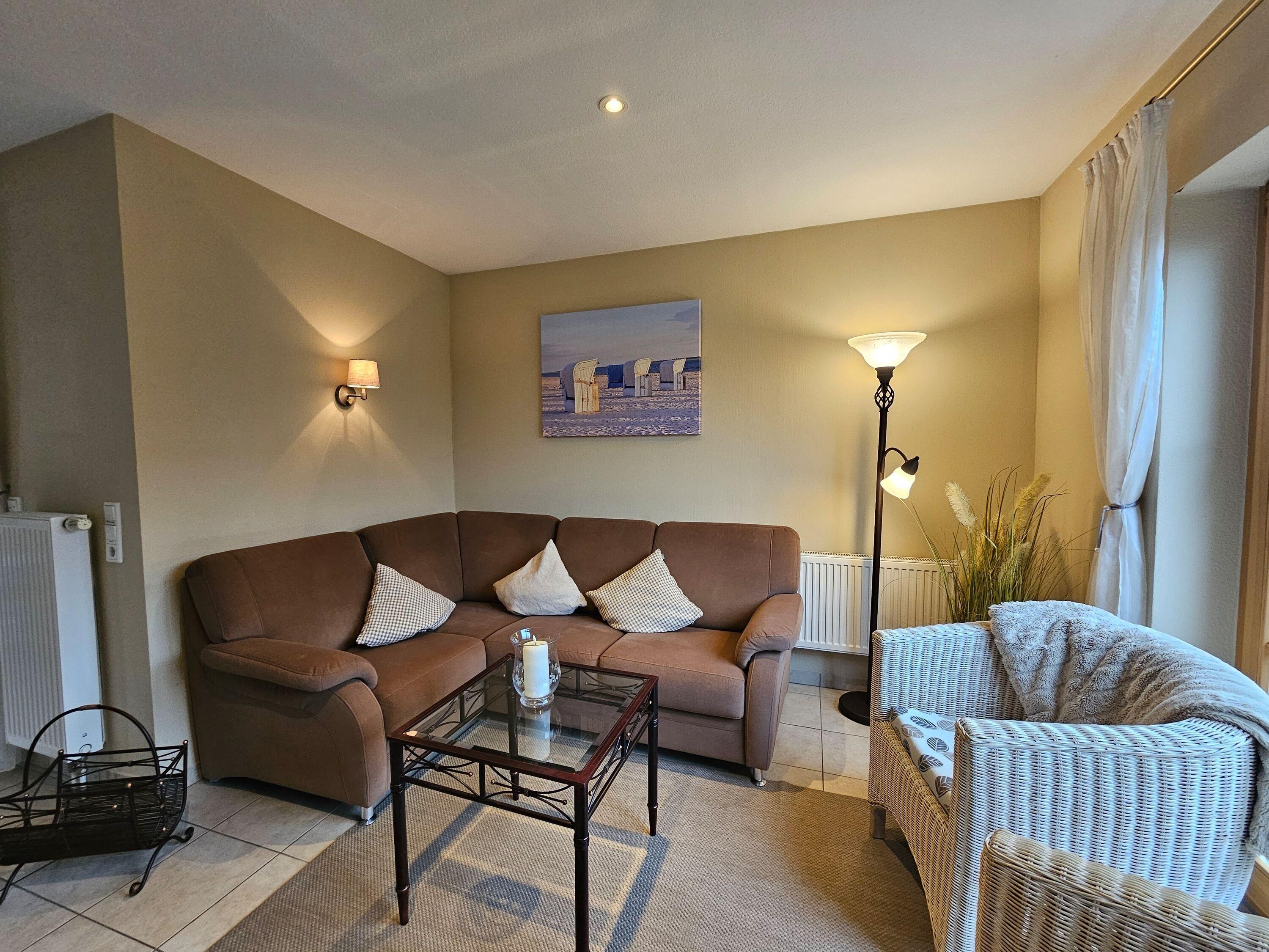 Im Haus (nur EG) befindet sich eine voll ausgestattete Küche mit Esstisch, eine gemütliche Couch, ein Kaminofen für kühle Abende, ein Schlafzimmer und ein Duschbad sowie ein Abstellraum mit Waschmaschine und Trockner. Es gibt eine eingezäunte Terrasse mit Sitzmöbeln und Strandkorb (während der Saison) mit angrenzendem Garten, zusätzlich ist noch eine ummauerte, nicht einsehbare Terrasse mit Sonnenschirm und Grill vorhanden.