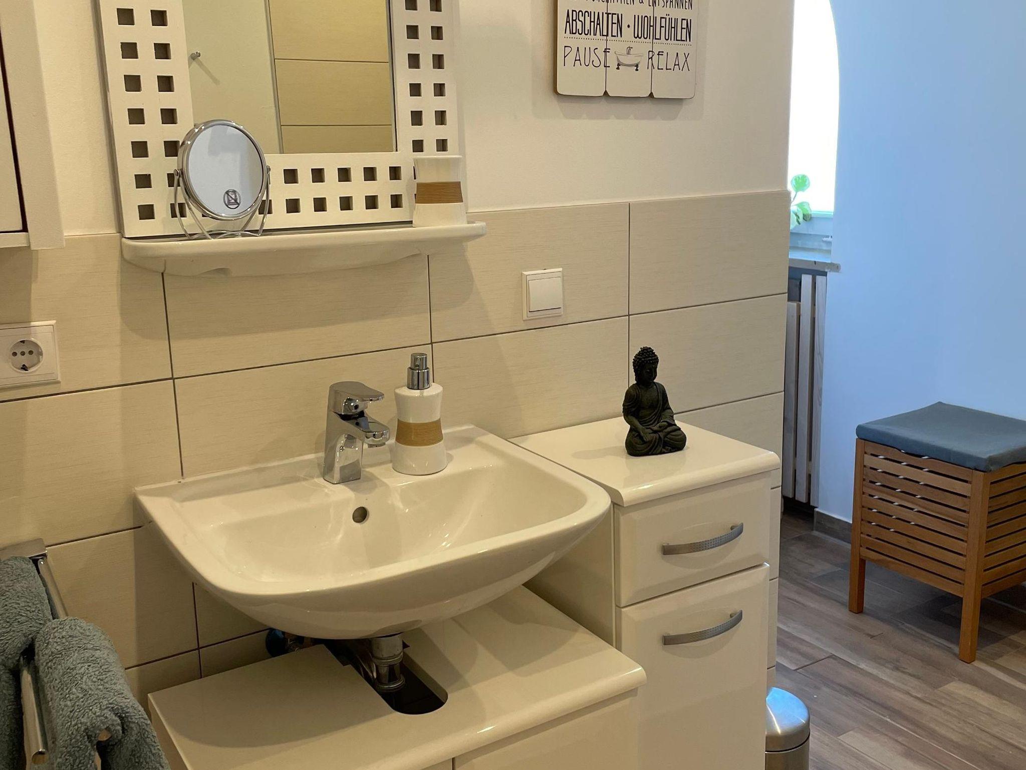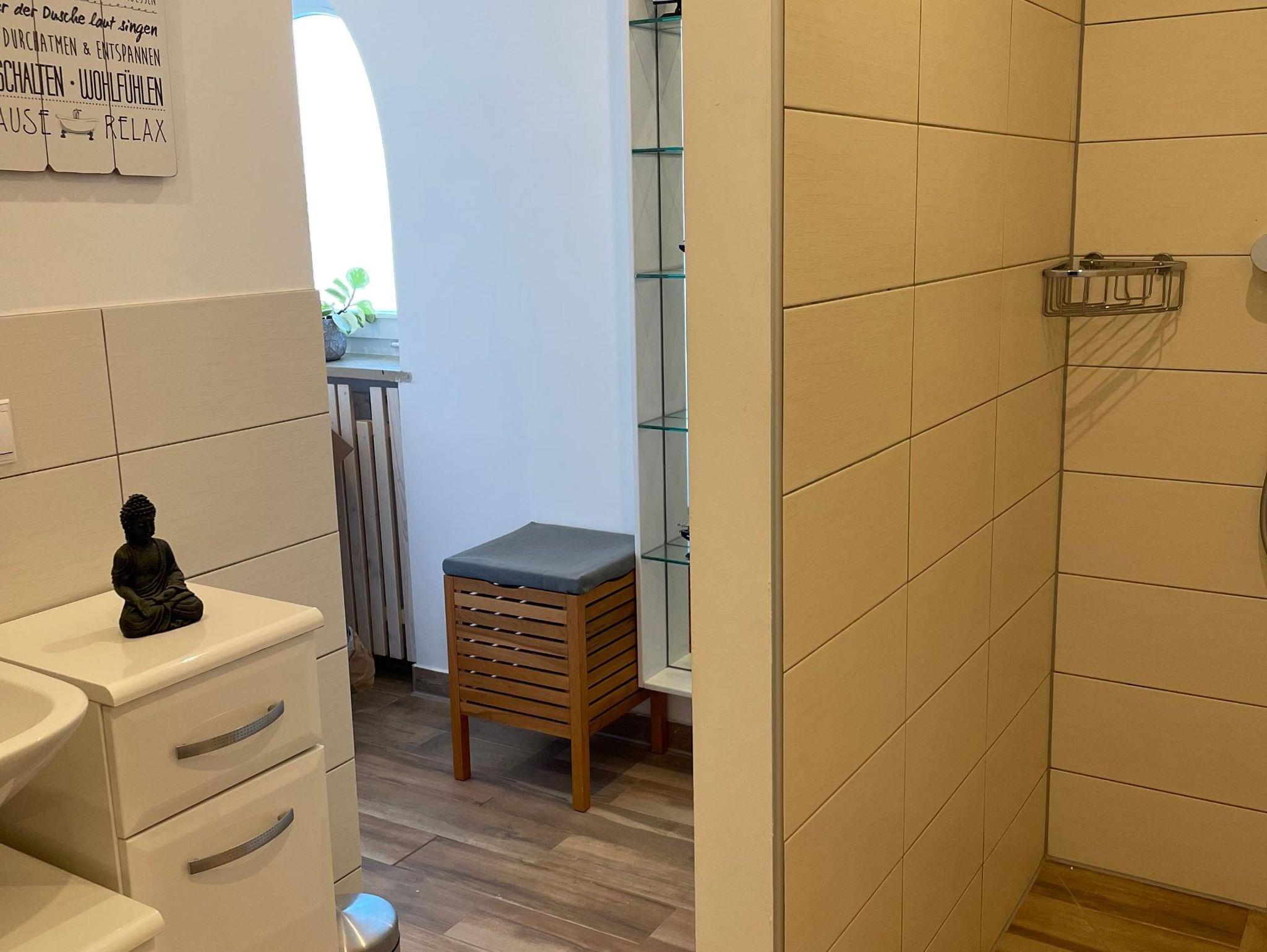 Das Badezimmer (9 m²) mit ebenerdiger Dusche, WC und Waschbecken, ein Handtuchheizkörper, Fön, Handtücher sind ebenfalls mit inbegriffen.
