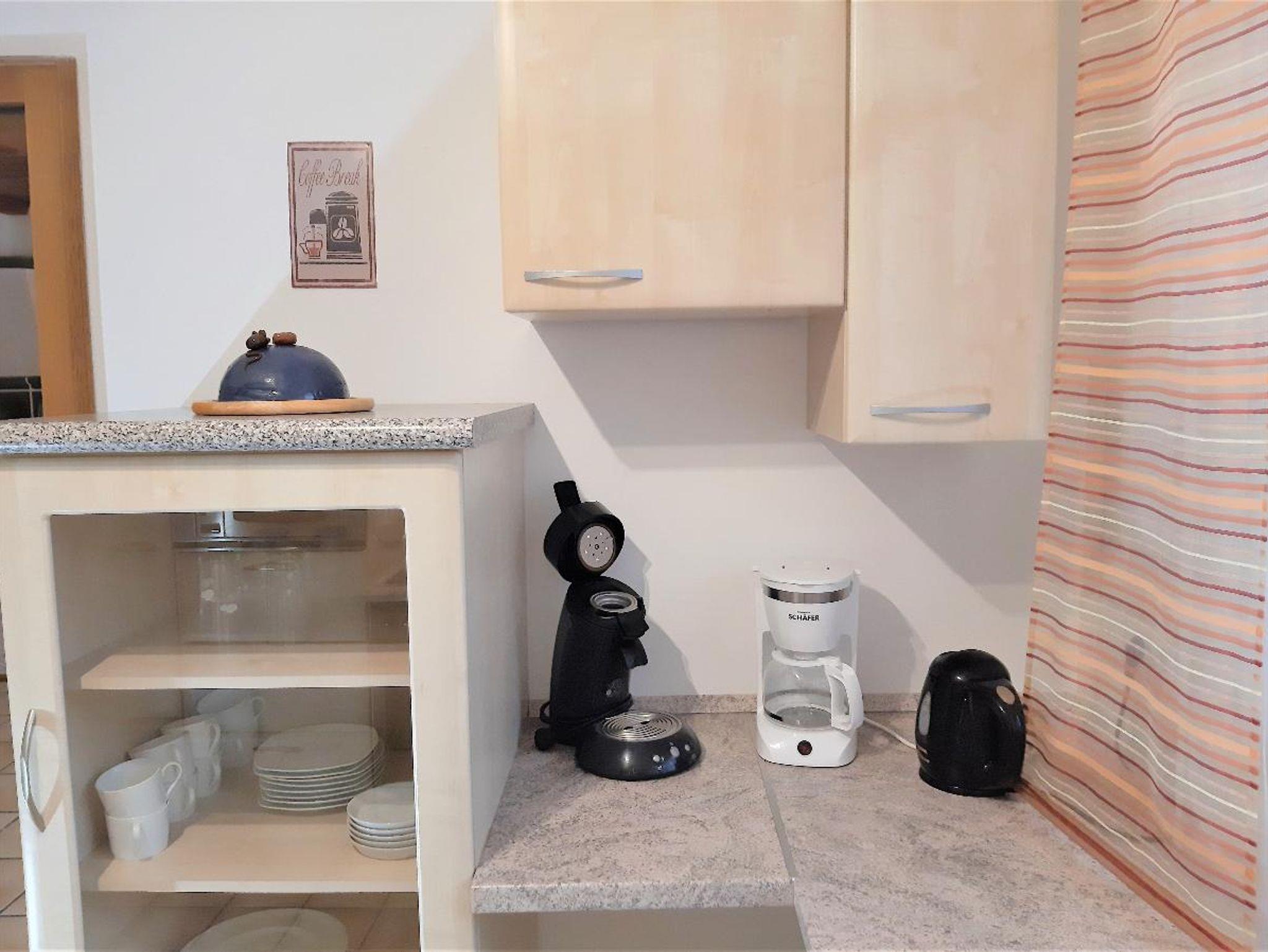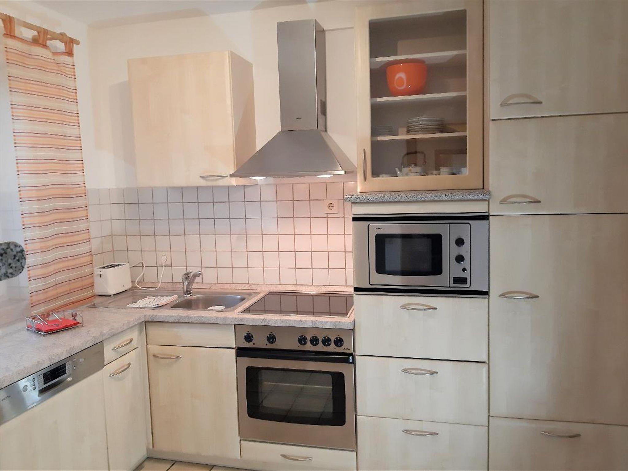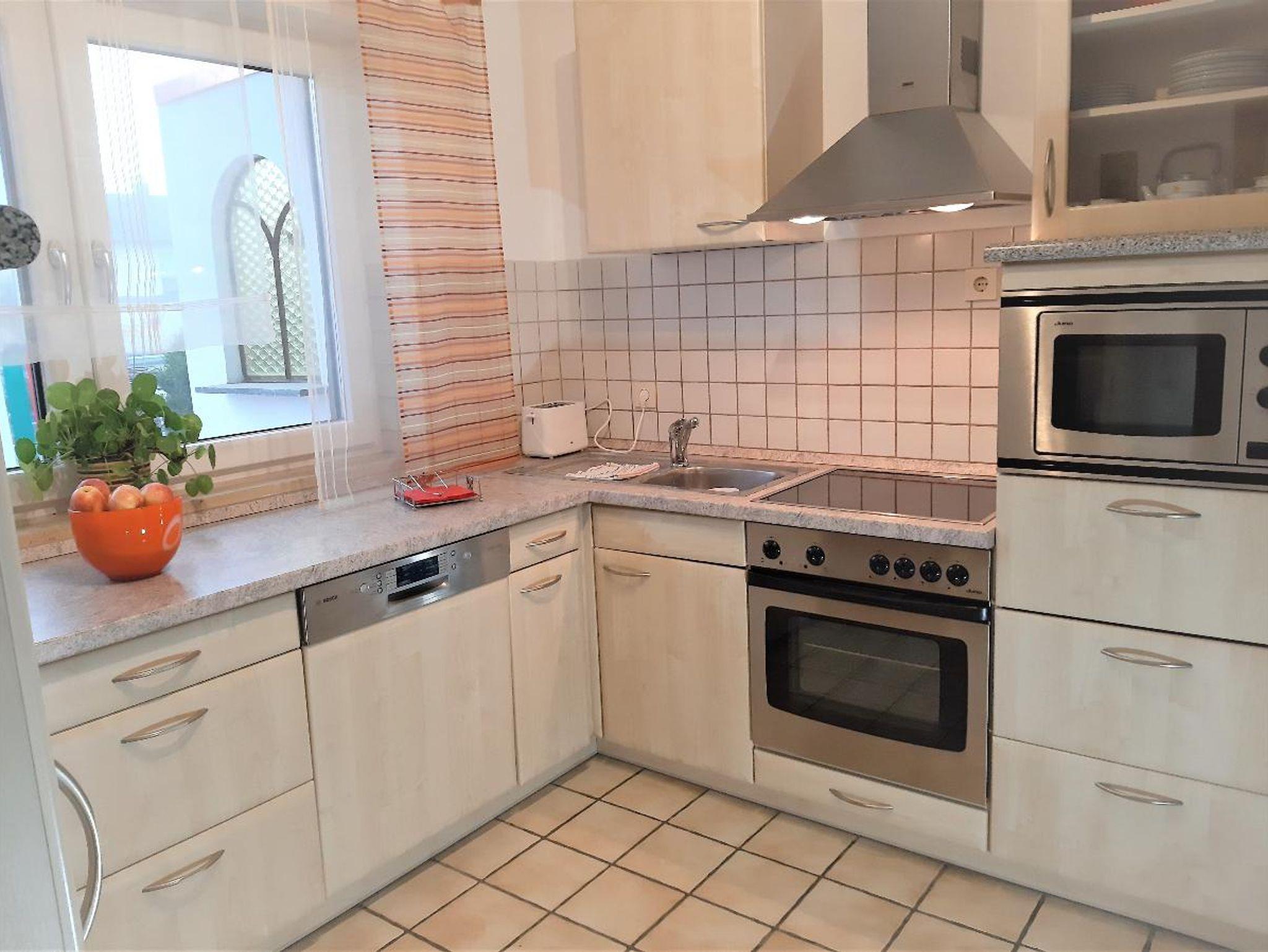Die Küche der Ferienwohnung ist etwa 12m² groß, ein kleiner Abstellraum von 3 m² befindet sich direkt nebenan. In der Küche finden sie eine umfangreiche Ausstattung für ihre individuellen Kocherlebnisse. Kühlschrank, E-Herd, Mikrowelle, Dunstabzug und Spülmaschine sind selbstverständlich.