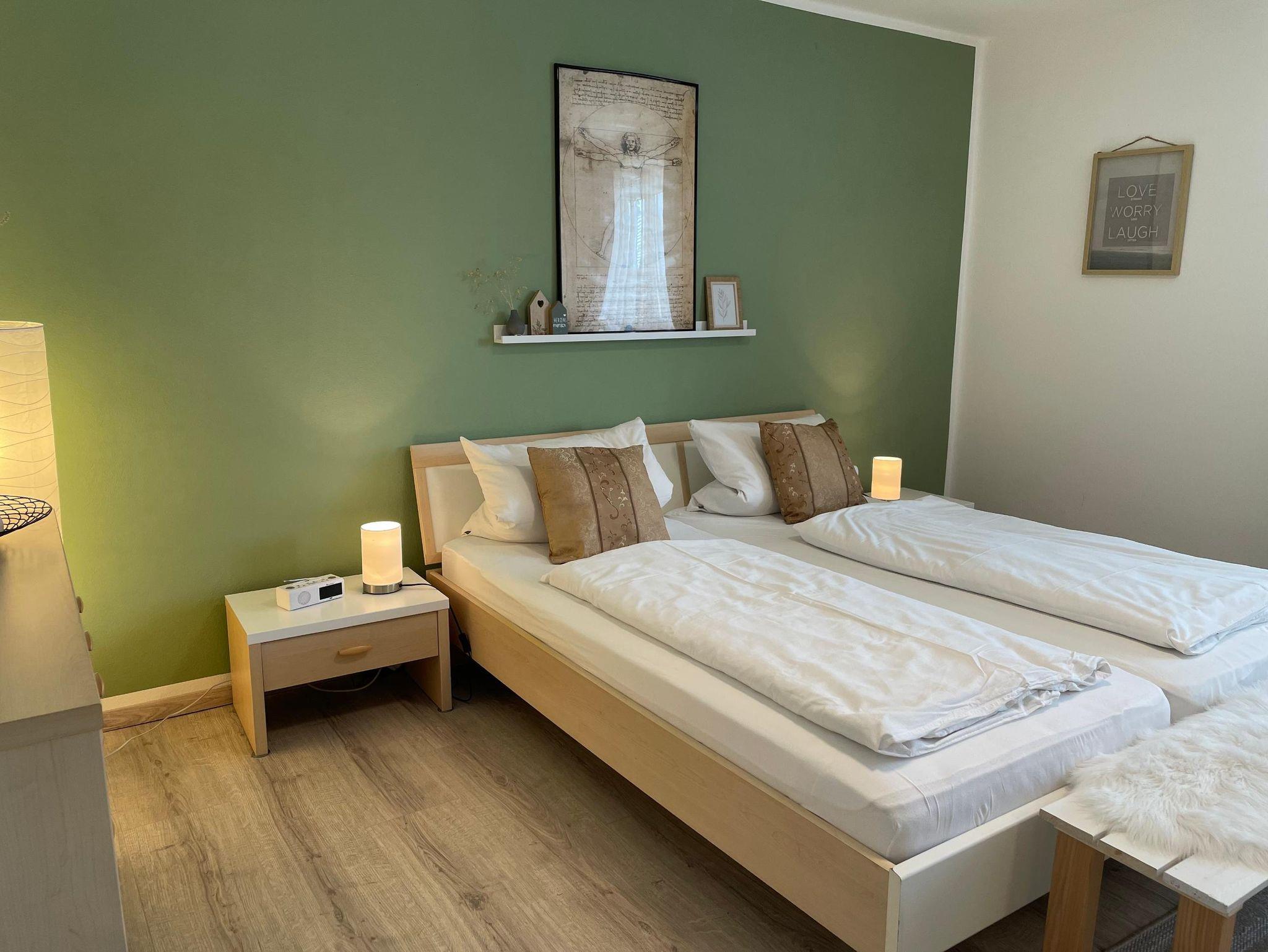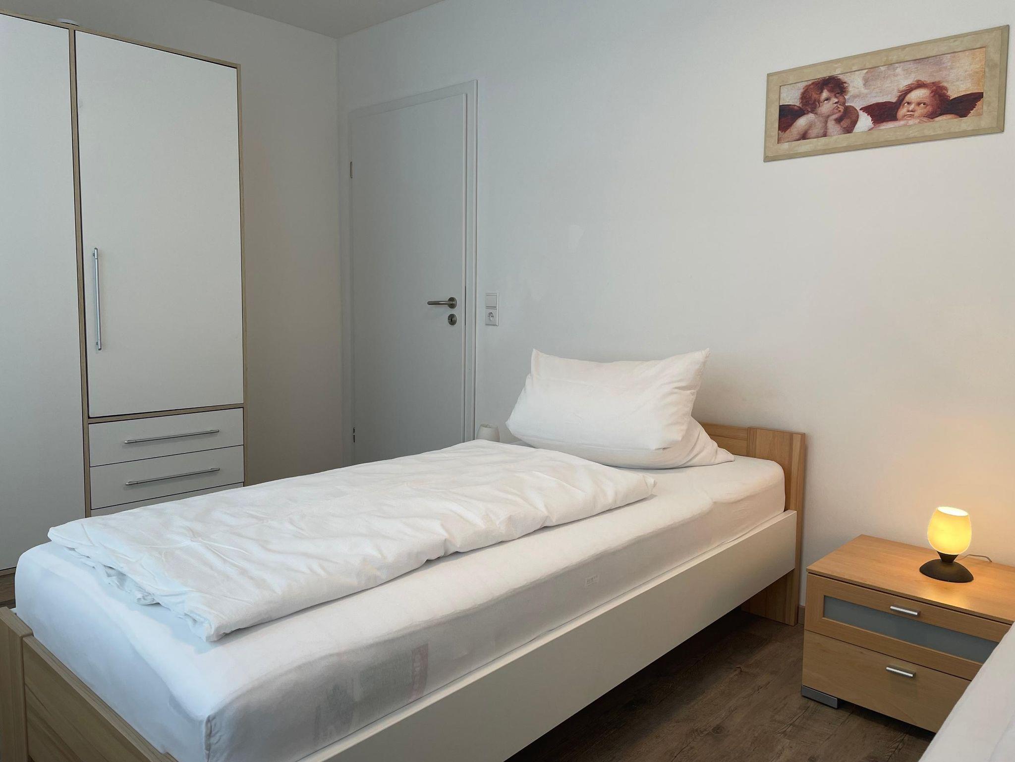 Vom Wohnzimmer aus gelangen Sie noch in ein kleines Schlafzimmer, etwa 14 m² groß, dies ist mit 2 Einzelbetten ausgestattet, die jederzeit voneinander getrennt aufgestellt werden können.