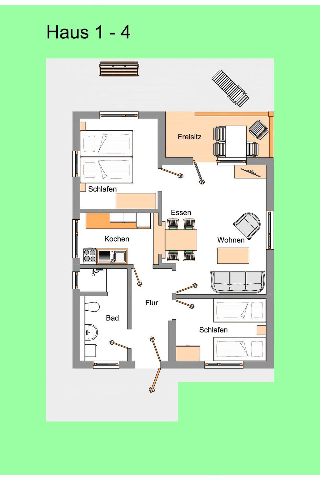 The 72m² solid bungalows have an identical structure and their interiors are similar. They each provide a living room, two bedrooms, a kitchen, a WC and shower, as well as a hallway with a wardrobe. The 20m² living room consists of a corner sofa that can be converted into a bed for a possible fifth person, a sideboard with satellite TV, a radio and a dining corner. One of the bedrooms is furnished with a double bed and the other with two single beds. There is also an additional child’s bed and highchair. The kitchen is fully-equipped with an electric stove and oven, a microwave, fridge with freezer compartment, coffee machine, toaster, kettle and hatch through to the dining space in the living room.