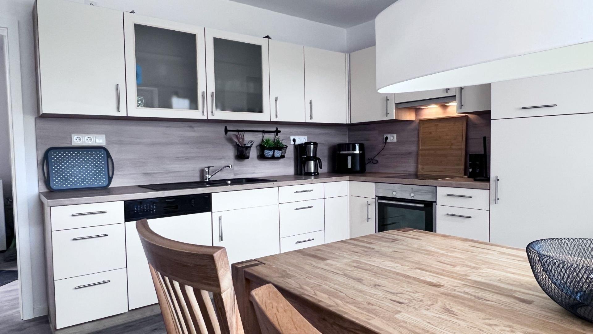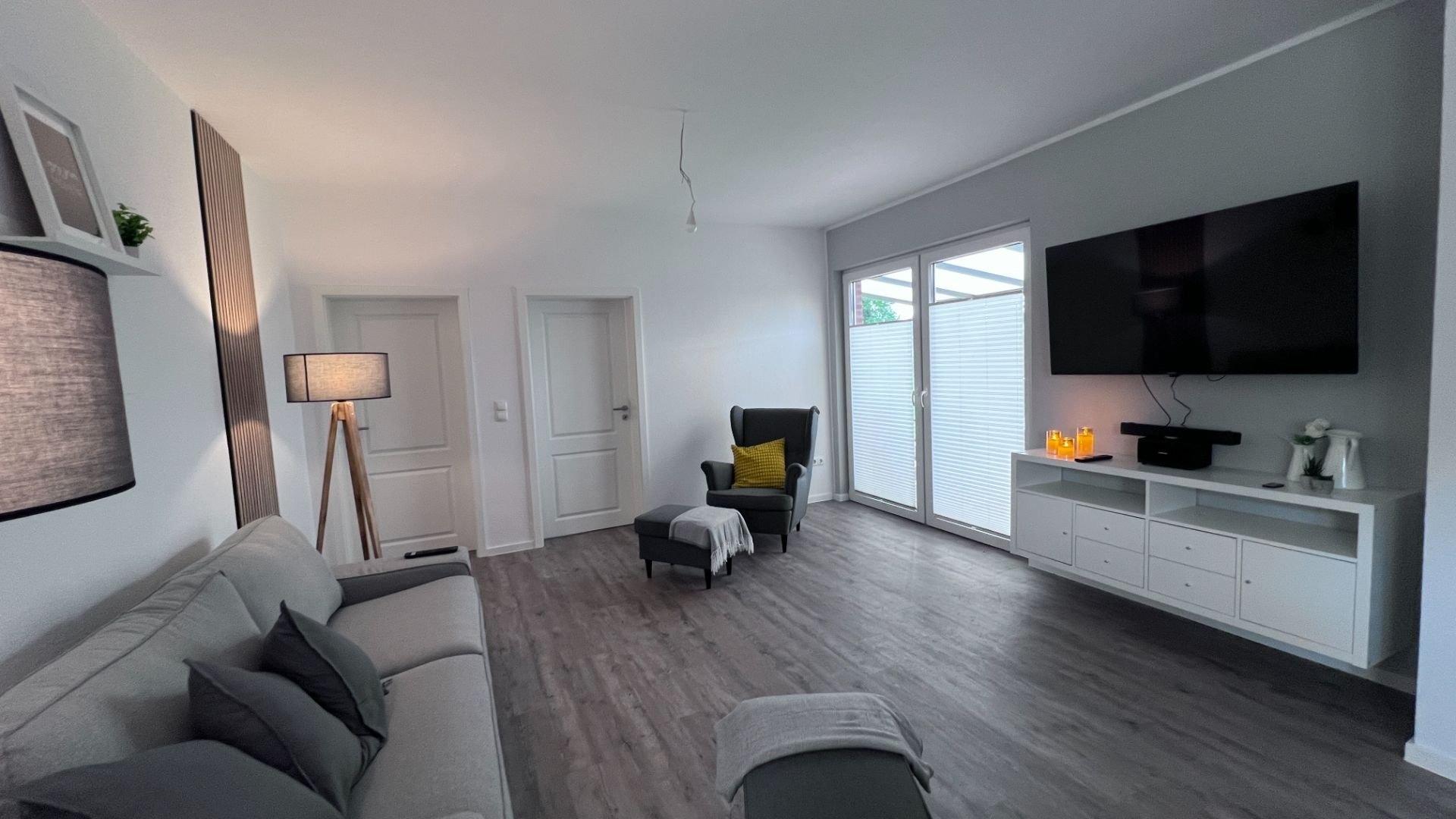 Zwei separate Schlafzimmer mit bequemen Boxspringbetten, ein großzügiger Wohn- und Essbereich mit viel Tageslicht und eine voll ausgestattete Küche (inkl. Airfryer) machen diese Wohnung zum perfekten Rückzugsort. Das moderne Badezimmer ist barrierearm gestaltet ebenso wie der Zugang zur überdachten Terrasse. Hier beginnt euer Urlaubstag mit Vogelgezwitscher und endet am Grillplatz oder an der Feuerstelle im Garten. Ideal für Familien, Paare oder Gäste mit Mobilitätseinschränkungen die Wert auf Raum und Komfort legen.