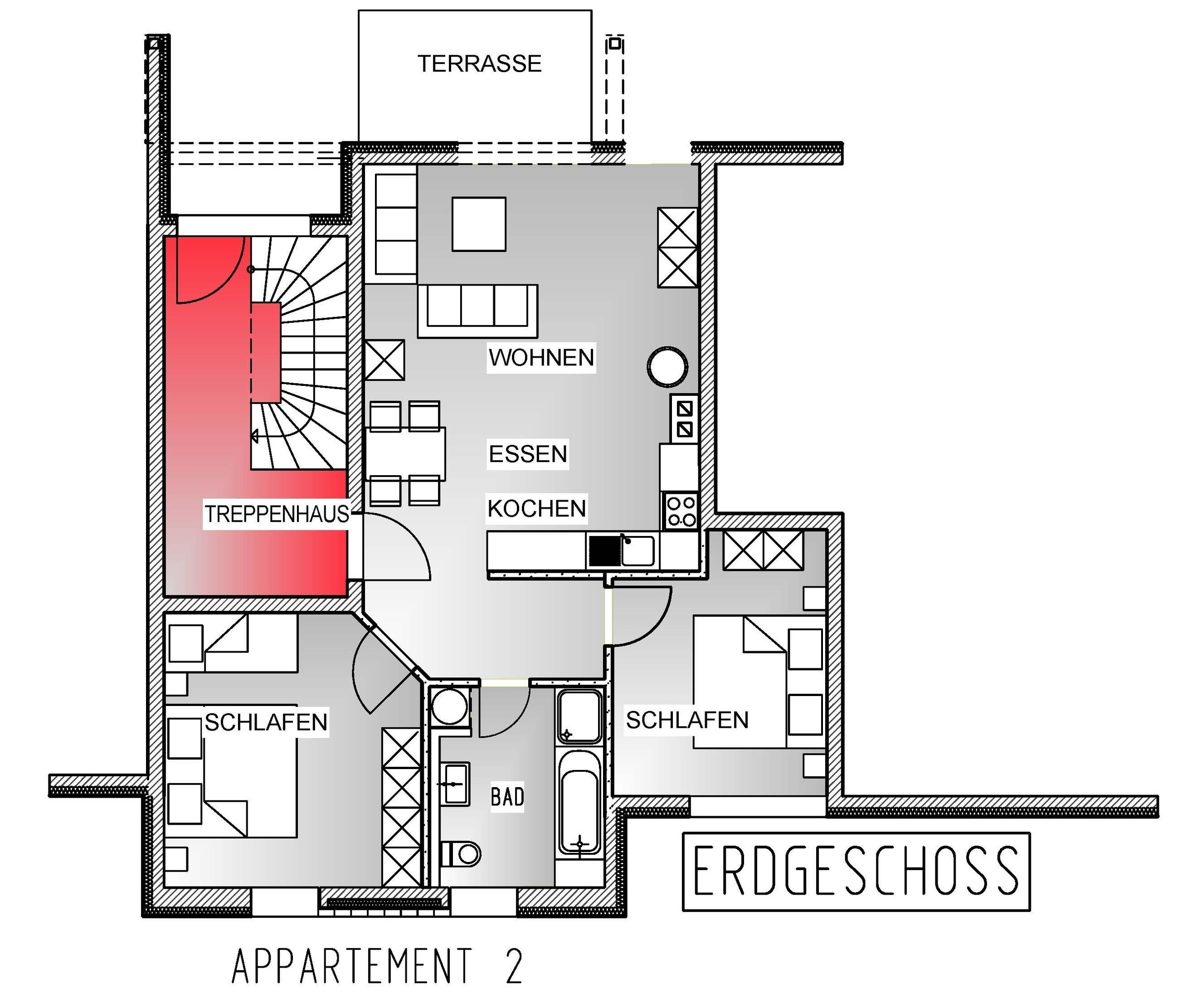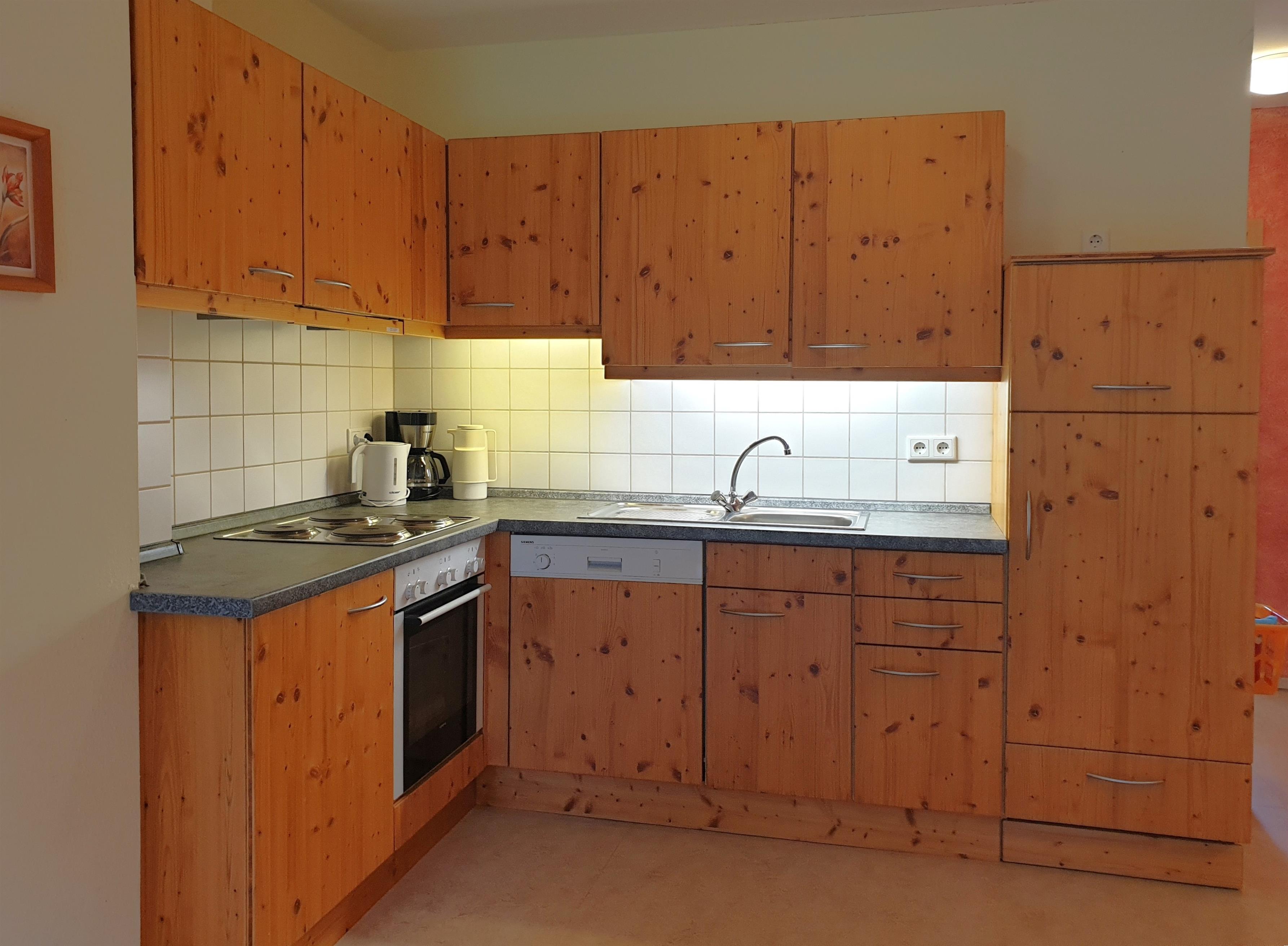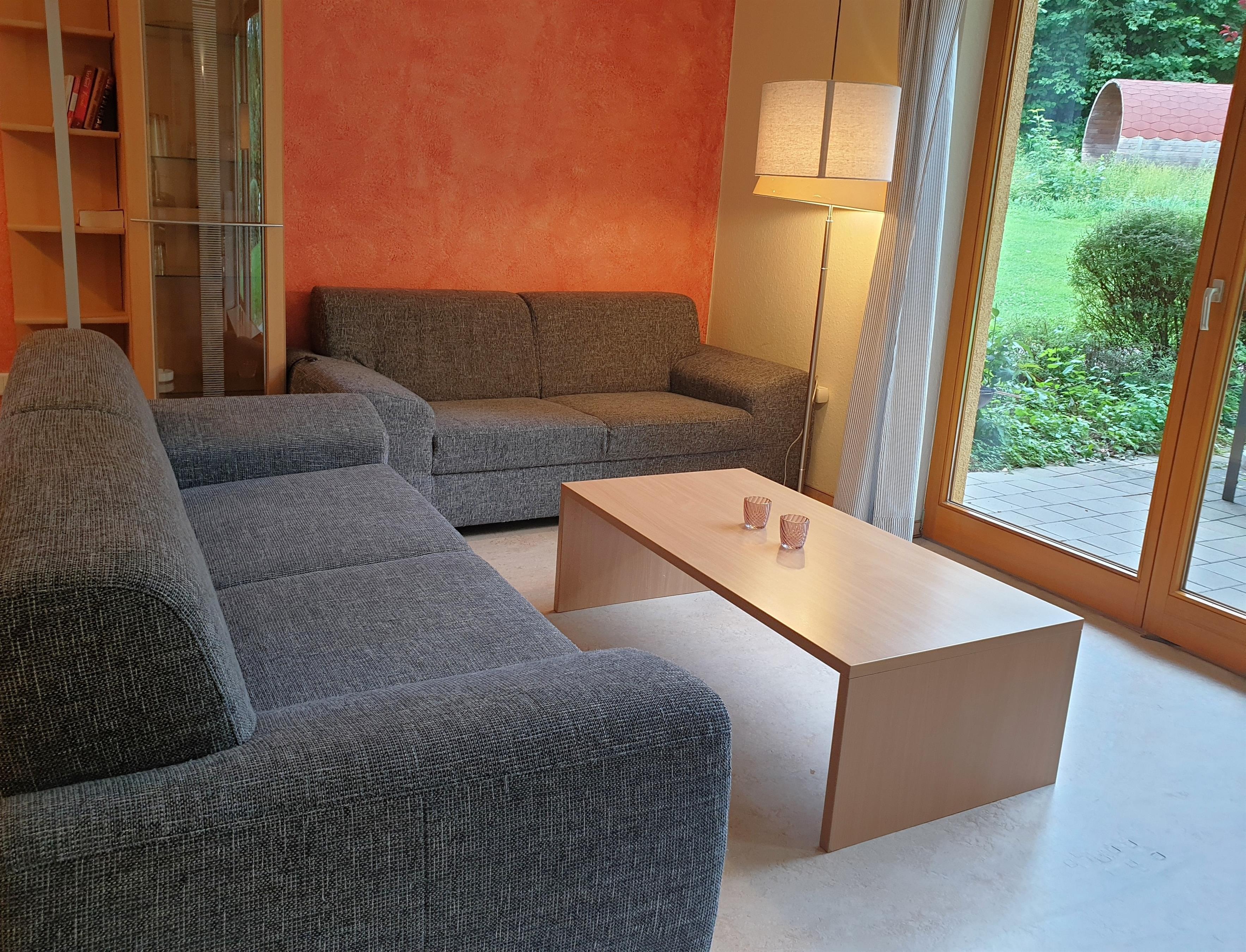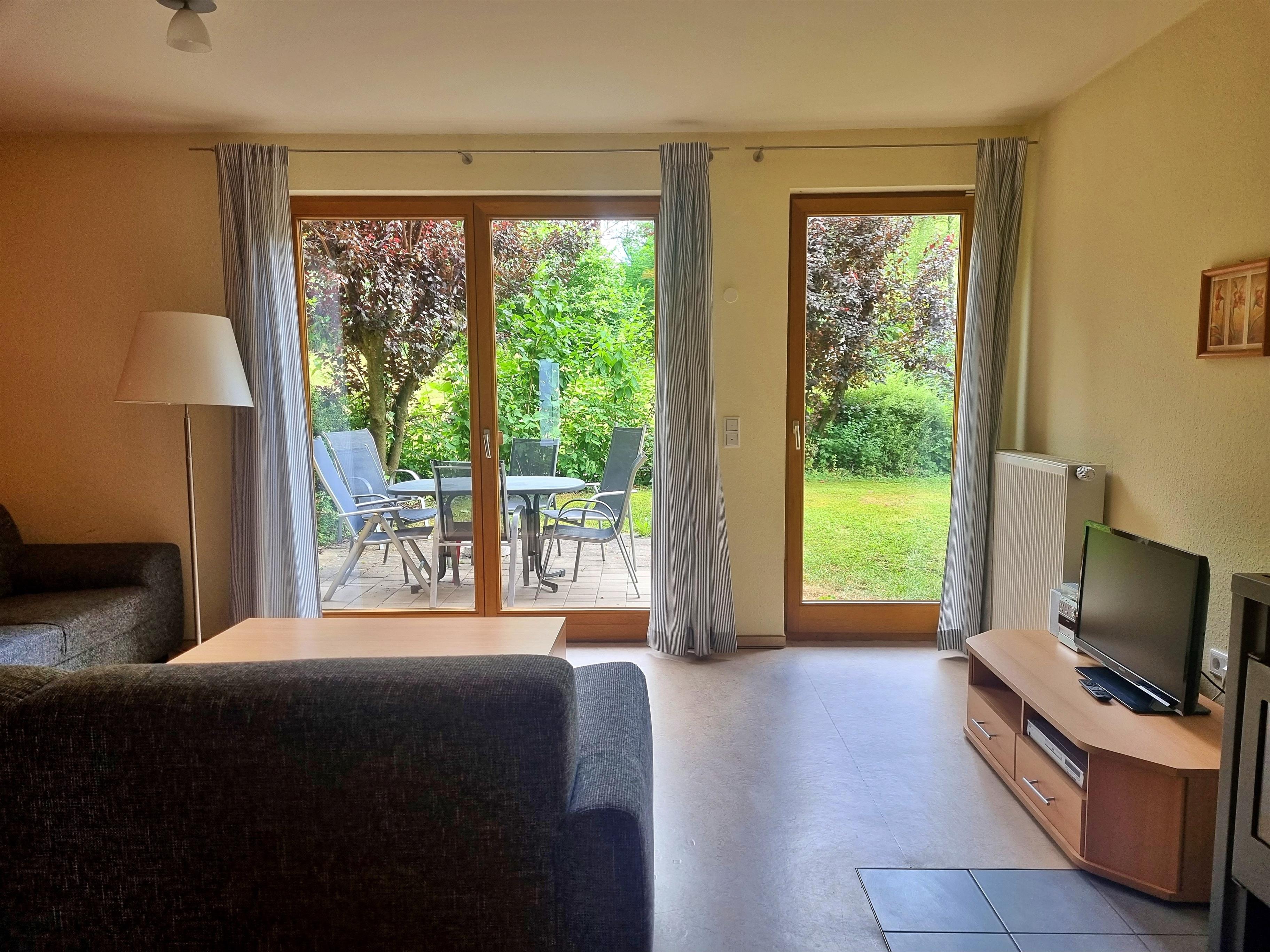 Ihre Ferienwohnung bietet alles, was Sie für einen komfortablen Aufenthalt brauchen: eine sonnige Süd-Terrasse mit Gartenblick, ein gemütlicher Wohnbereich mit Sat-TV, sowie eine voll ausgestattete Küche mit Kühlschrank, Geschirrspüler, Ofen, Kaffeemaschine und Wasserkocher.