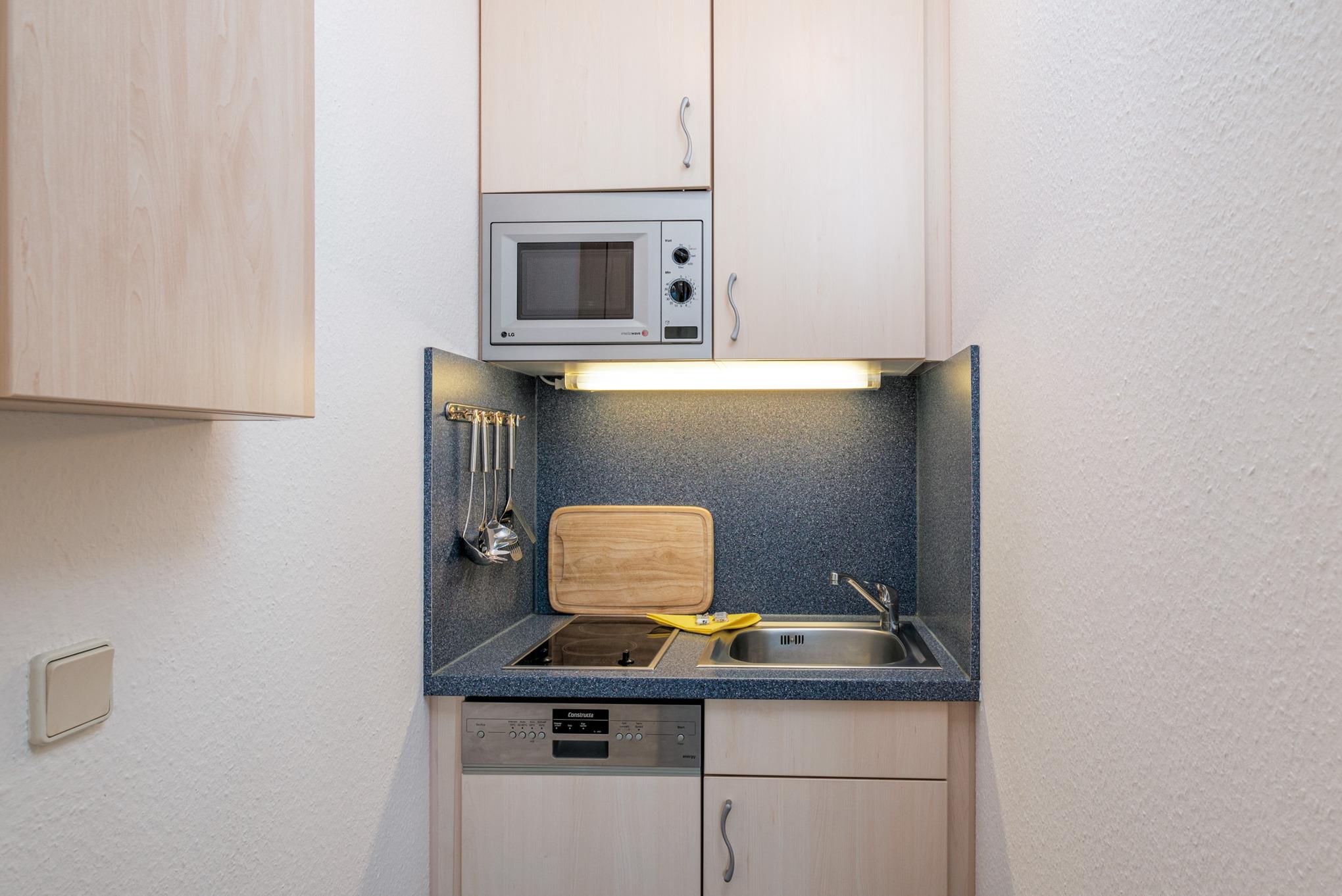 Die Pantryküche ist mit einem Geschirrspüler und Mikrowelle eingerichtet.