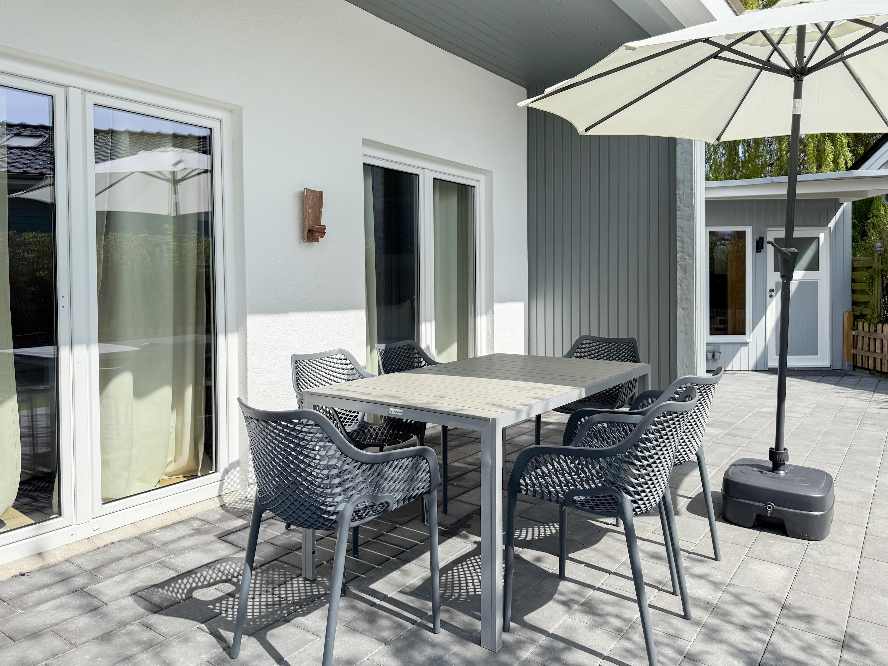 Mit circa 90 qm Wohnfläche, einem schönem eingewachsenem Garten in Südwestausrichtung, großer Terrasse und separatem Saunahaus, eignet es sich bestens für Familien und bietet ausreichend Platz für 5-6 Personen inklusive Kindern. Mittelpunkt des Hauses bildet der großzügige Wohnbereich mit riesigen Fensterflächen und wunderschönem Blick in den weitläufigen, eingezäunten Garten. Helle Räumlichkeiten, Echtholzböden und die geschmackvolle Einrichtung schaffen eine[nbsp] Atmosphäre zum Wohlfühlen. Es erwartet Sie eine hochwertige Wohnlandschaft, ein Kaminofen für gemütliche Abende und eine zeitgemäße Ausstattung wie TV, Bluetooth Lautsprecher, Radio und WLAN.[nbsp] Der großzügig angelegte Außenbereich verfügt über eine[nbsp] überdachte Terrasse in Südwest Ausrichtung mit reichlich Platz für gemütliche Stunden und einen schönen Garten mit Sonnenliegen und Gartenmöbeln. Erholung und Entspannung finden Sie im Saunahaus, das ebenfalls im Garten untergebracht ist. Die offene Einbauküche[nbsp][nbsp]ist bestens ausgestattet(Geschirrspüler, Backofen, Mikrowelle) und der integrierte Essbereich bietet ausreichend Platz für 6 Personen. Das Haus verfügt über drei[nbsp][nbsp]kleine Schlafzimmer mit Doppelbetten (160x200) und alle [nbsp]Fenster sind mit Plissees und Verdunkelungsvorhängen/Rollos versehen. Ein Schlafzimmer ist zusätzlich mit einem TV ausgestattet und verfügt über ein modernes Duschbad ensuite.[nbsp] Das zweite Duschbad ist über den Flur zu erreichen. Der vorhandene Stauraum für die Urlaubsgarderobe ist in zwei Schlafzimmern relativ gering.