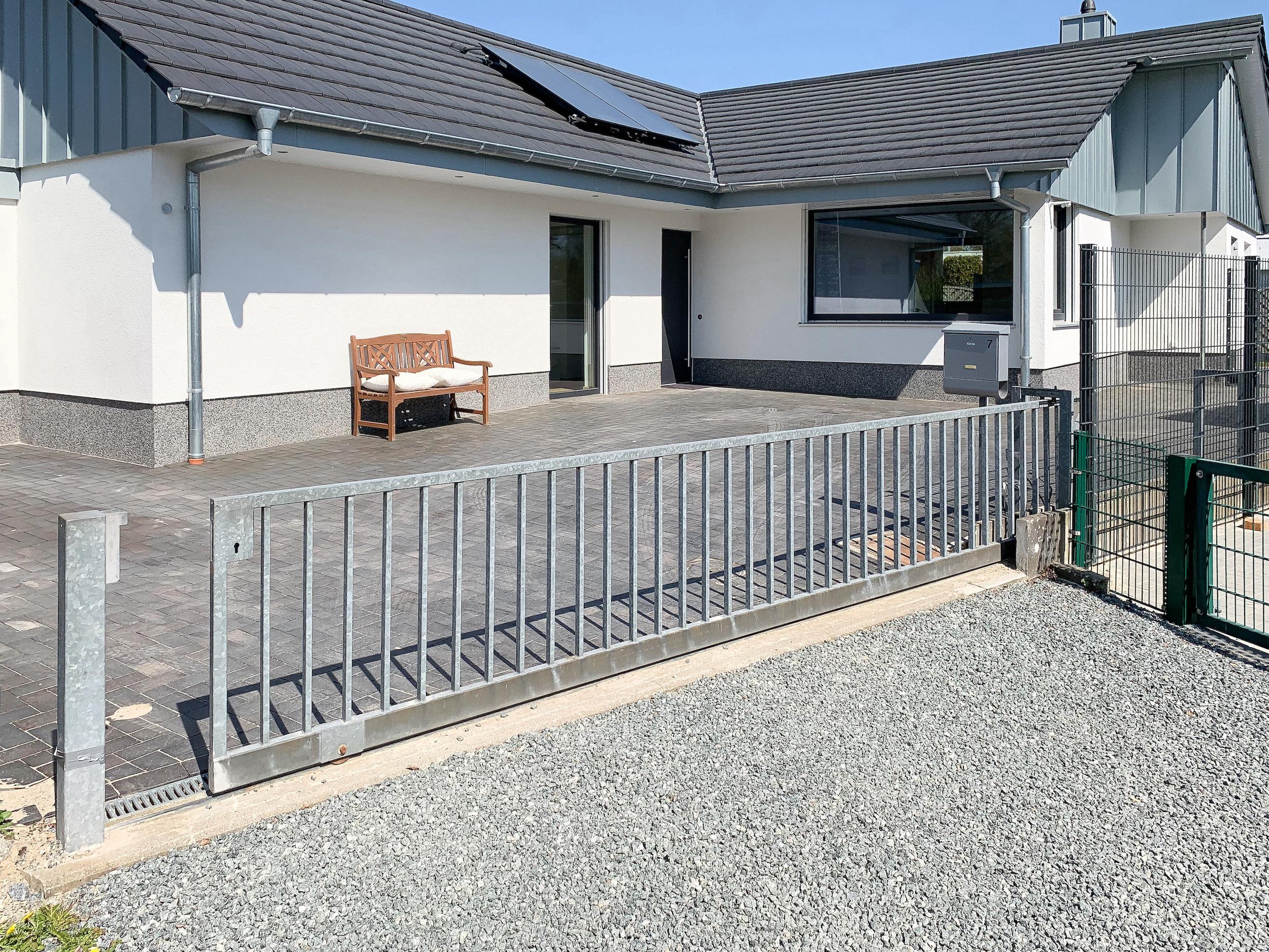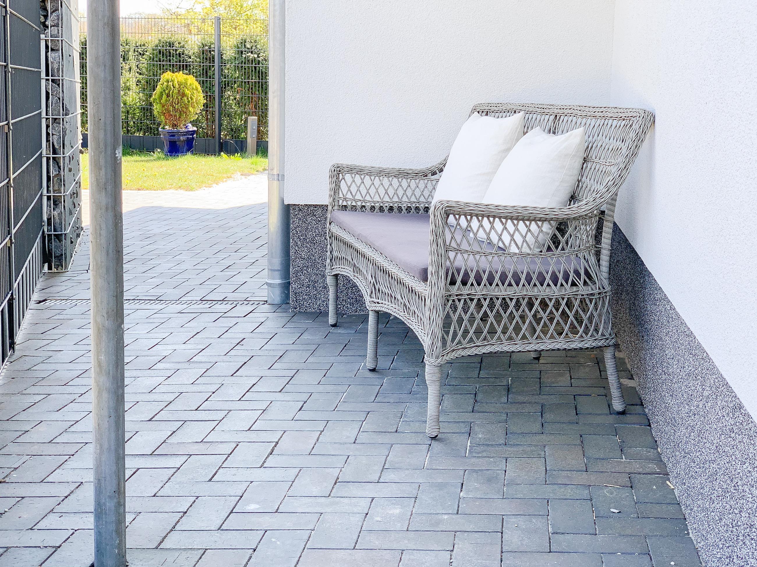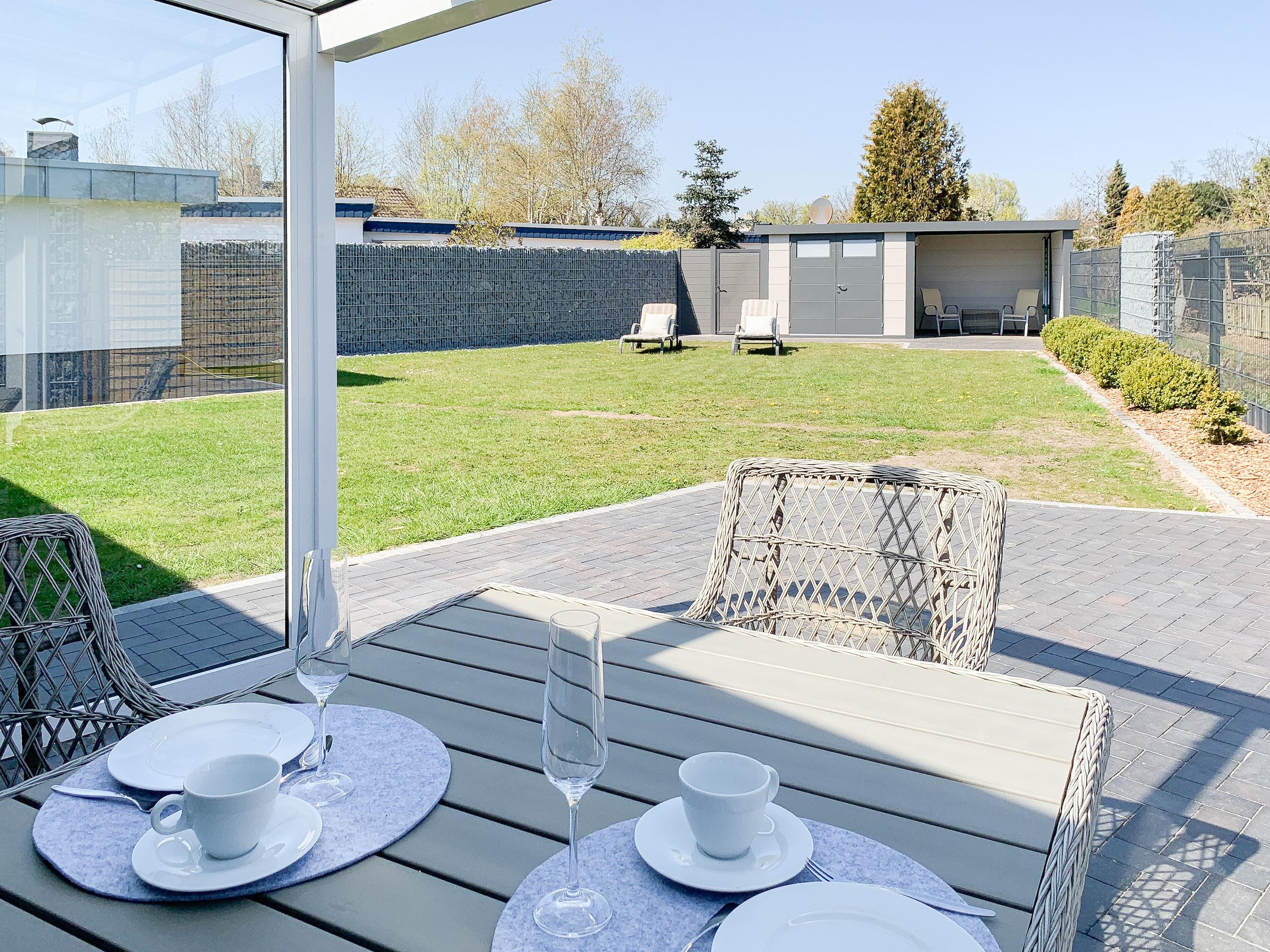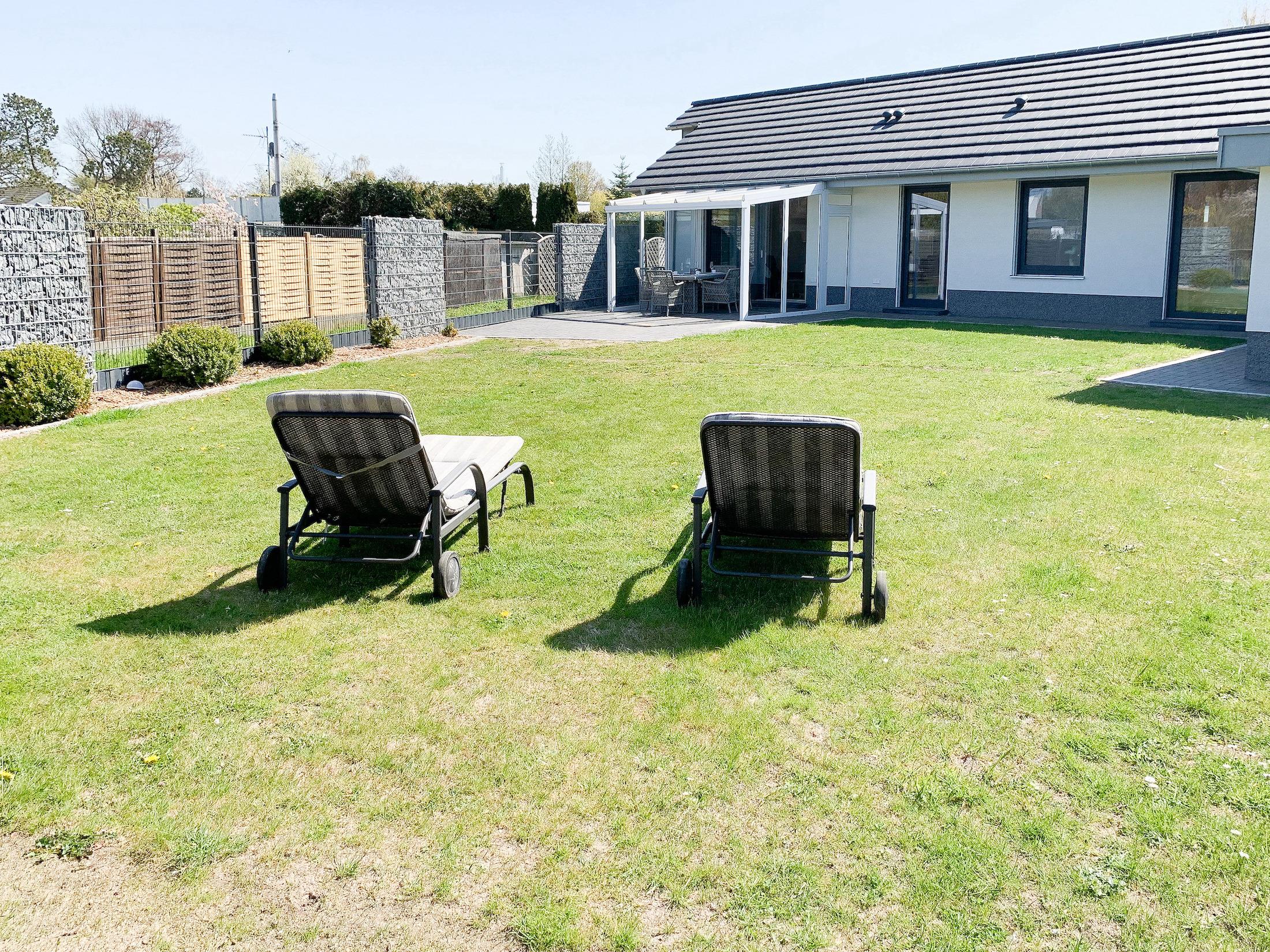 Der weitläufige Außenbereich ist mit Gartenmöbeln und Sonnenliegen ausgestattet. Fahrräder können sicher und trocken auf dem Grundstück abgestellt werden. Zwei Parkplätze sind vorhanden.