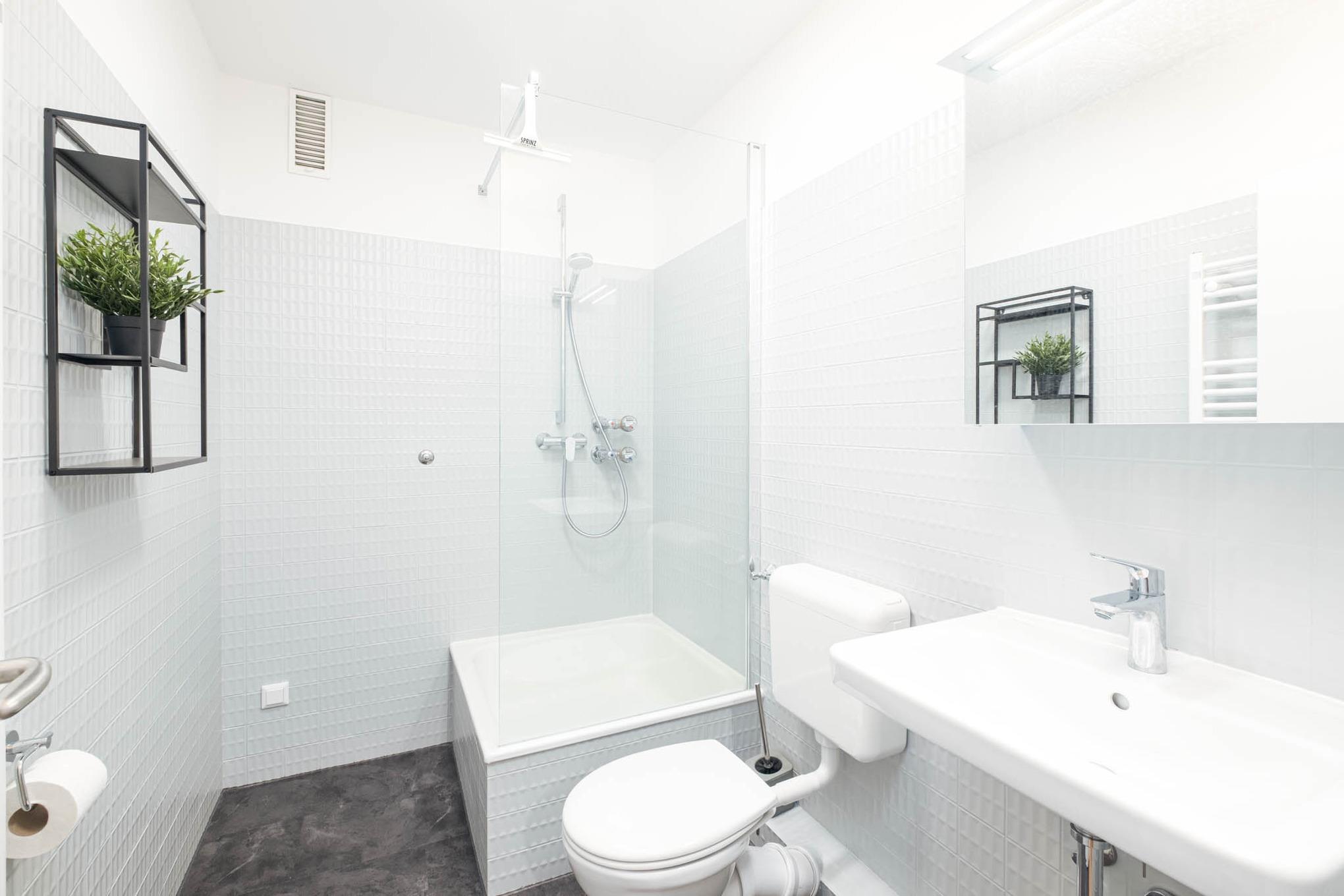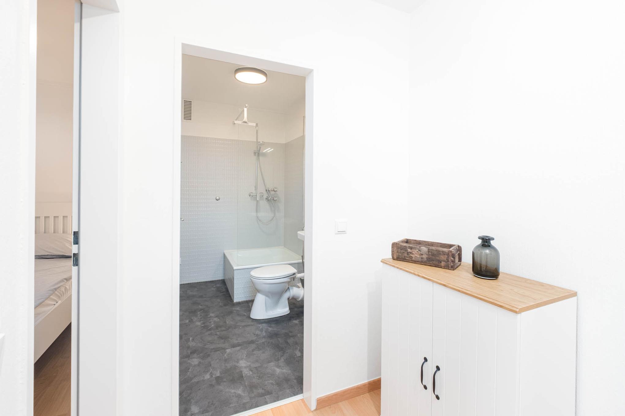 Im schicken Badezimmer erwartet Sie eine Dusche und WC.