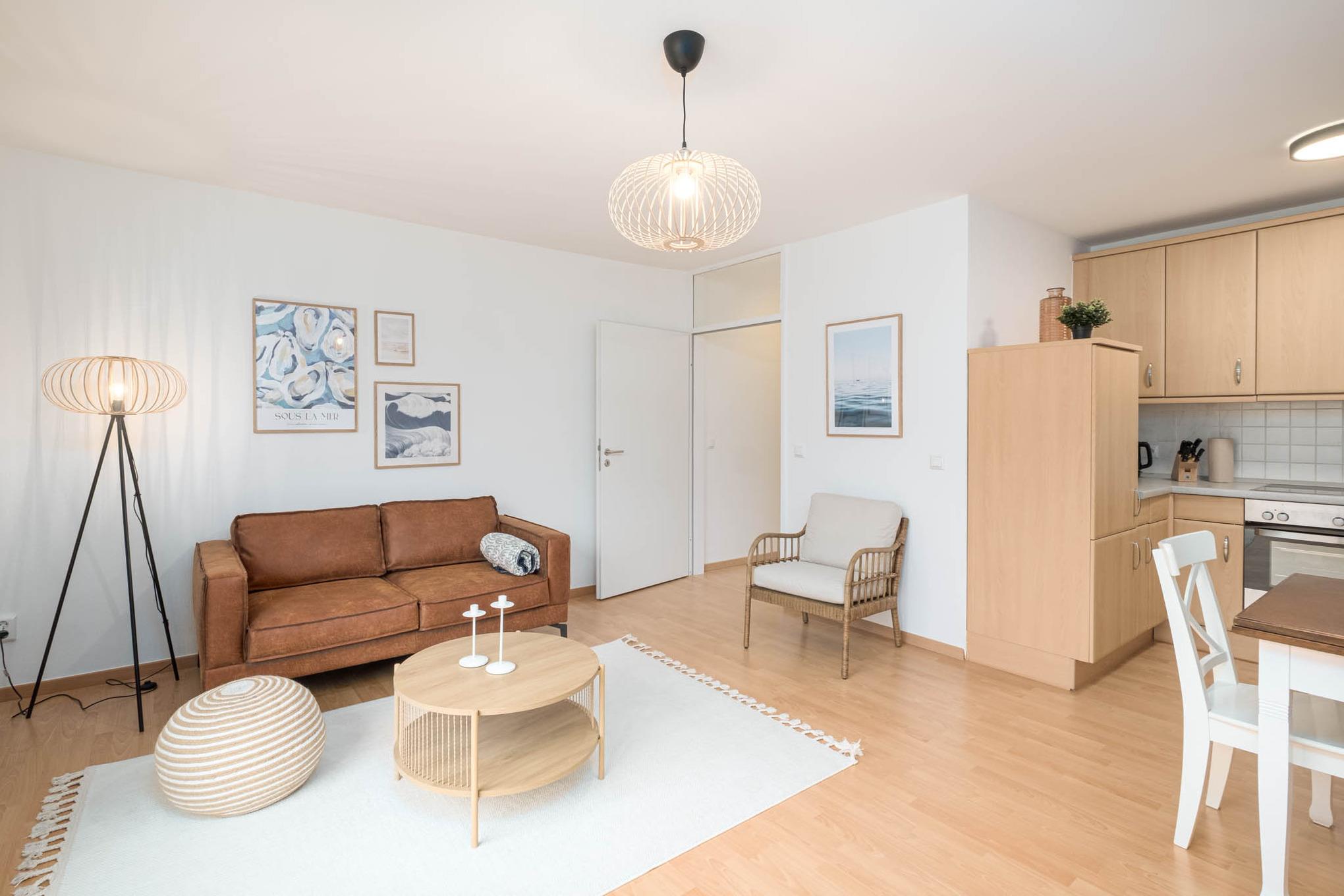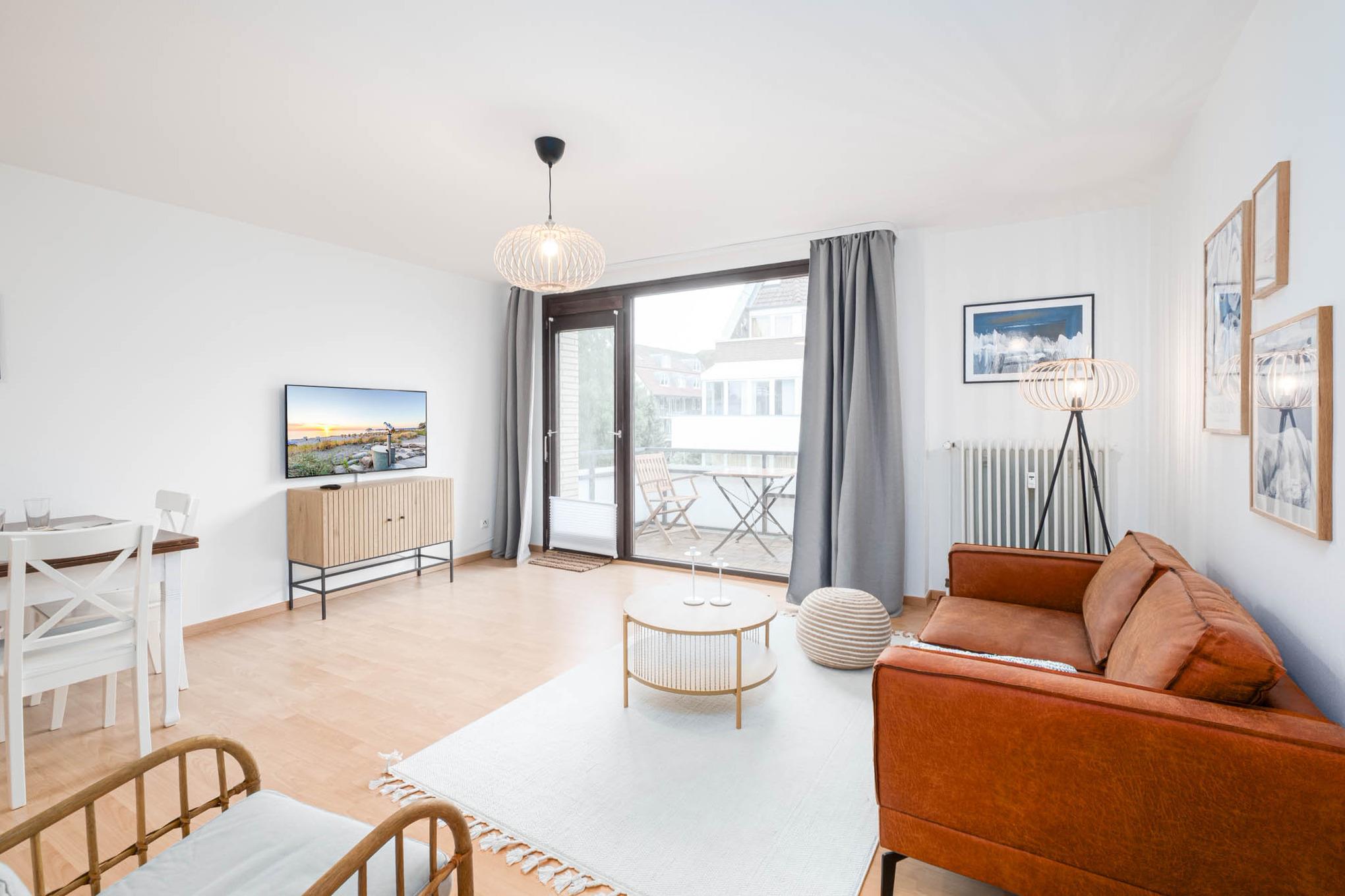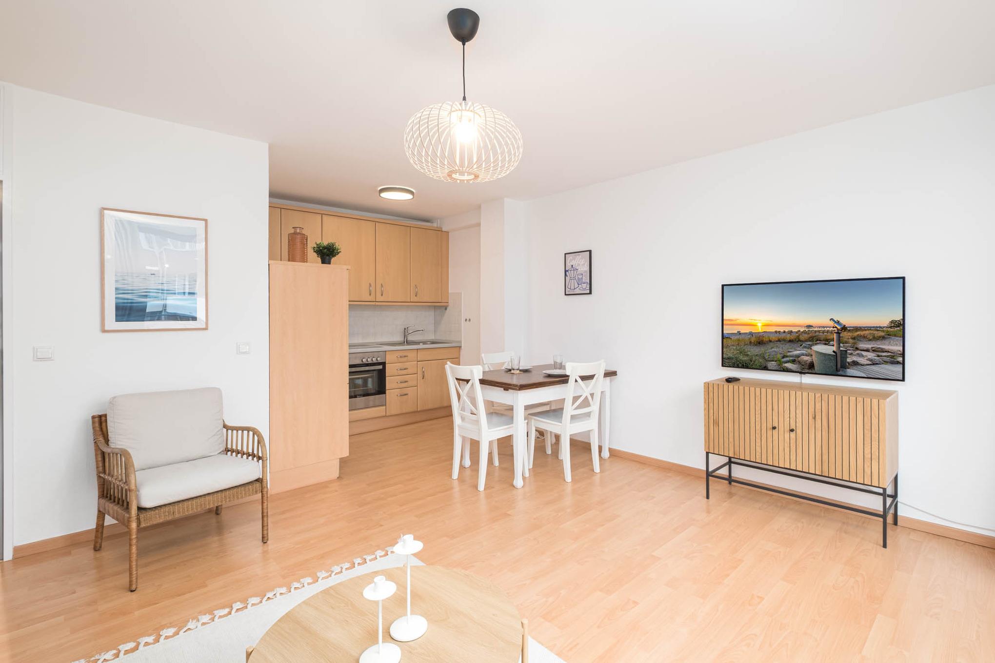 Es steht Ihnen eine gemütliche Couchgarnitur zur Verfügung, ebenso wie ein Flatscreen-TV über welchen Sie via WaipuTV Zugriff auf das Livefernsehen haben. Ebenso können Sie die Smart-TV Funktionen nutzen. Aus dem offenen Wohnbereich erreichen Sie den Balkon in Nord-Ost-Ausrichtung. Hier genießen Sie den ersten Kaffee des Tages und starten entspannt in Ihren Urlaubstag.