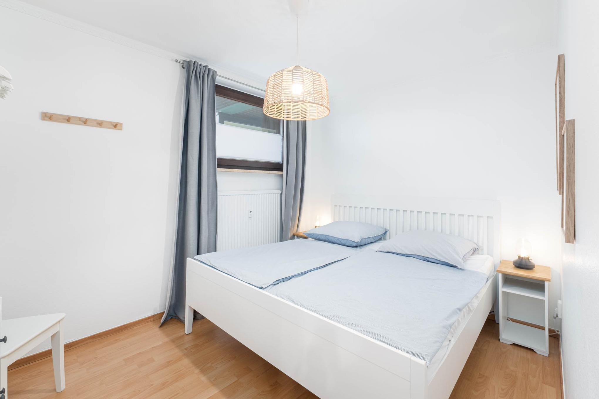 Wir heißen Sie auf der zweiten Etage des Hauses ganz herzlich in dieser 2-Zimmer Niendorf/Ostsee Ferienwohnung "Haus Boy, Appartement 7" willkommen. Über die kleine Diele erreichen Sie das Schlafzimmer mit einem Doppelbett (180 x 200 cm). In der offenen Garderobe haben Sie genug Platz für Ihre Urlaubskleidung.