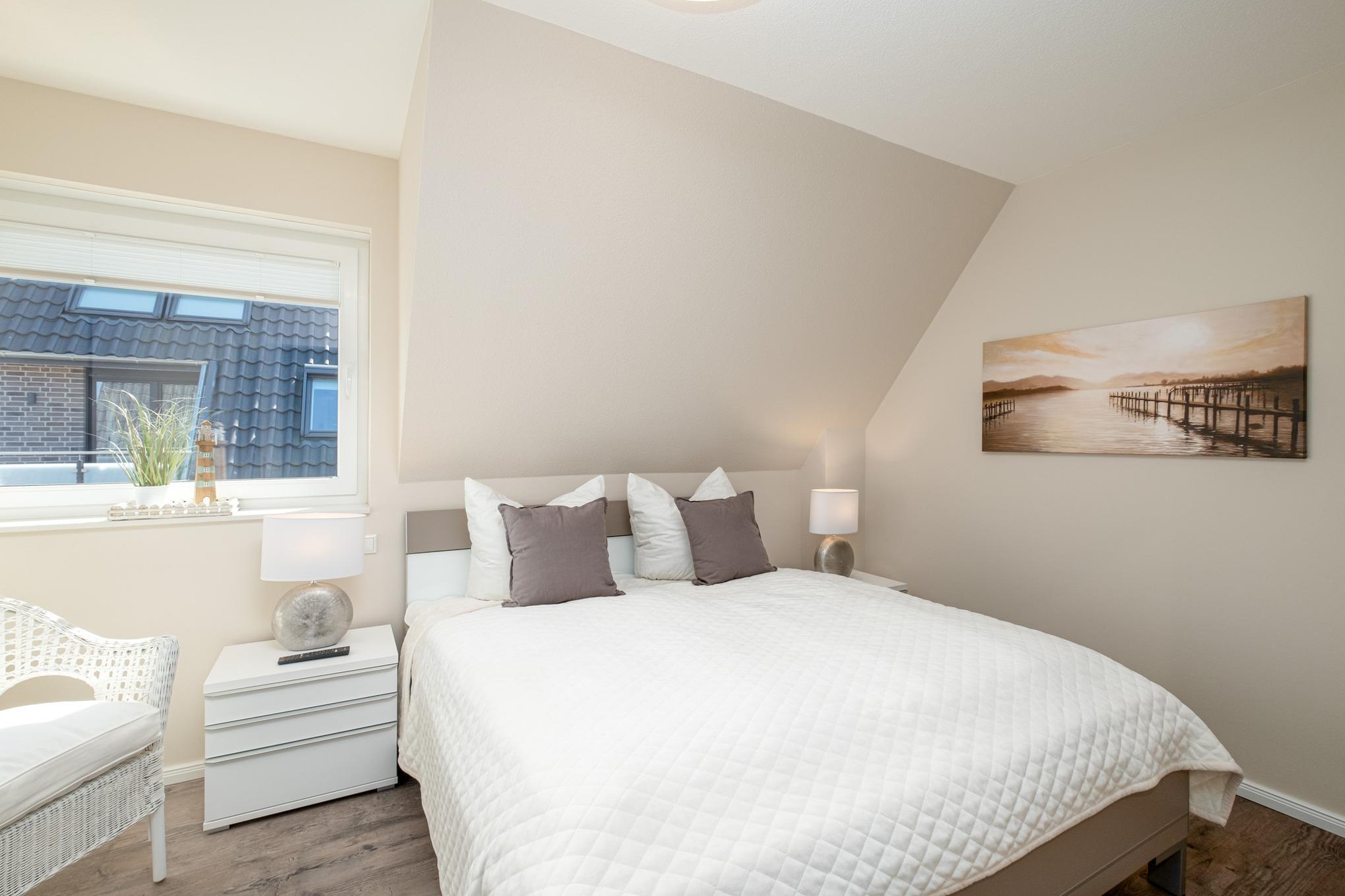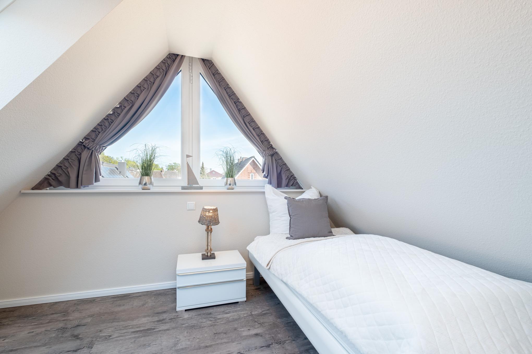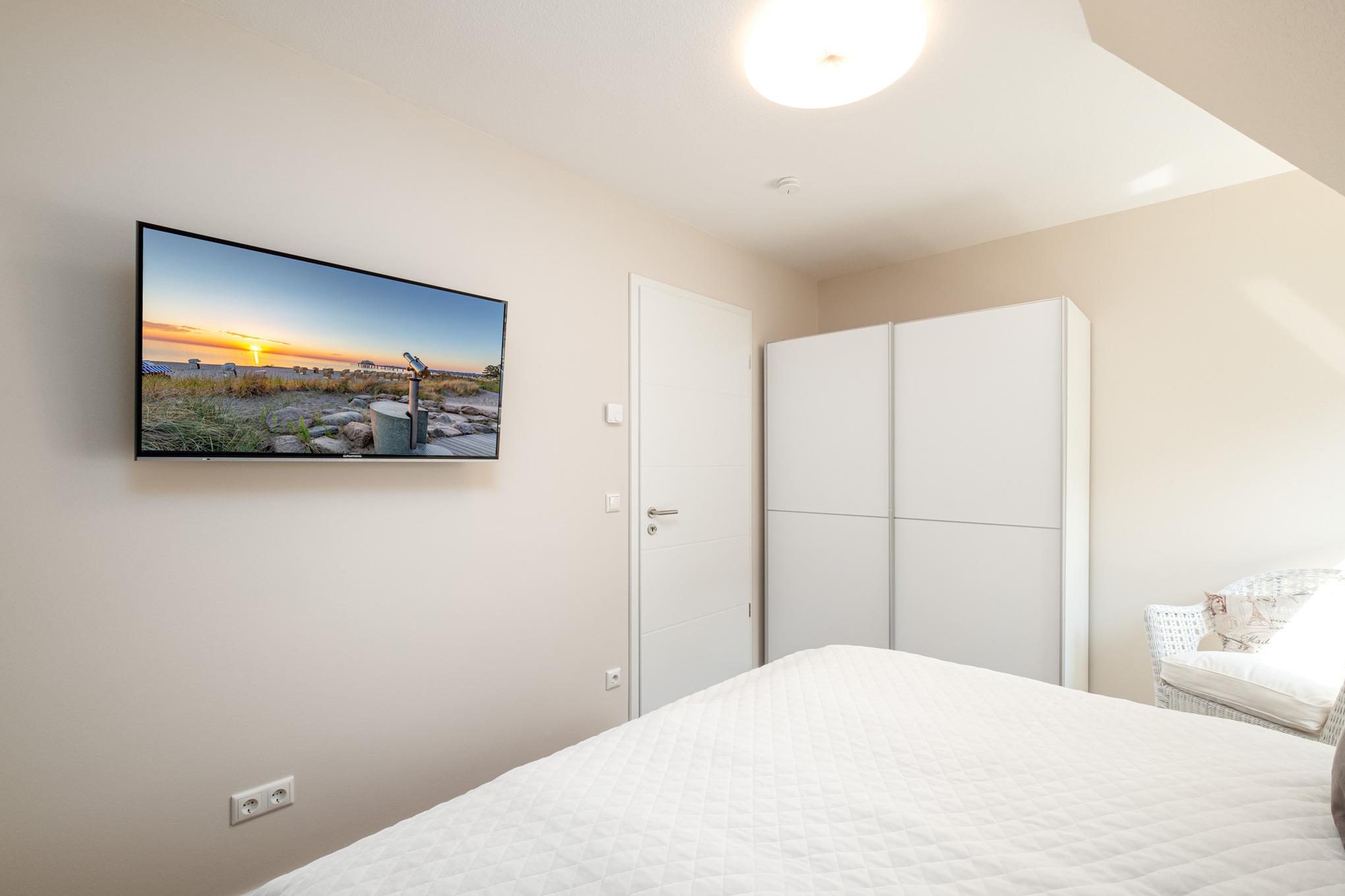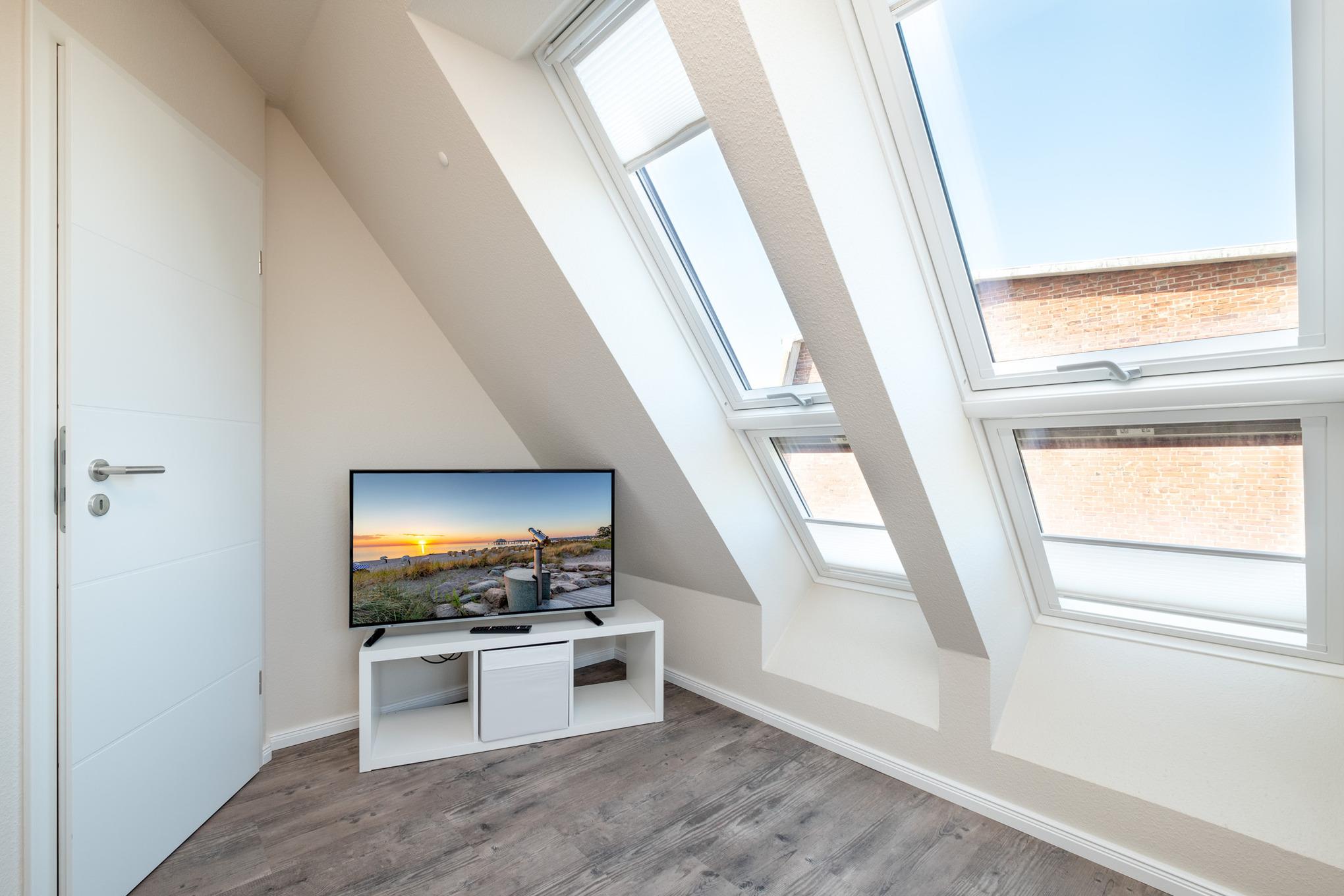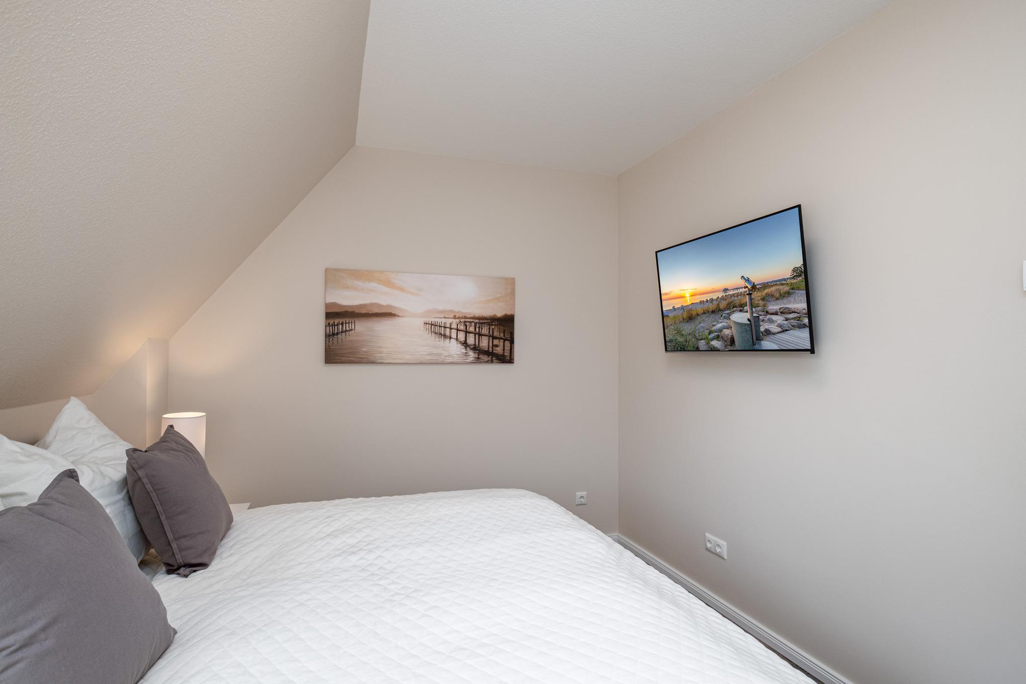 Das Schlafzimmer II befindet sich im Dachgeschoss der Niendorf/Ostsee Ferienwohnung und ist mit zwei Einzelbetten (je 100x200cm) und einem zusätzlichen Flatscreen-TV ausgestattet. Zudem können Sie vom Schlafzimmer II das Meer sehen.