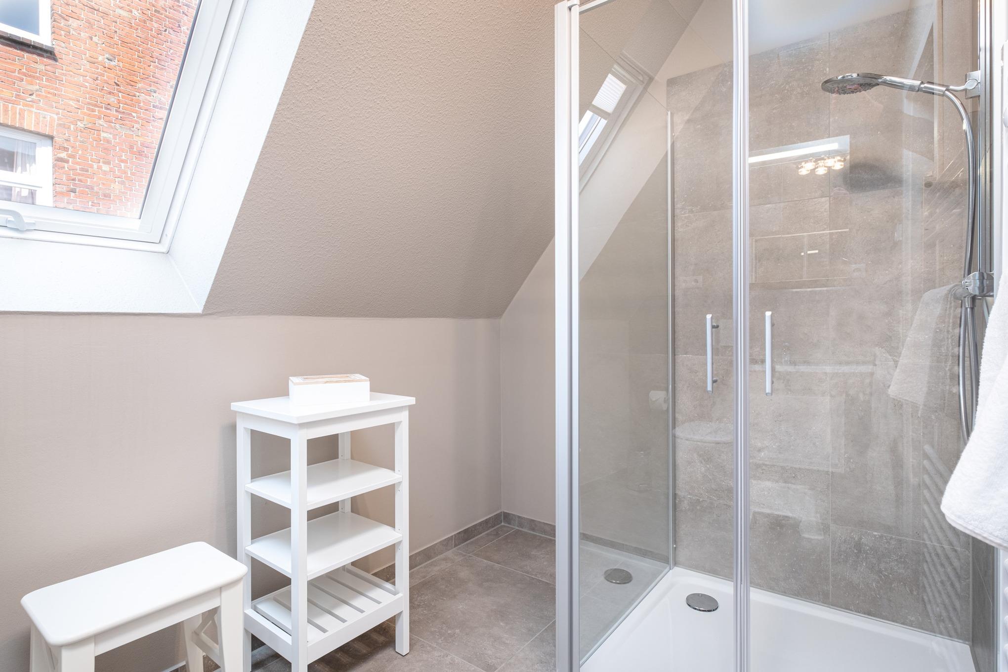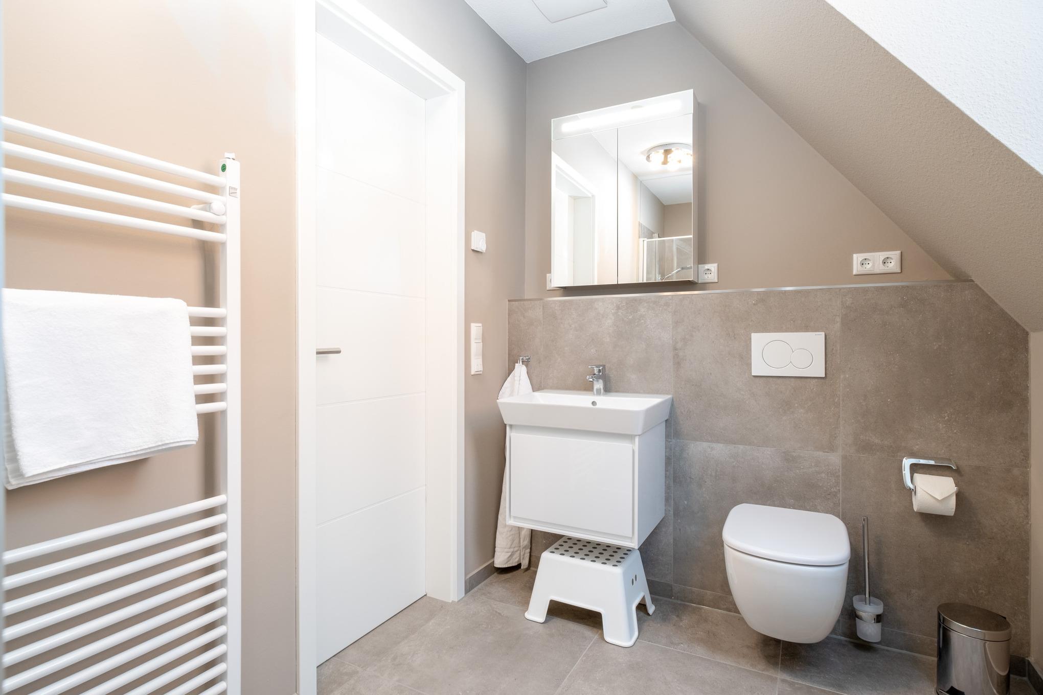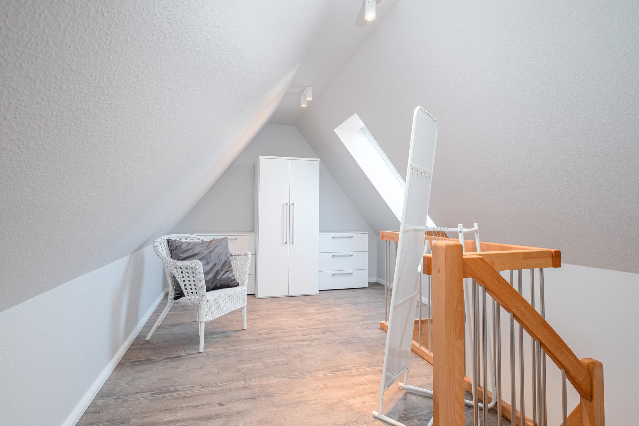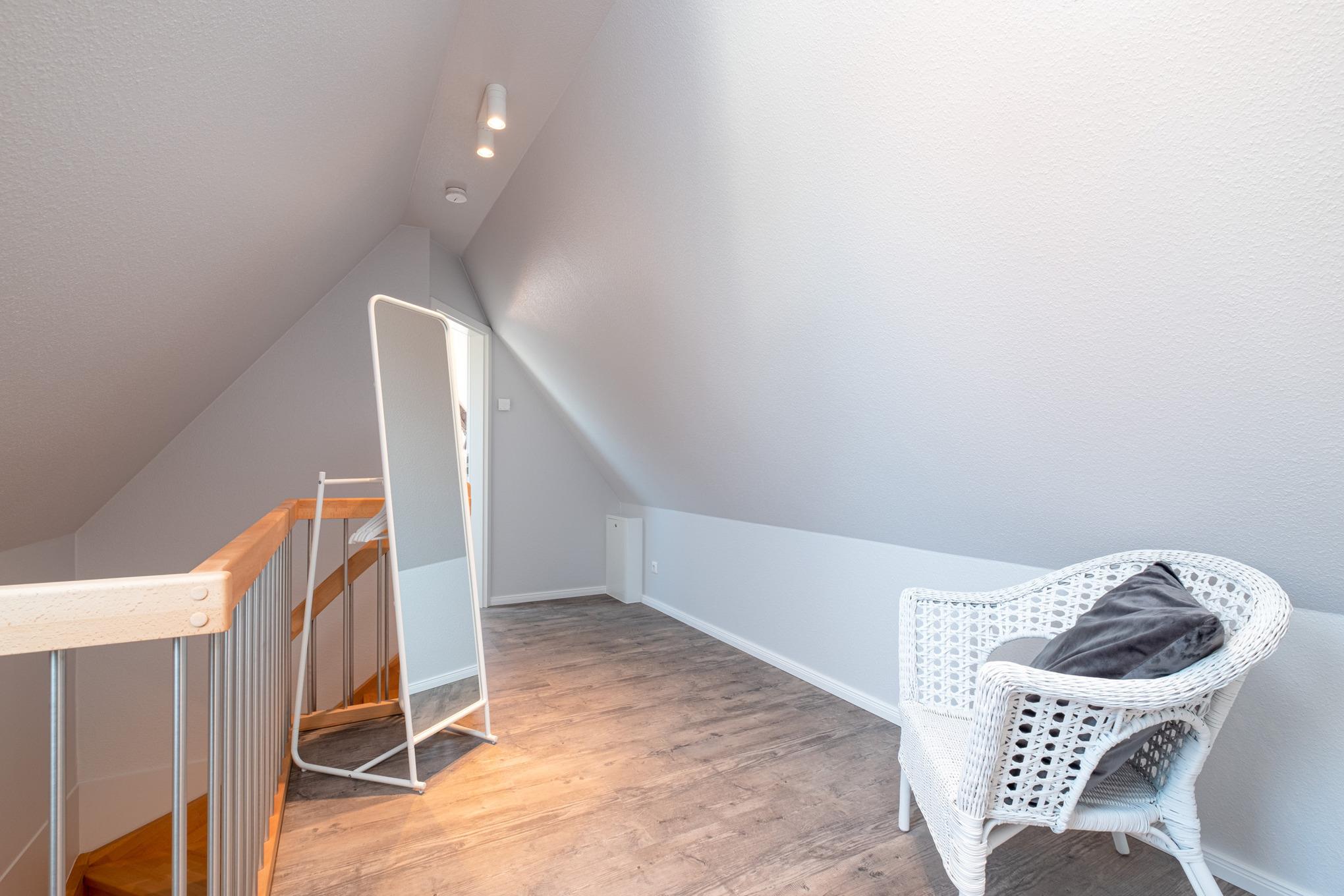 Darüber hinaus wird das Obergeschoss der Niendorf Ferienwohnung durch ein Bad mit Dusche/WC abgerundet.