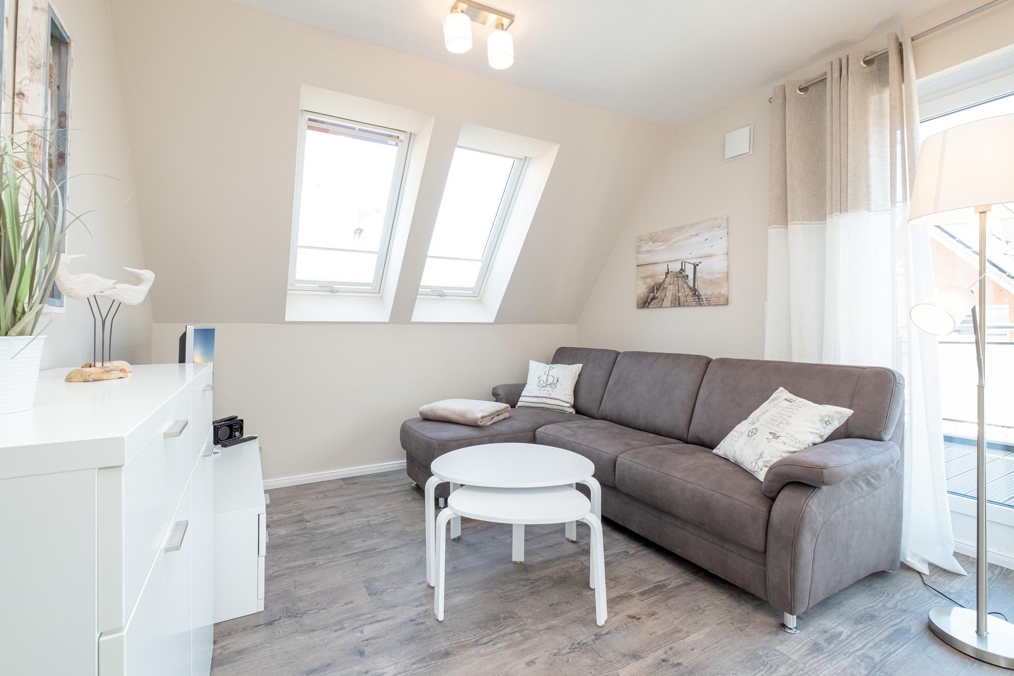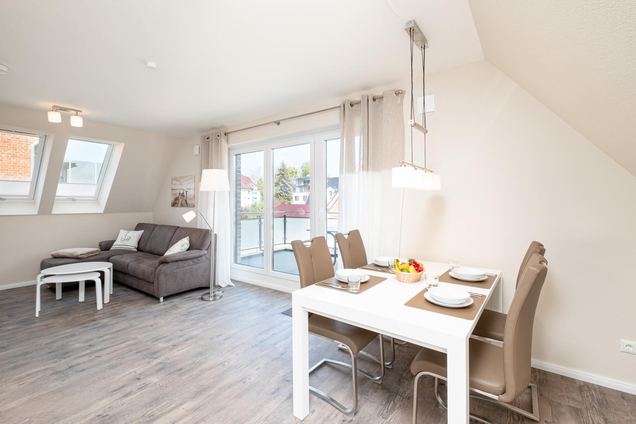 Das Herzstück des geschmackvoll und hochwertig eingerichteten Hauses bietet das moderne Wohnzimmer mit Couchgarnitur, Internetradio, Flatscreen-TV und Essbereich. Ebenso haben Sie vom Wohnzimmer der Ferienwohnung Zugang zum möblierten Balkon von dem Sie auch Meerblick haben.