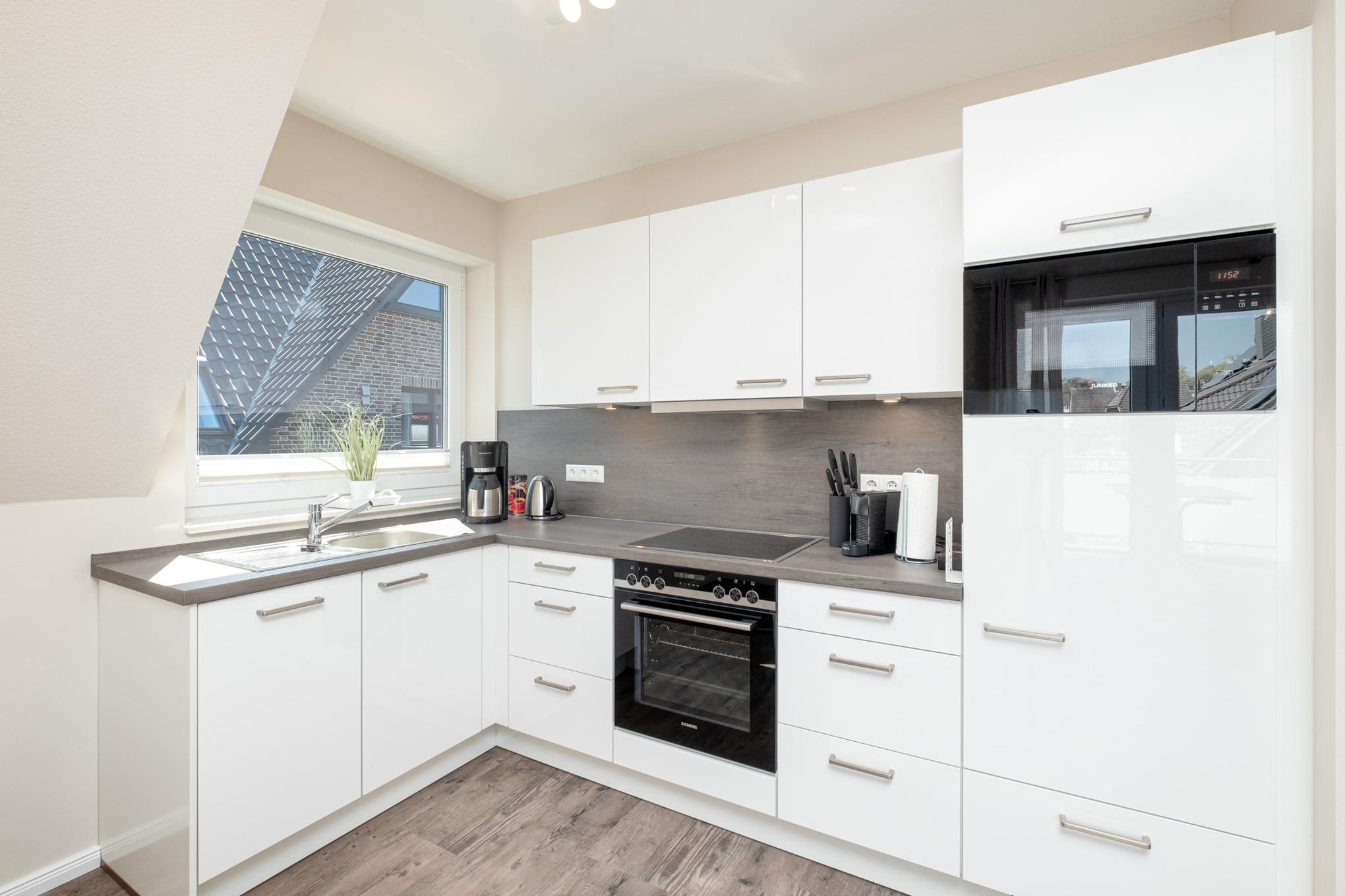 Die offene Küche ist mit allem Komfort ausgestattet u.a. sind Ceranfeld, Backofen, Mikrowelle und Geschirrspüler vorhanden.