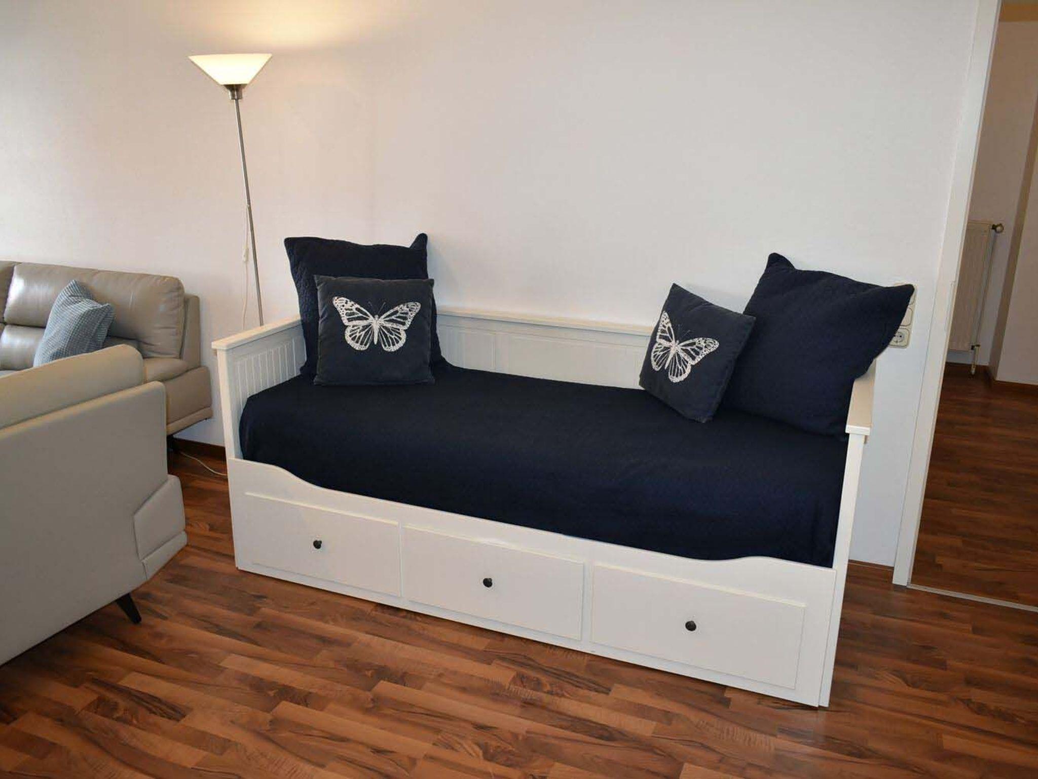Wohnzimmer: 2 Hocker, 4 Plattenherd mit Backofen, Anrichte, Bank, Brotmaschine, CD-Ständer, Couch, Dolce Gusto Caps Maschine, Dunstabzugshaube, Eierkocher, Esstisch, Flachbildschirm, Geschirr, Glasvitrine, Kabel-TV, Kaffeemaschine, Kochtöpfe, Küchenzeile, Kühlschrank, Mikrowelle, Relaxsessel, Einzelbett mit Ausziehbett 2,00 x 0,80/1,60 m, Spülmaschine, Stereoanlage mit CD-Player, Toaster, Verdunklungsplissee, Wasserkocher