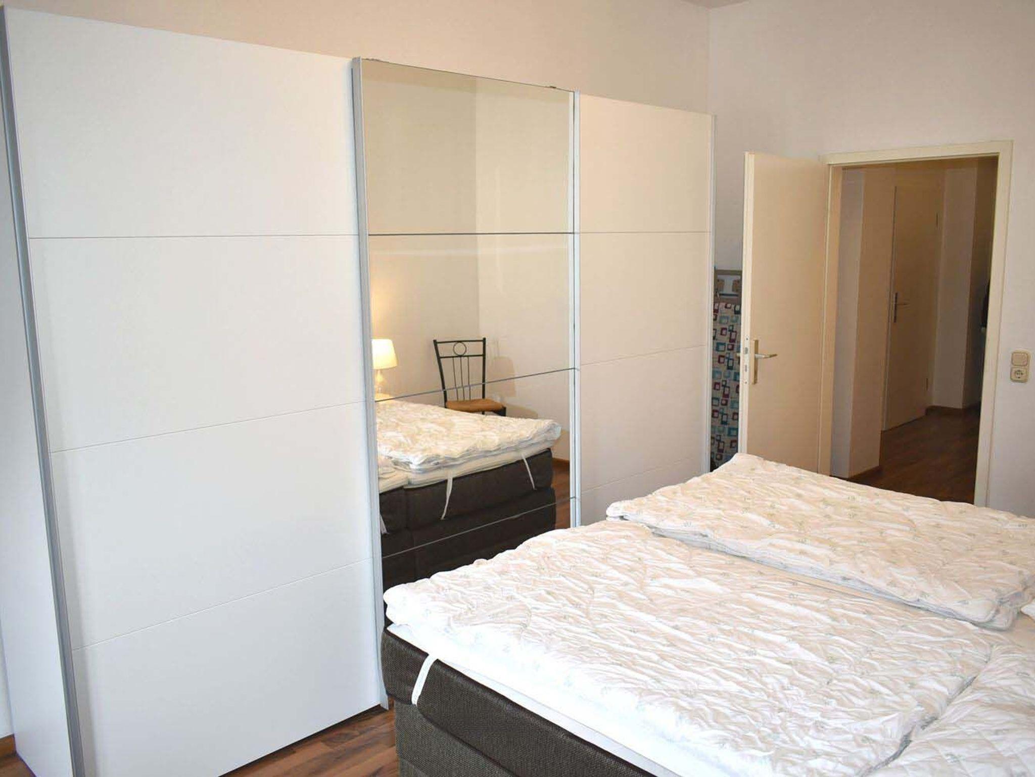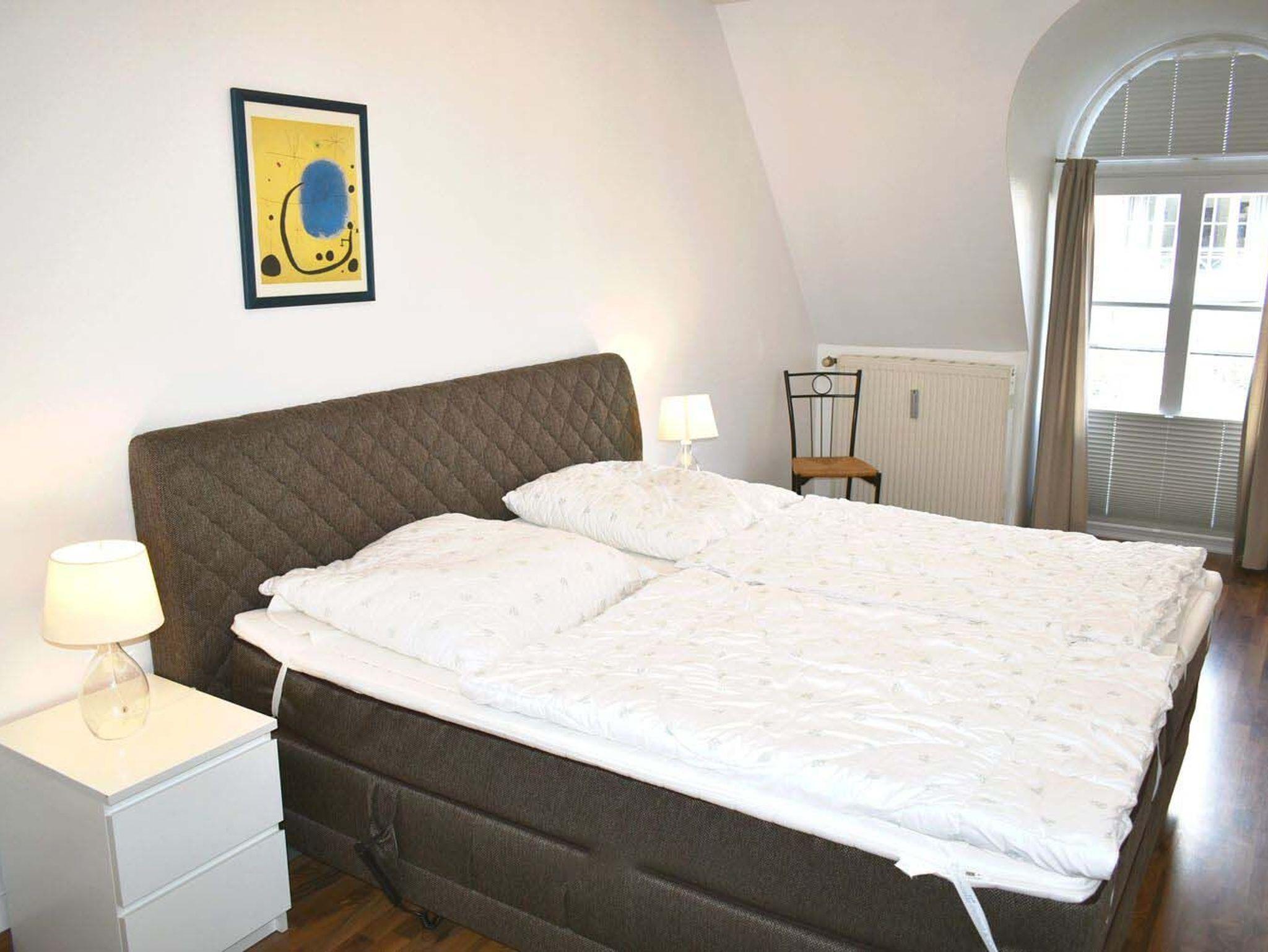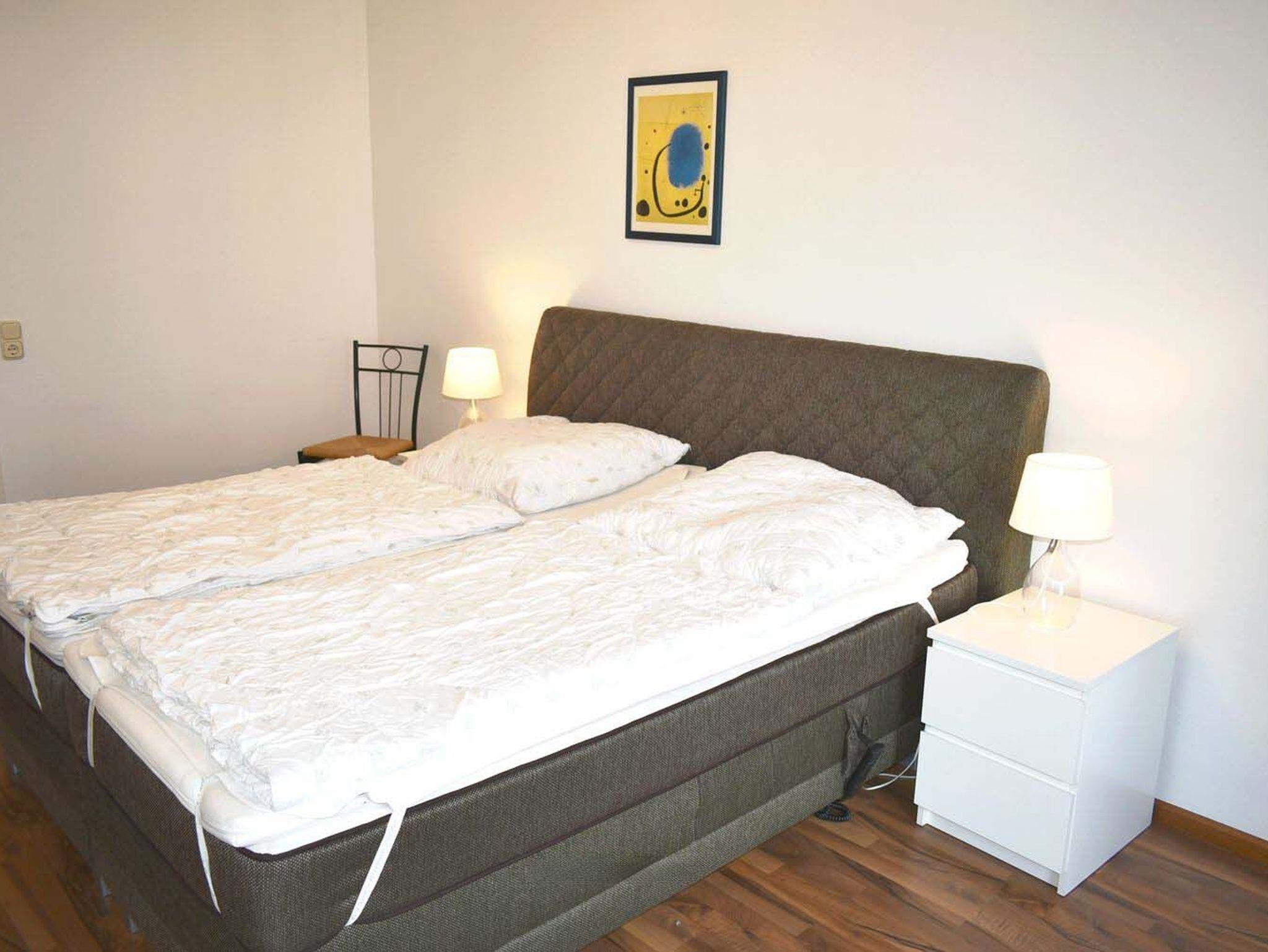 Schlafzimmer 1: 2 Matratzen, 2 Nachttische, 2 Stühle, Boxspringbett 2,00 x 1,80 m, Bügelbrett, Kleiderschrank, Radiowecker, Spiegel, Staubsauger, Verdunklungsplissee, Wäscheständer