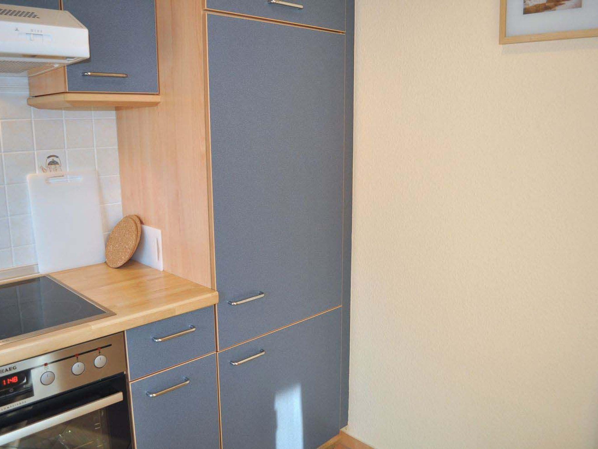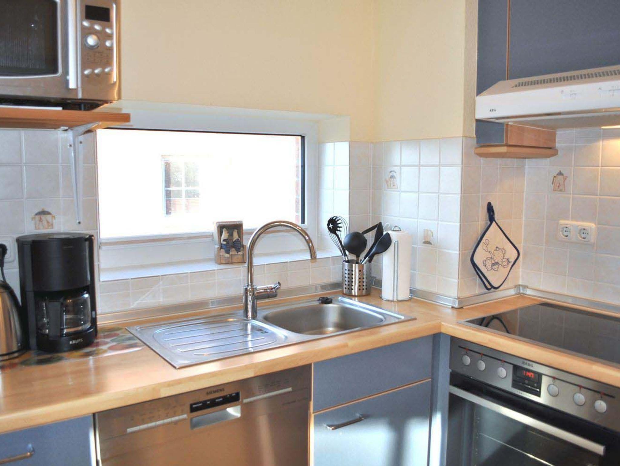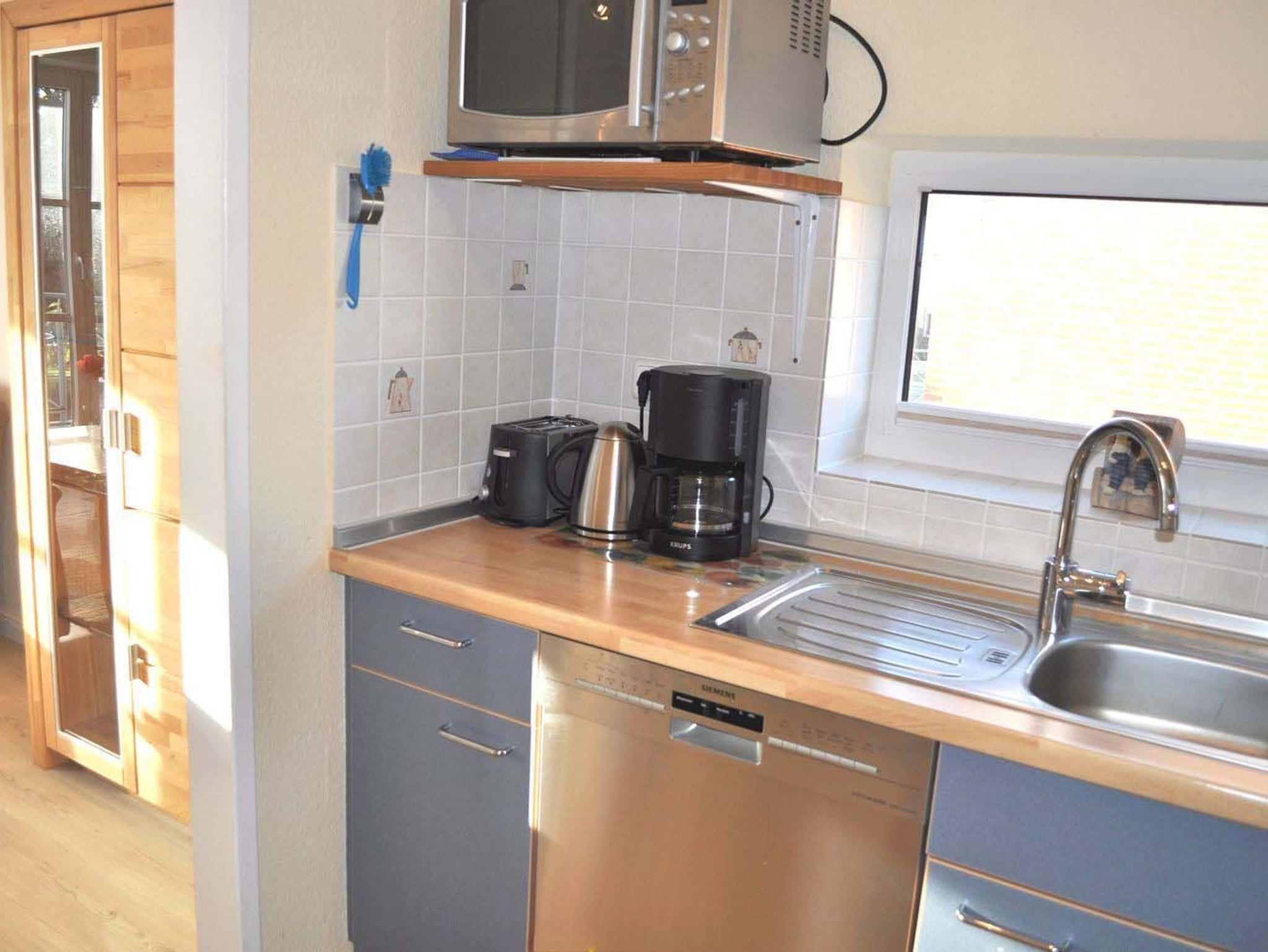 Küche: 4 Plattenherd mit Ceranfeld und Backofen, Dunstabzugshaube, Eierkocher, Einbauküche, Geschirr, Kaffeemaschine, Kochtöpfe, Kühlschrank mit 3* Gefrierfach, Mikrowelle, Rollregal, Spülmaschine, Toaster, Wasserkocher