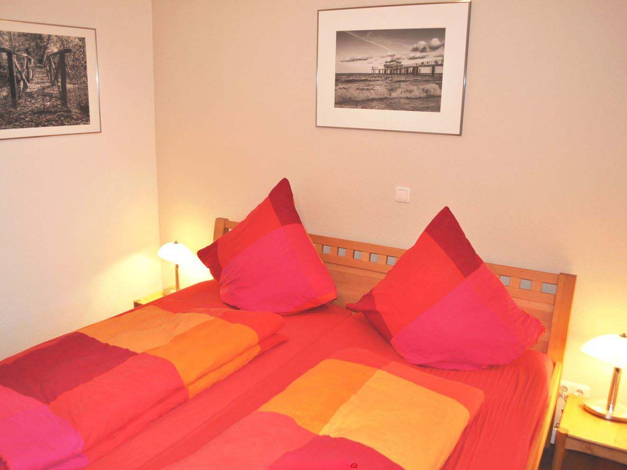 Schlafzimmer 1: 2 Matratzen, 2 Nachttische, 2 Nachttischlampen, Doppelbett 2,00 x 2,00 m, Kleiderschrank