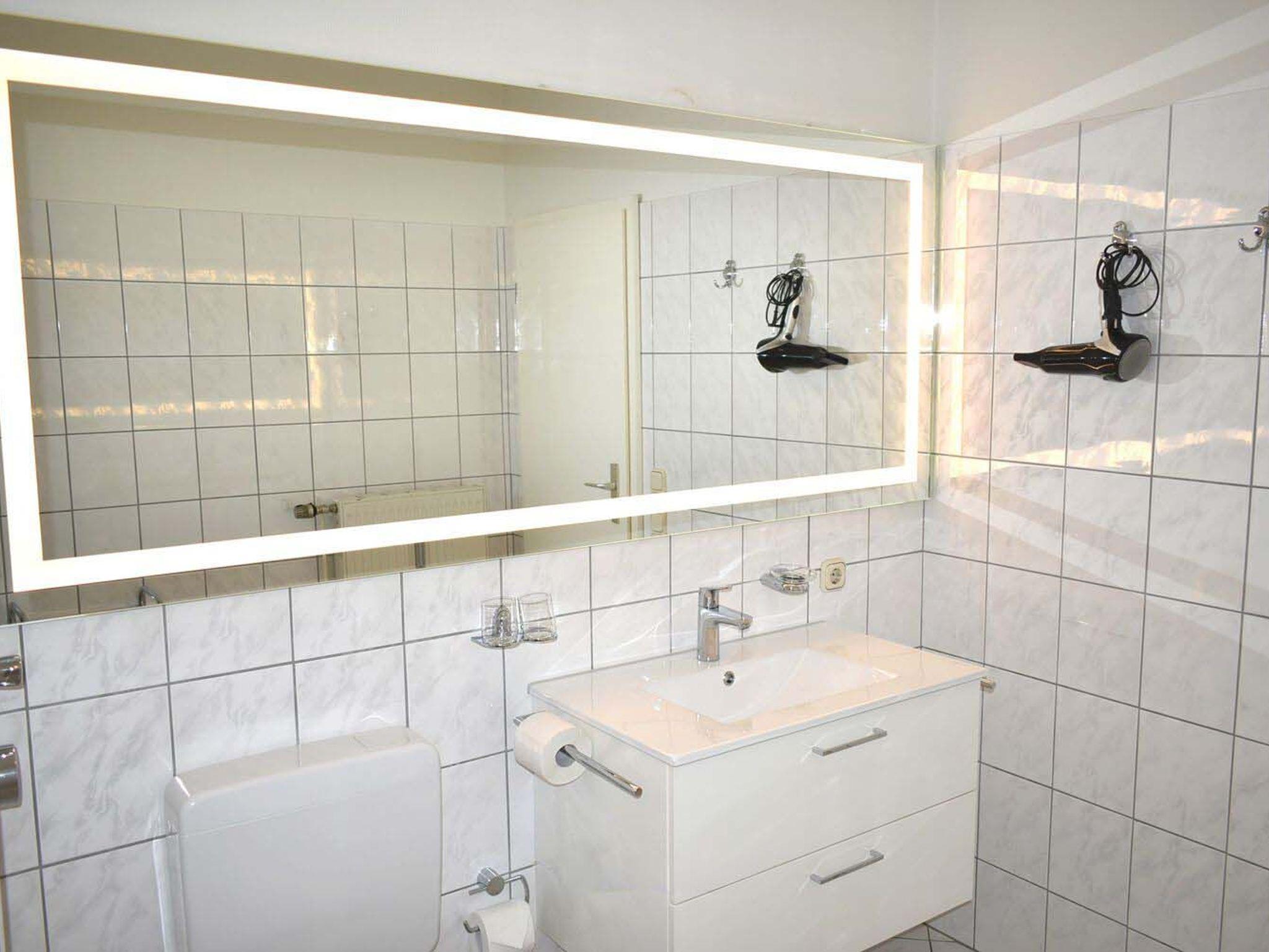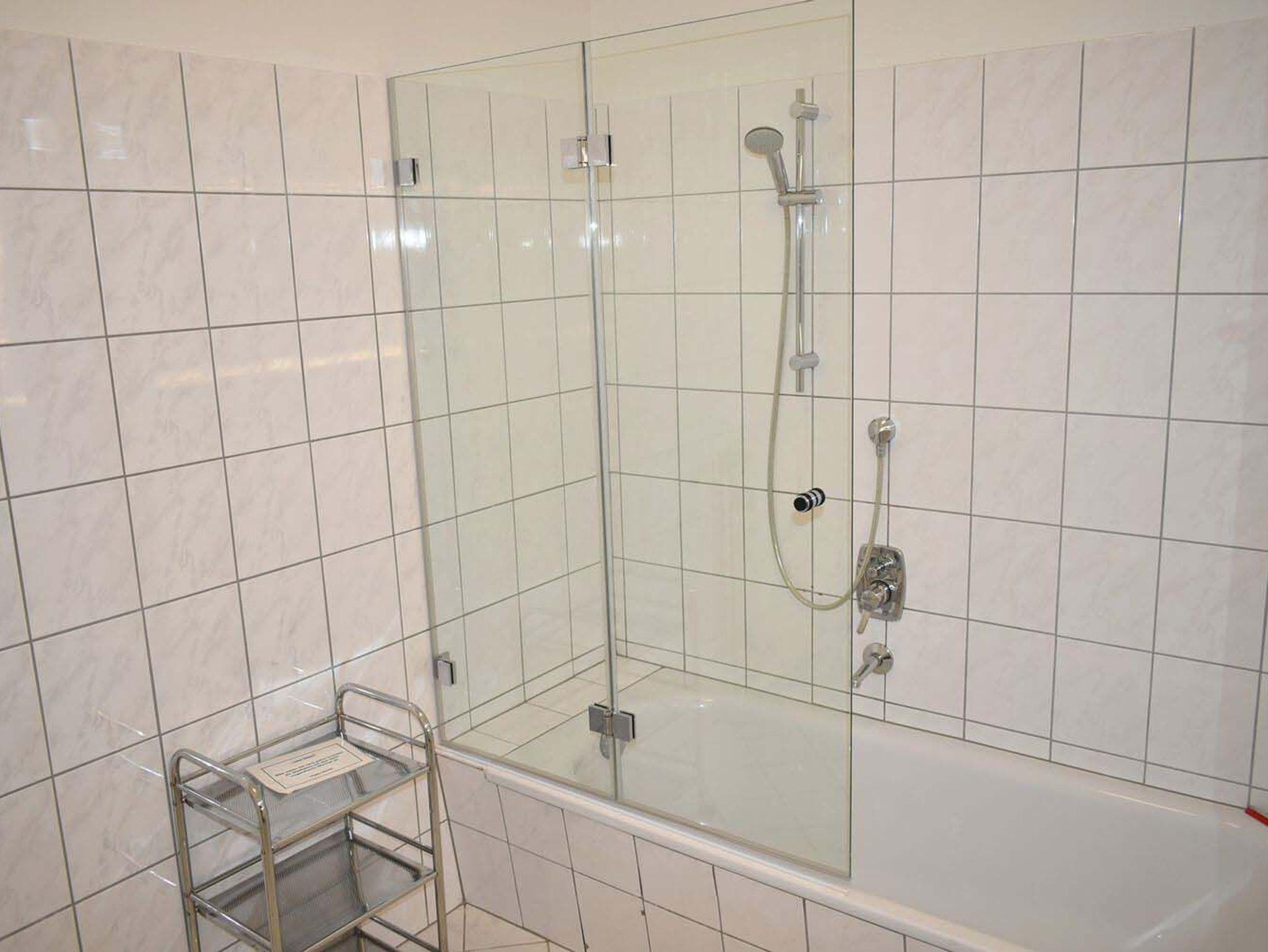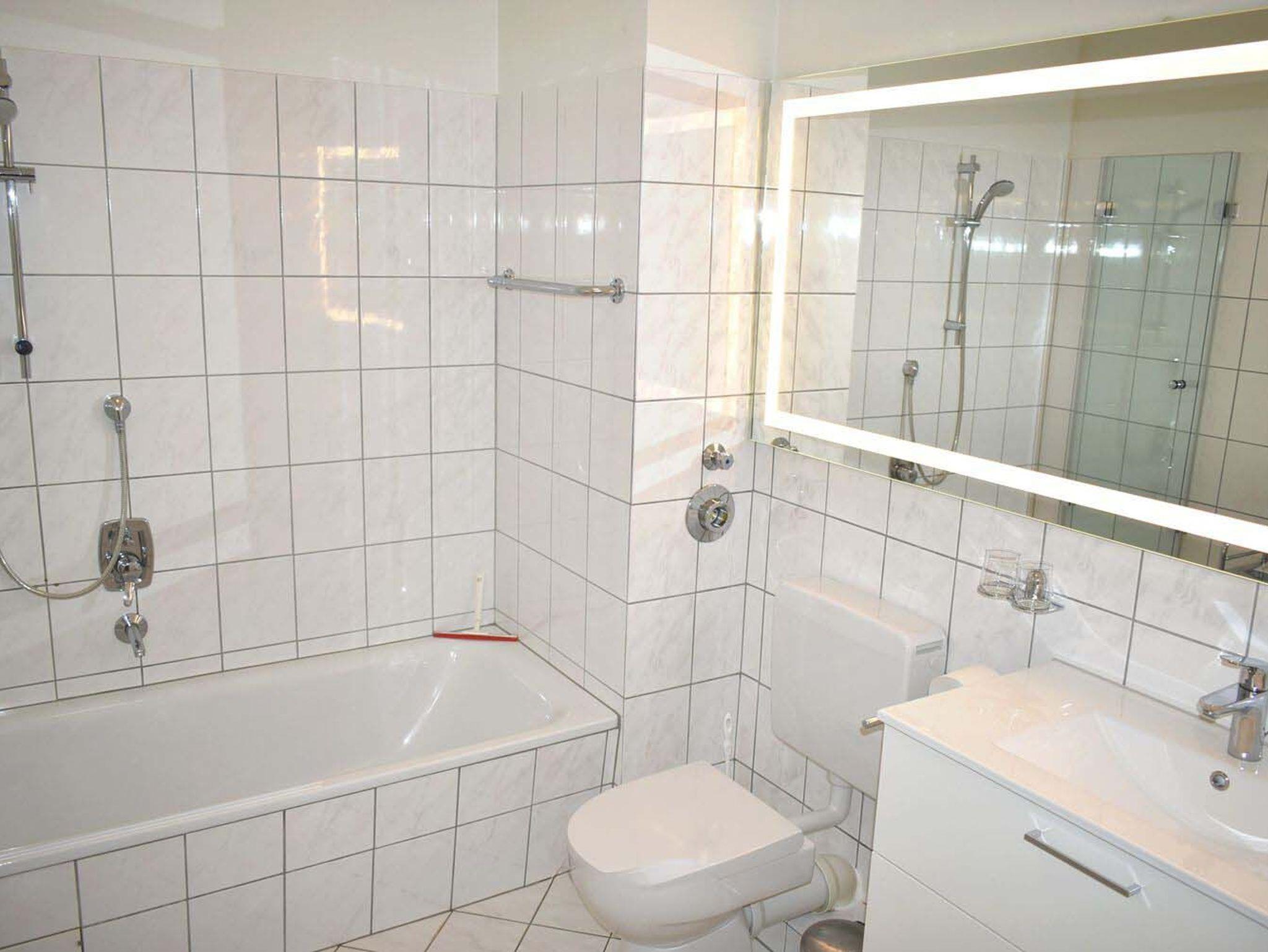Bad 1: Badewanne, Duschwand, Fön, Rollwagen, Spiegel, Waschbecken, WC