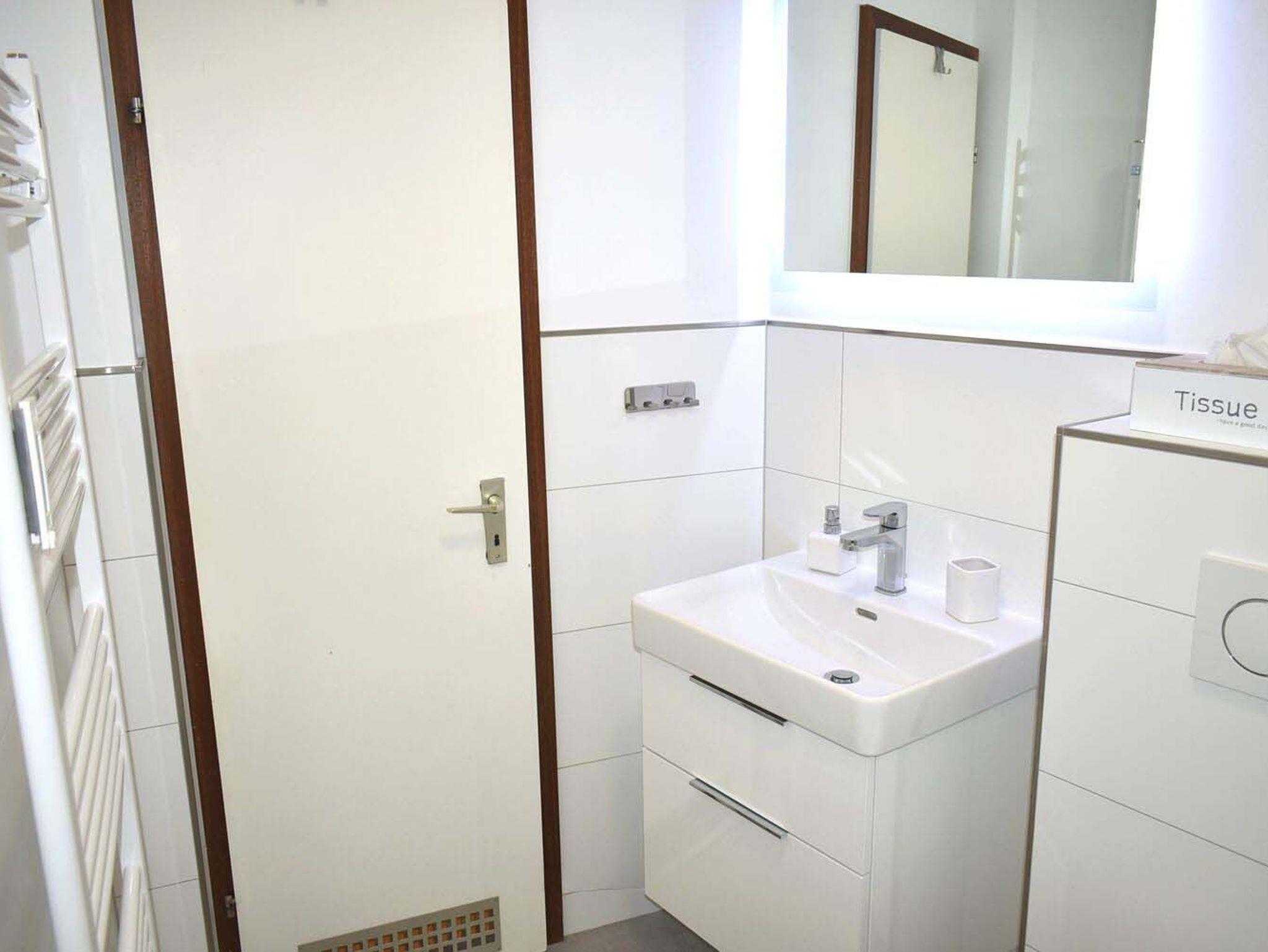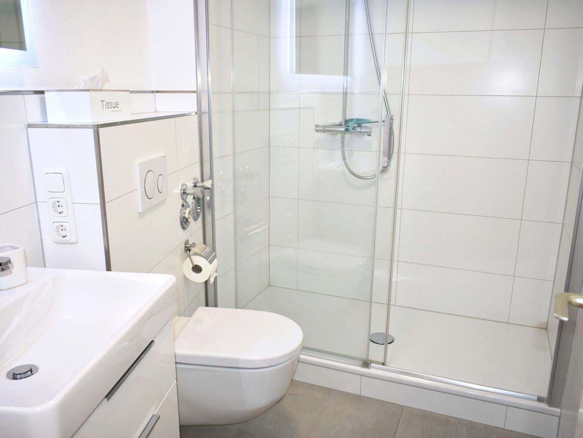 Bad 1: Bad gefliest, Duschkabine, Regendusche, Spiegel, Waschtisch mit Unterschrank, WC