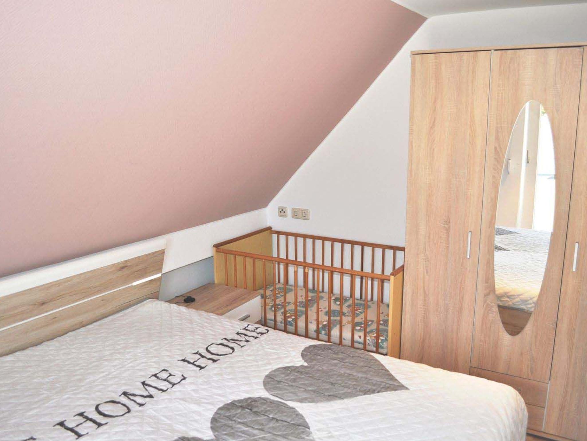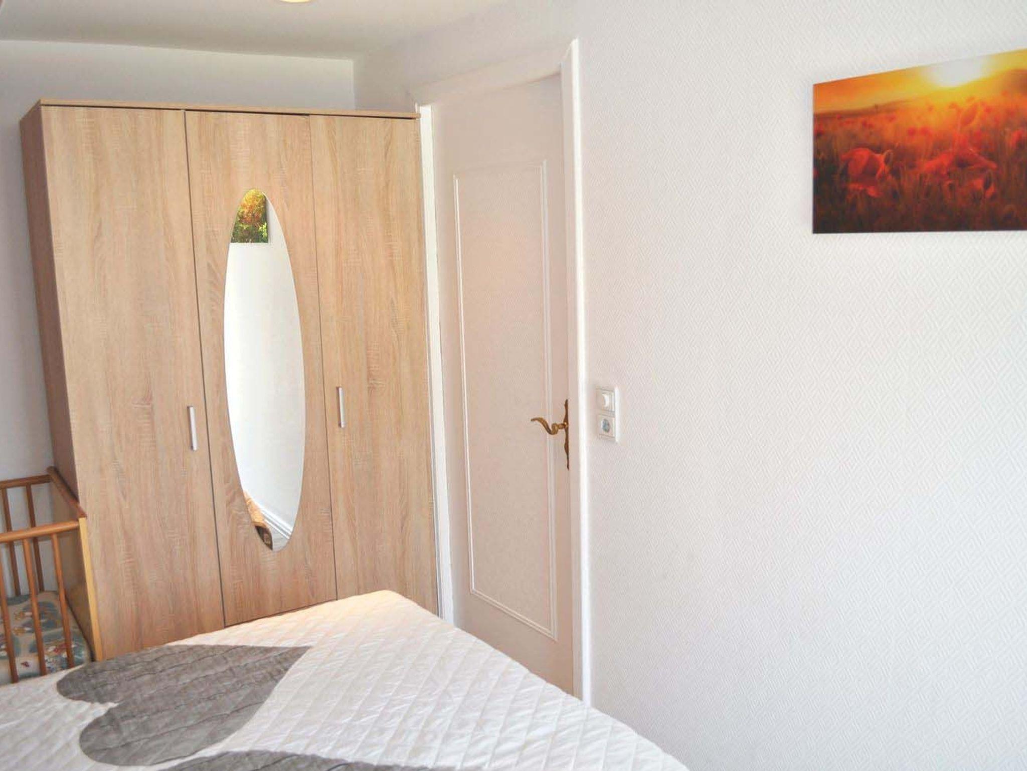 Schlafzimmer 1: 2 Matratzen, 2 Nachttische, Aussenrollladen vor der Terrassentür, Doppelbett 2,00 x 1,80 m, Kinderbett inkl., Kleiderschrank, Spiegel