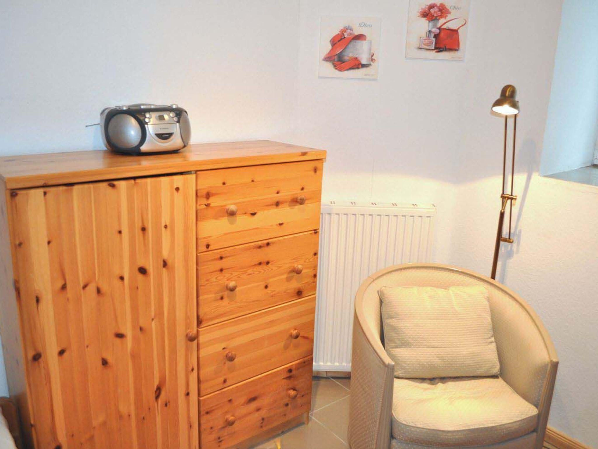 Schlafzimmer 2: 2 Kommoden, Bügelbrett, CD-Stereoanlage, Einzelbett 2,00 x 0,90 m, Sessel, Stehlampe, Verdunklungsgardinen, Verdunklungsplissee