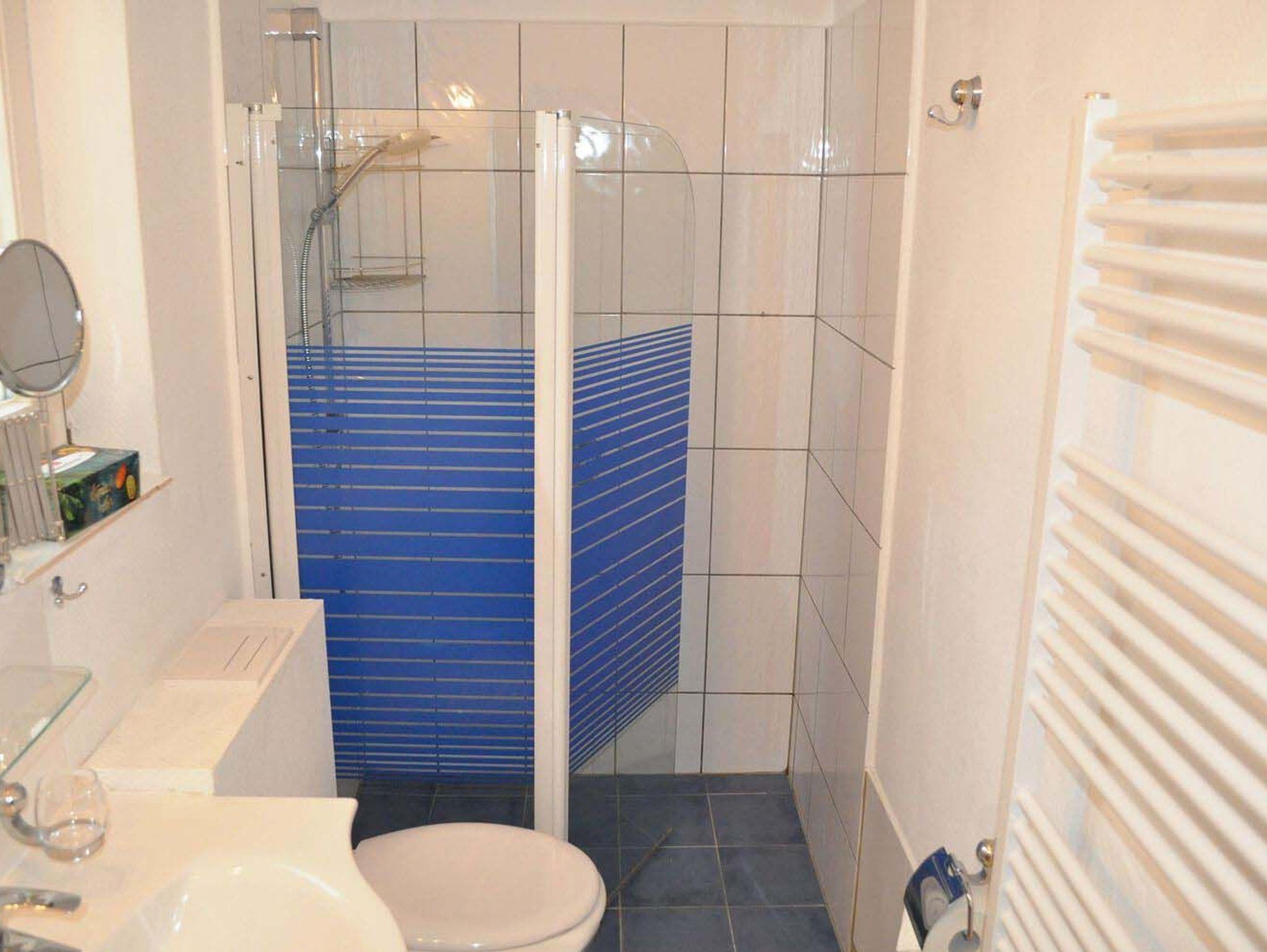 Bad 1: Dusche bodengleich, Duschkabine, Fön, Kosmetikspiegel, Spiegel, Waschtisch mit Unterschrank, WC