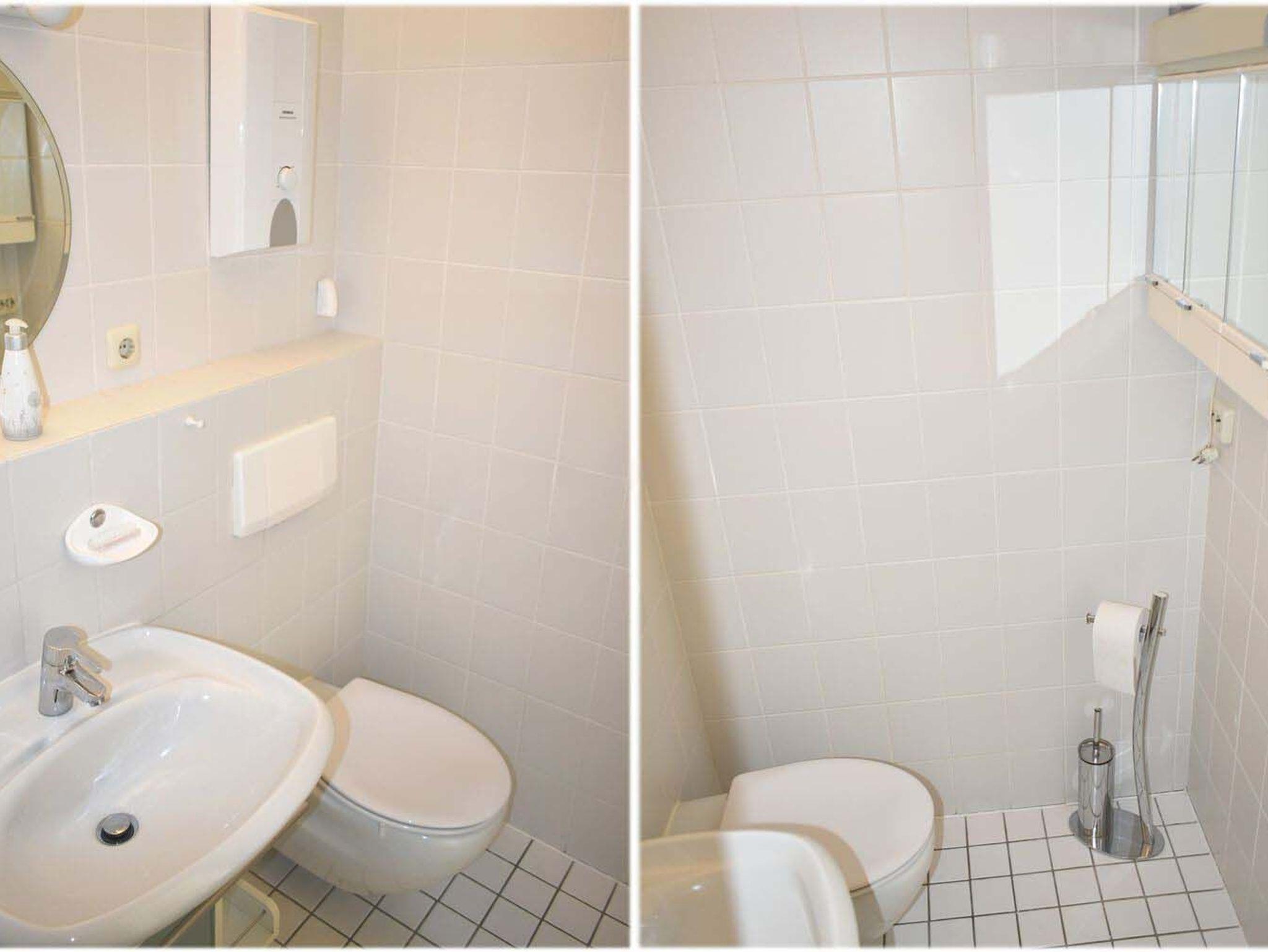 Bad 1: Dusche, Duschkabine, E-Heizung, Spiegel, Spiegelschrank, Waschbecken, WC