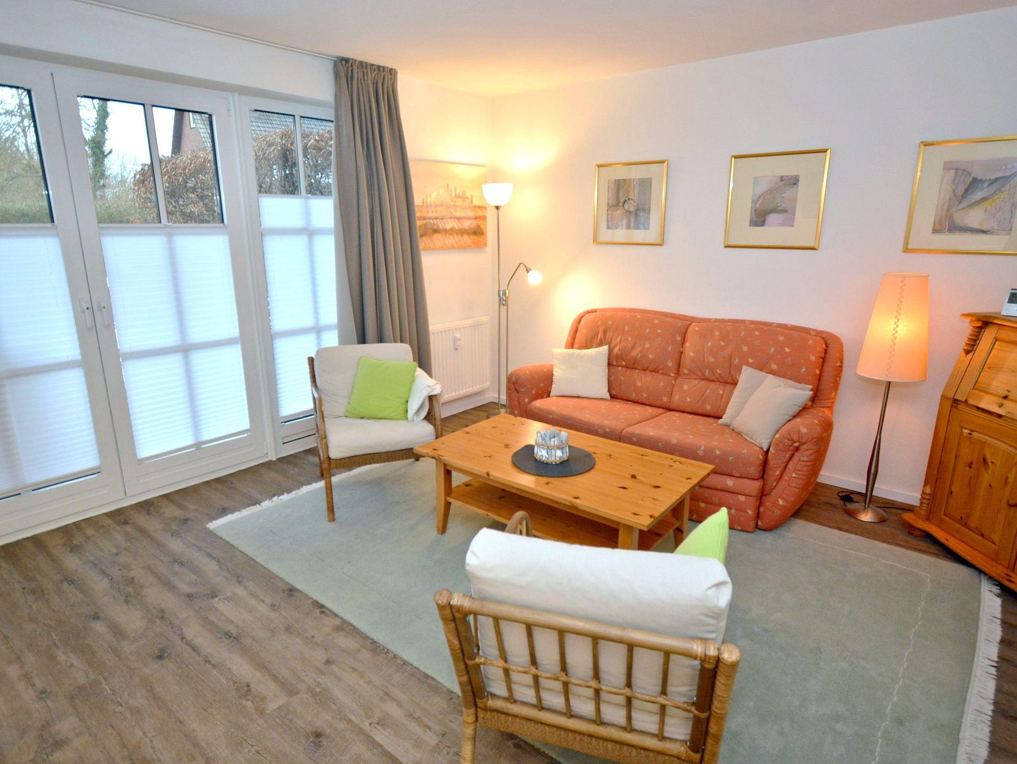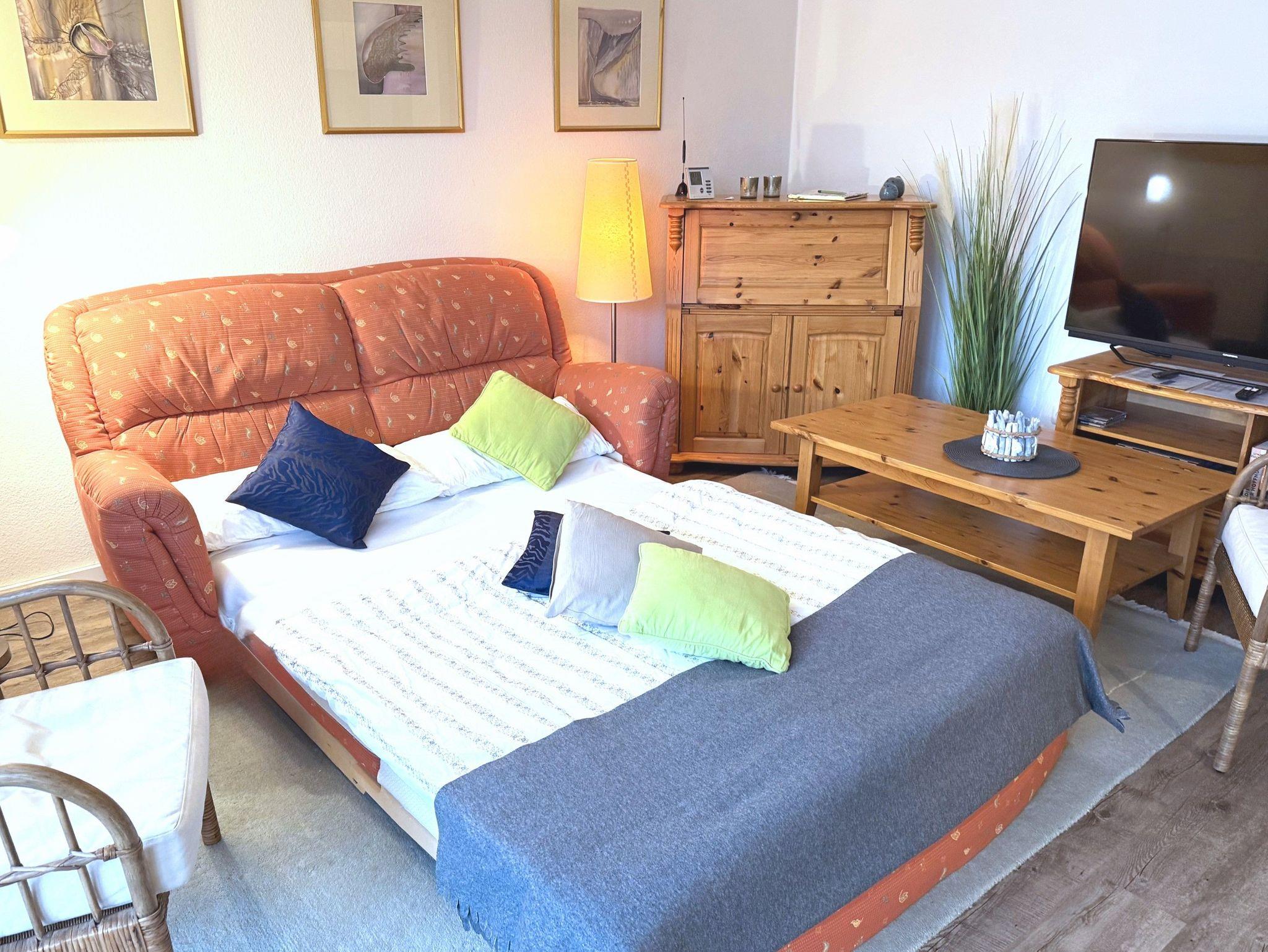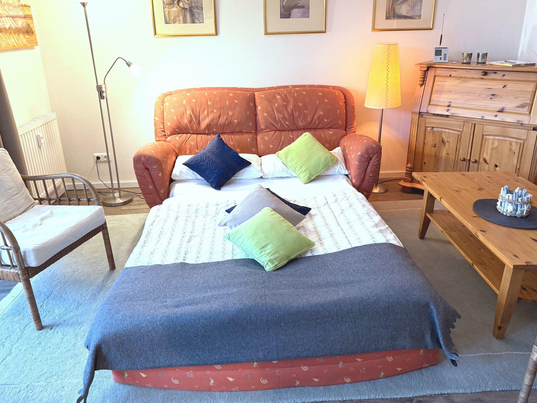 Wohnzimmer: 1 Schlafcouch 2,00 x 1,40 m, 2 Sessel, 2 Stehlampen, 4 Plattenherd mit Backofen mit Dunstabzug, 4 Stühle, Couchtisch, Eierkocher, Einbauküche, Esstisch, Flachbildschirm, Geschirr, Handmixer, Kabel-TV, Kaffeemaschine, Kochtöpfe, Kühlschrank mit 3* Gefrierfach, Mikrowelle, Sekretär, Senseo Kaffeemaschine, Spülmaschine, Stereoanlage mit CD-Player und USB-Anschluss, Toaster, TV-Tisch, Wasserkocher