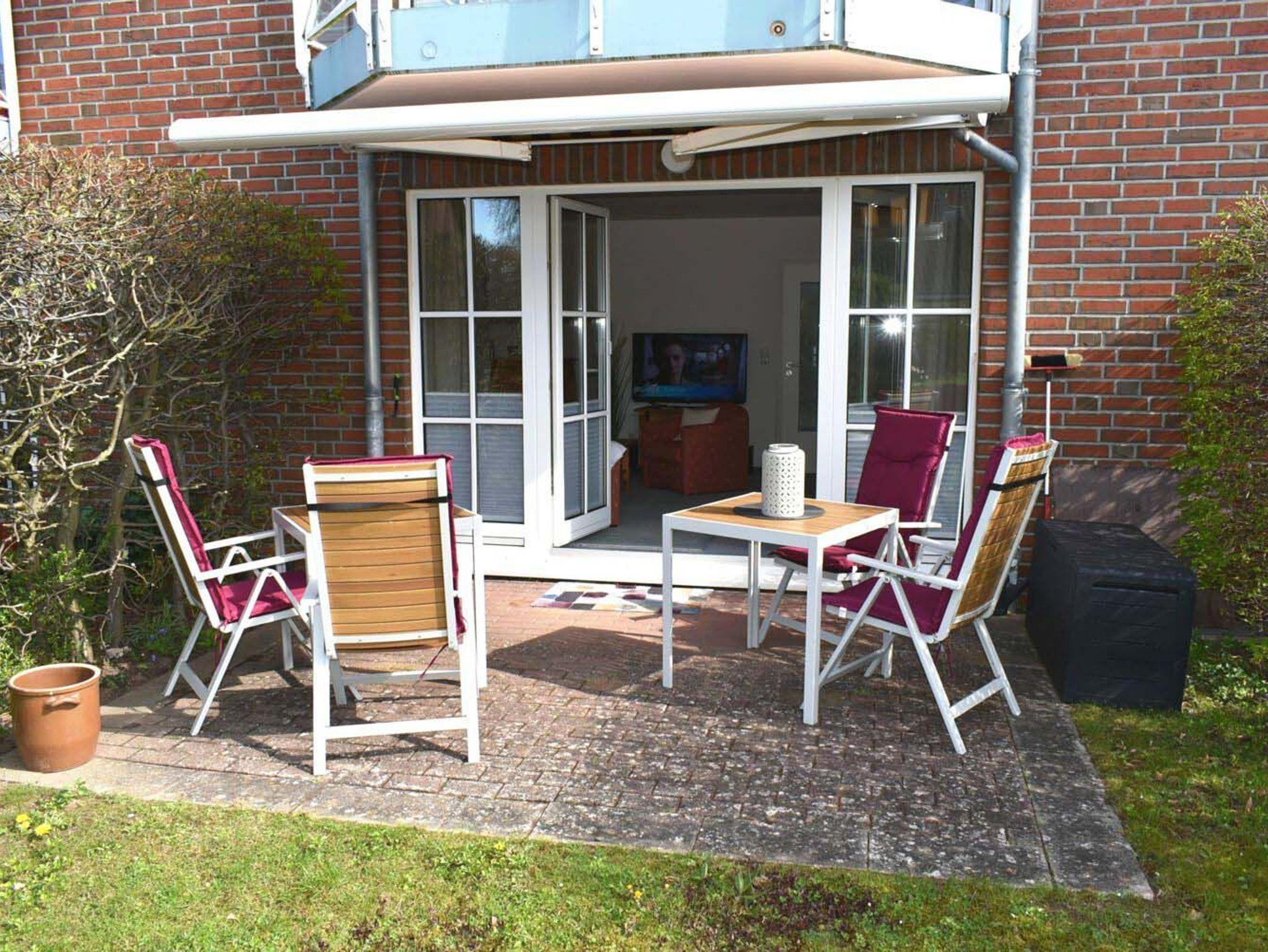 Terrasse: 2 Tische, 4 Stühle, halb überdacht, Markise, Südlage