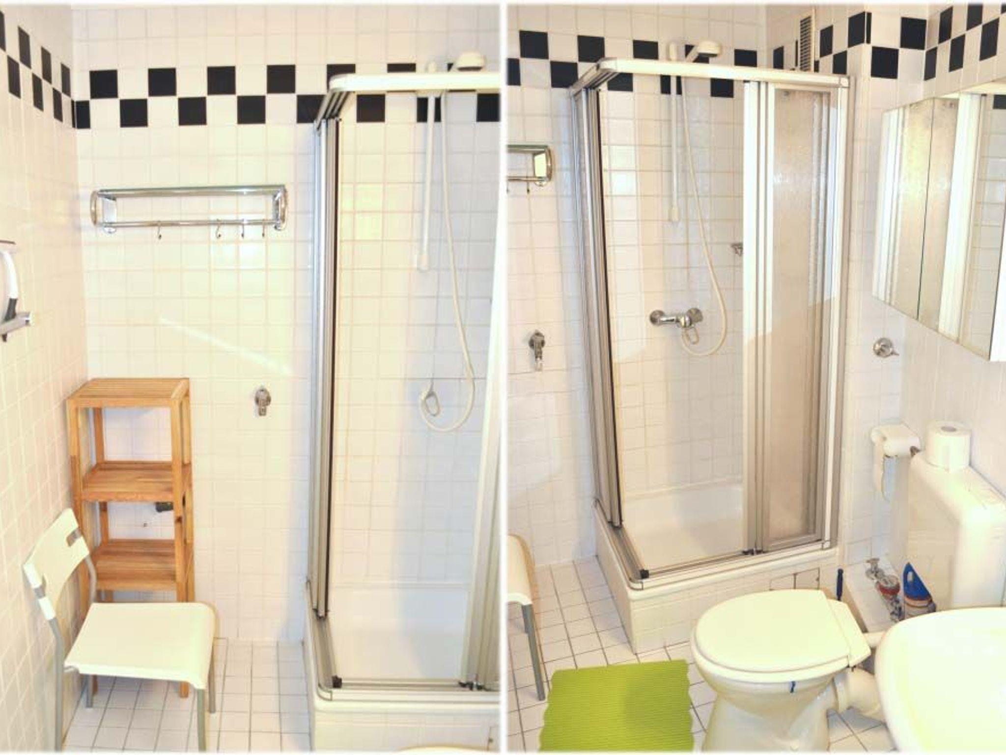 Bad 1: Dusche, Duschkabine, Regal, Spiegel, Spiegelschrank, Stuhl, Waschbecken, WC